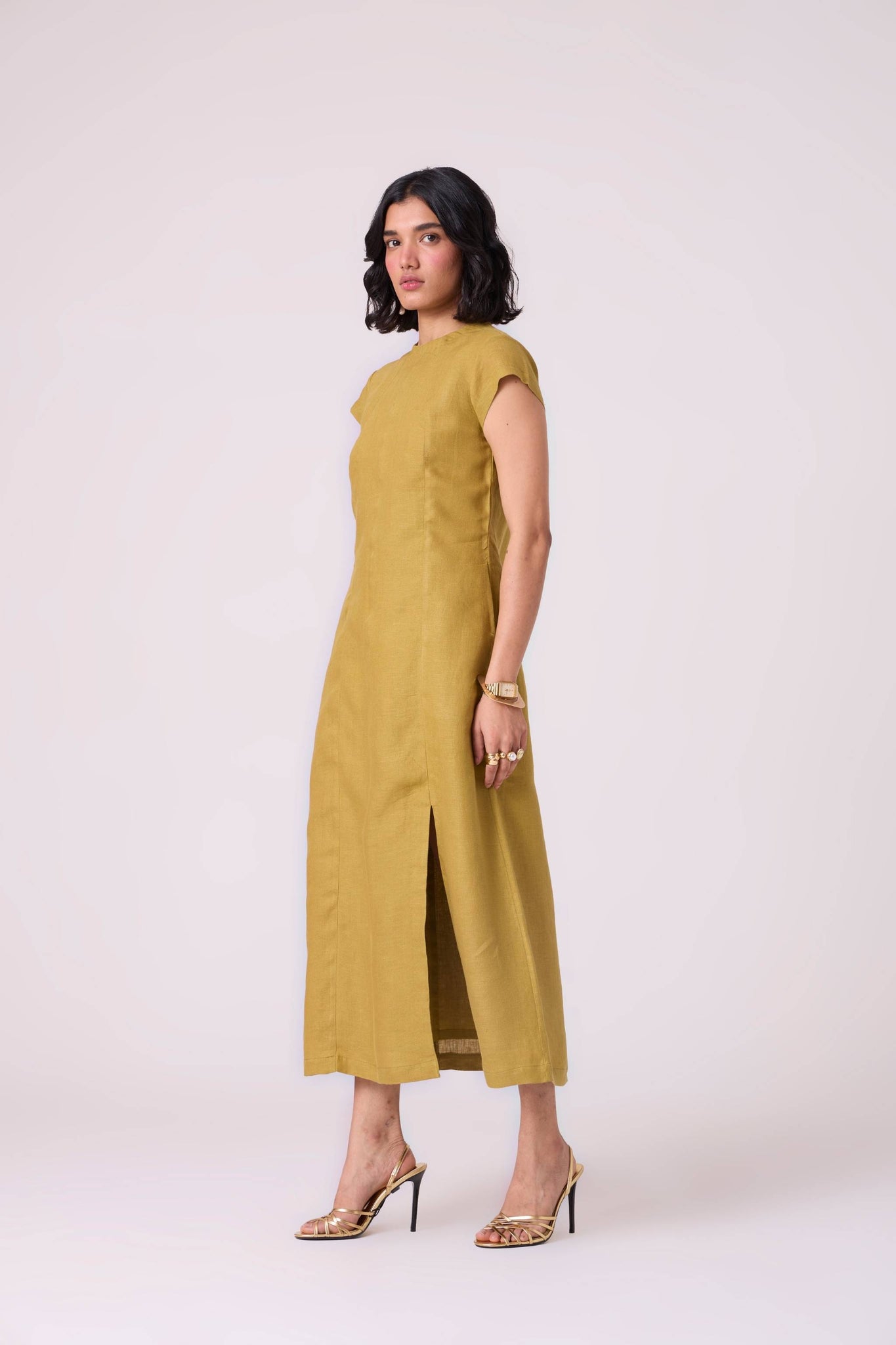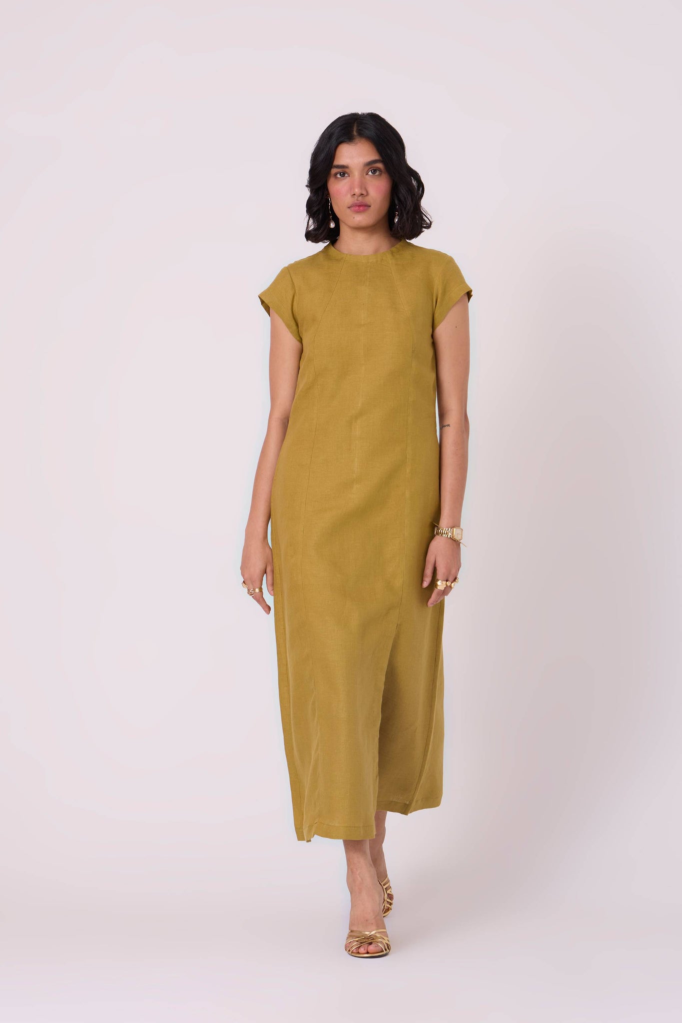 A midi dress shaped through precise panelling for a clean, elongated line. The raised neck and short sleeves lend quiet formality, making it a thoughtful choice for work, gallery visits, and evenings out.