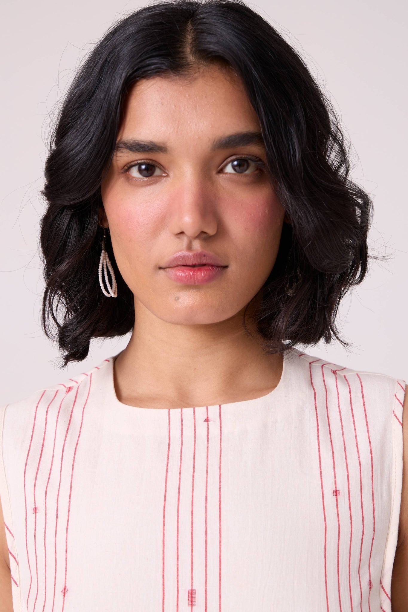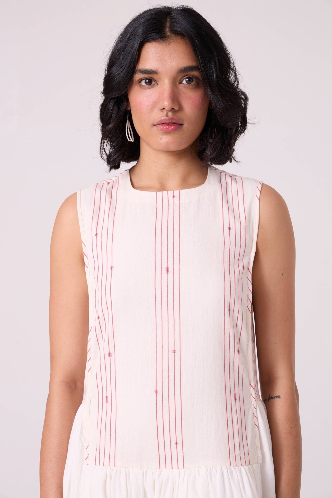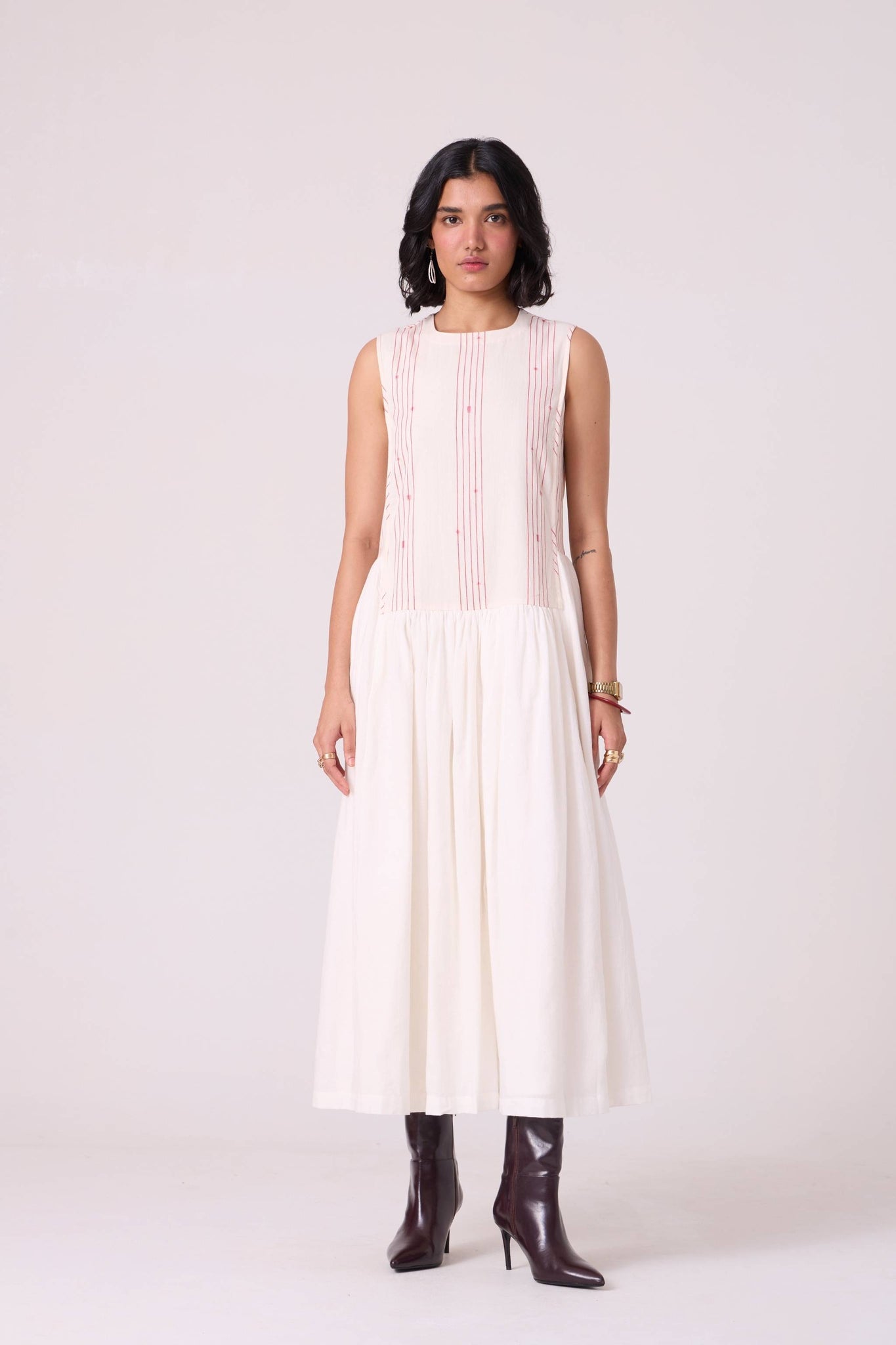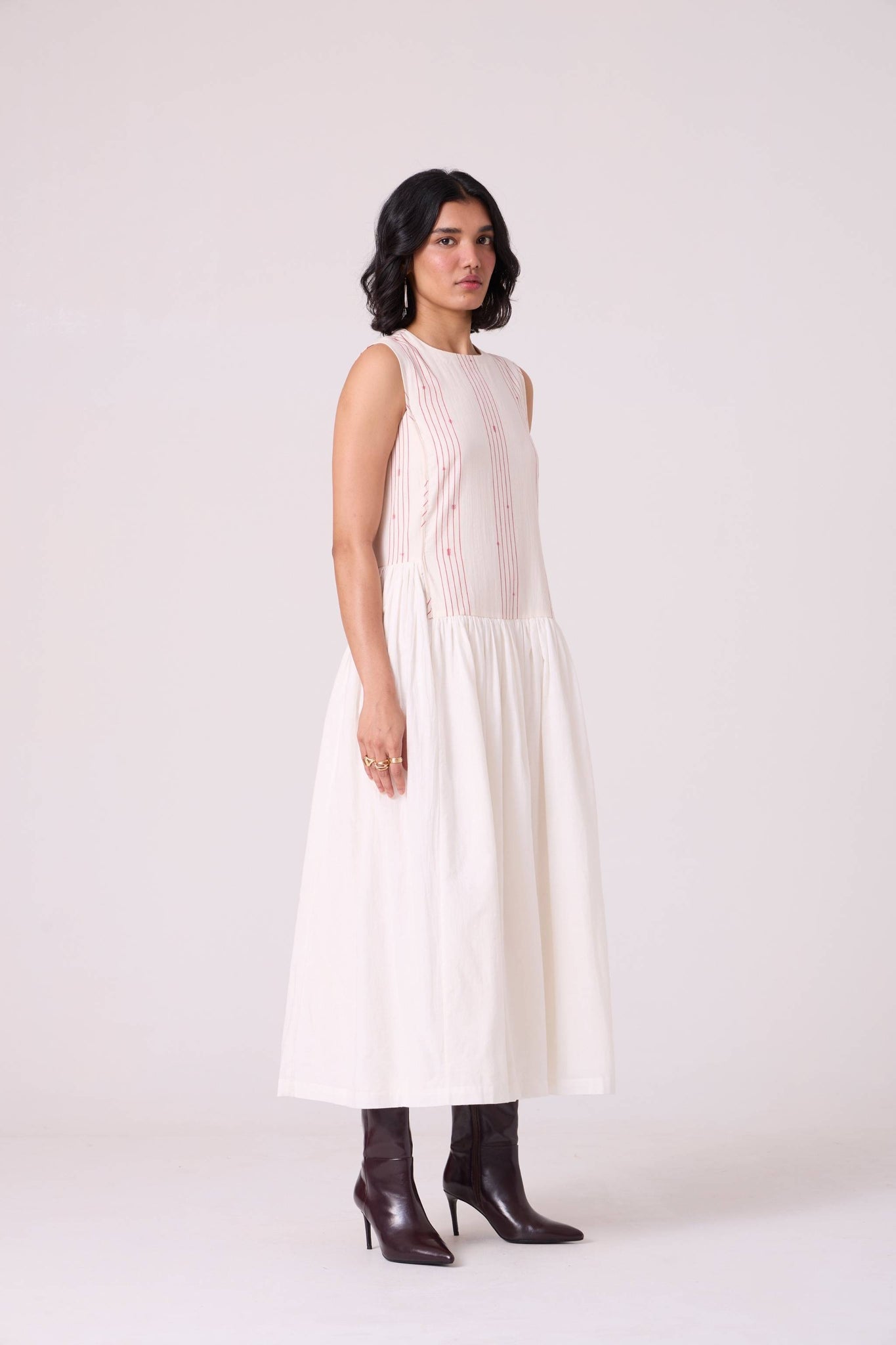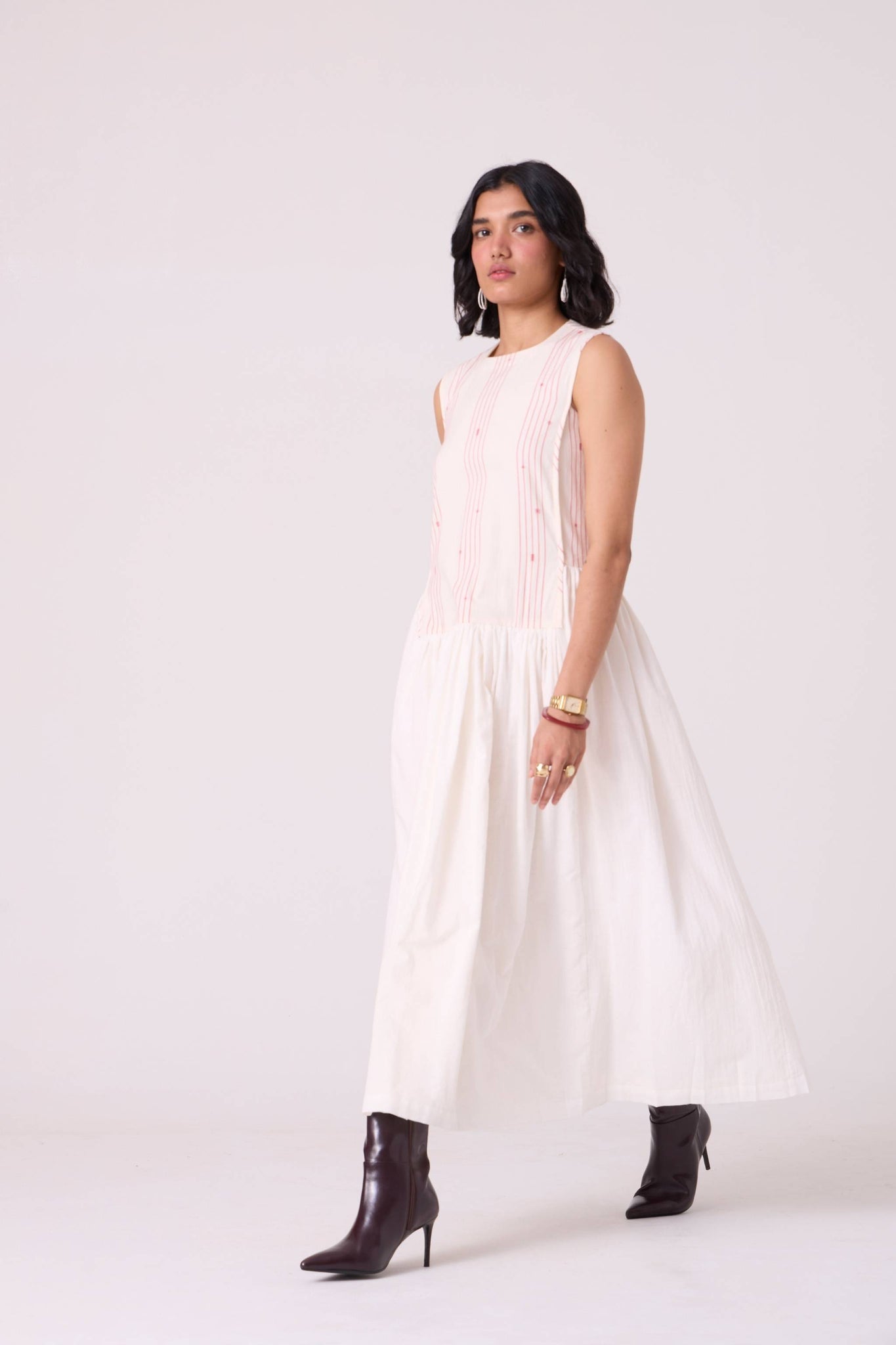 A maxi silhouette with sculpted ease. The handwoven Jamdhani bodice draws the eye upward, while subtle gathers and a lifted waistline elongate the figure. Confident yet effortless - suited to dinners, celebrations, and evenings that invite quiet distinction.
