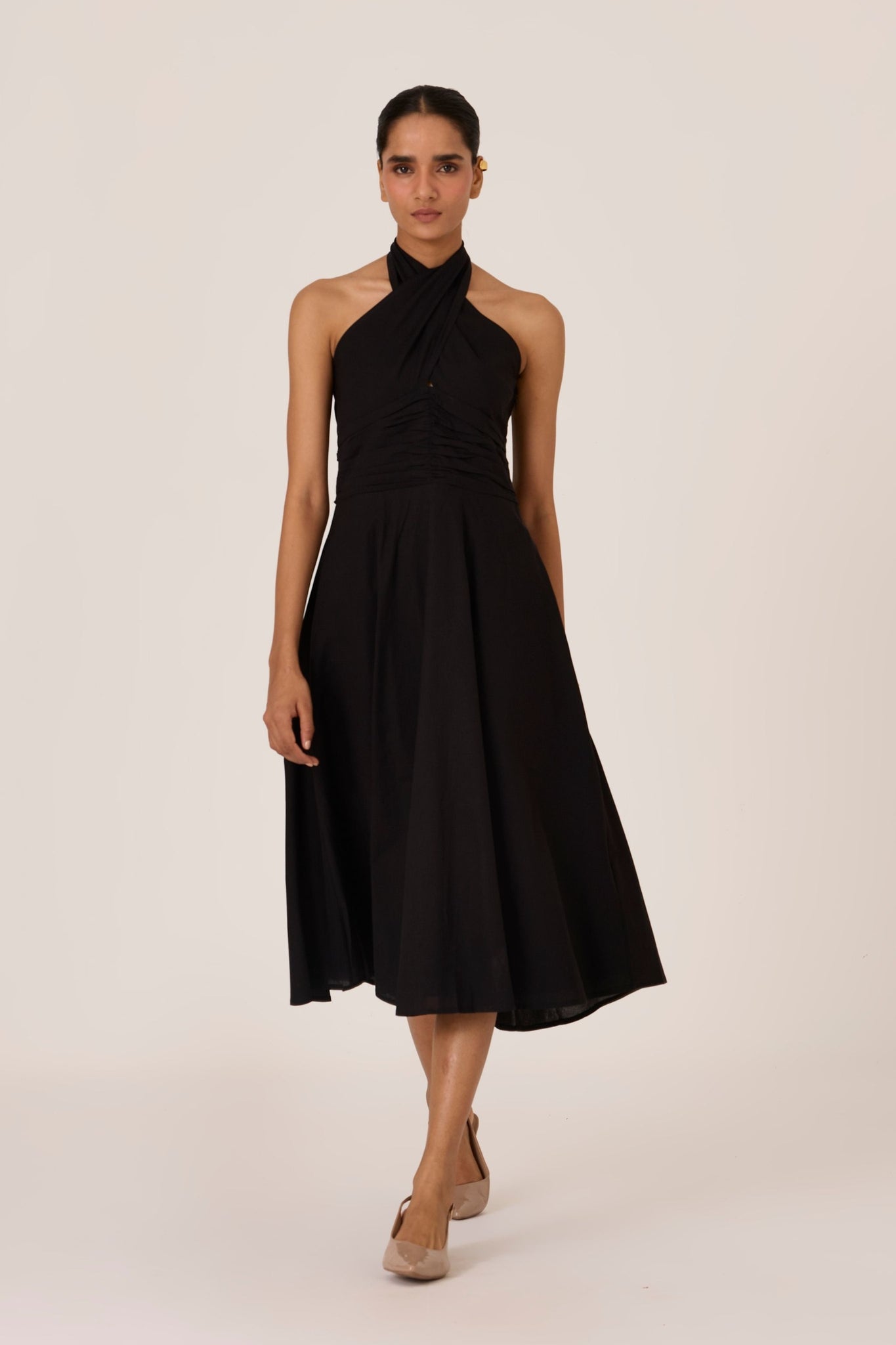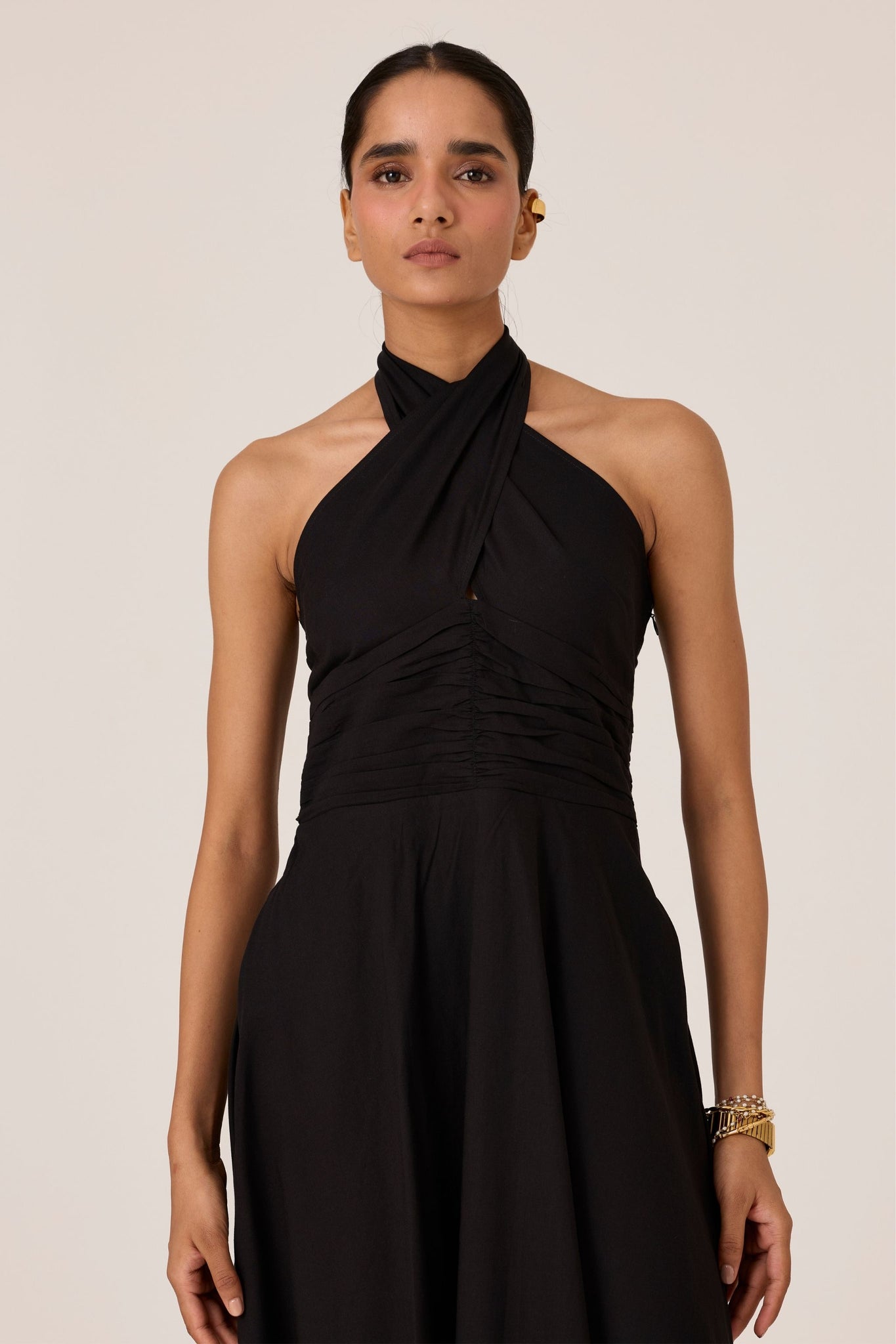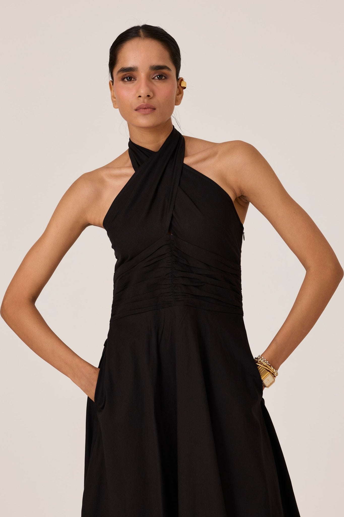The ultimate black dress for a season of RSVPs. Crossover halter neck. Ruched at the waist for a comfortably cinched shape. Side zip fastening. In-seam pockets. This dress is fully lined.