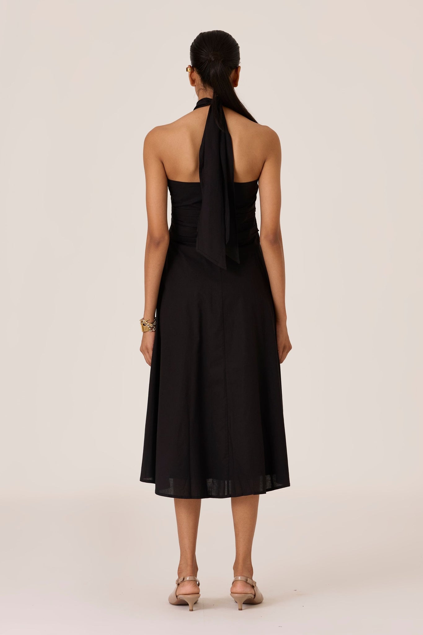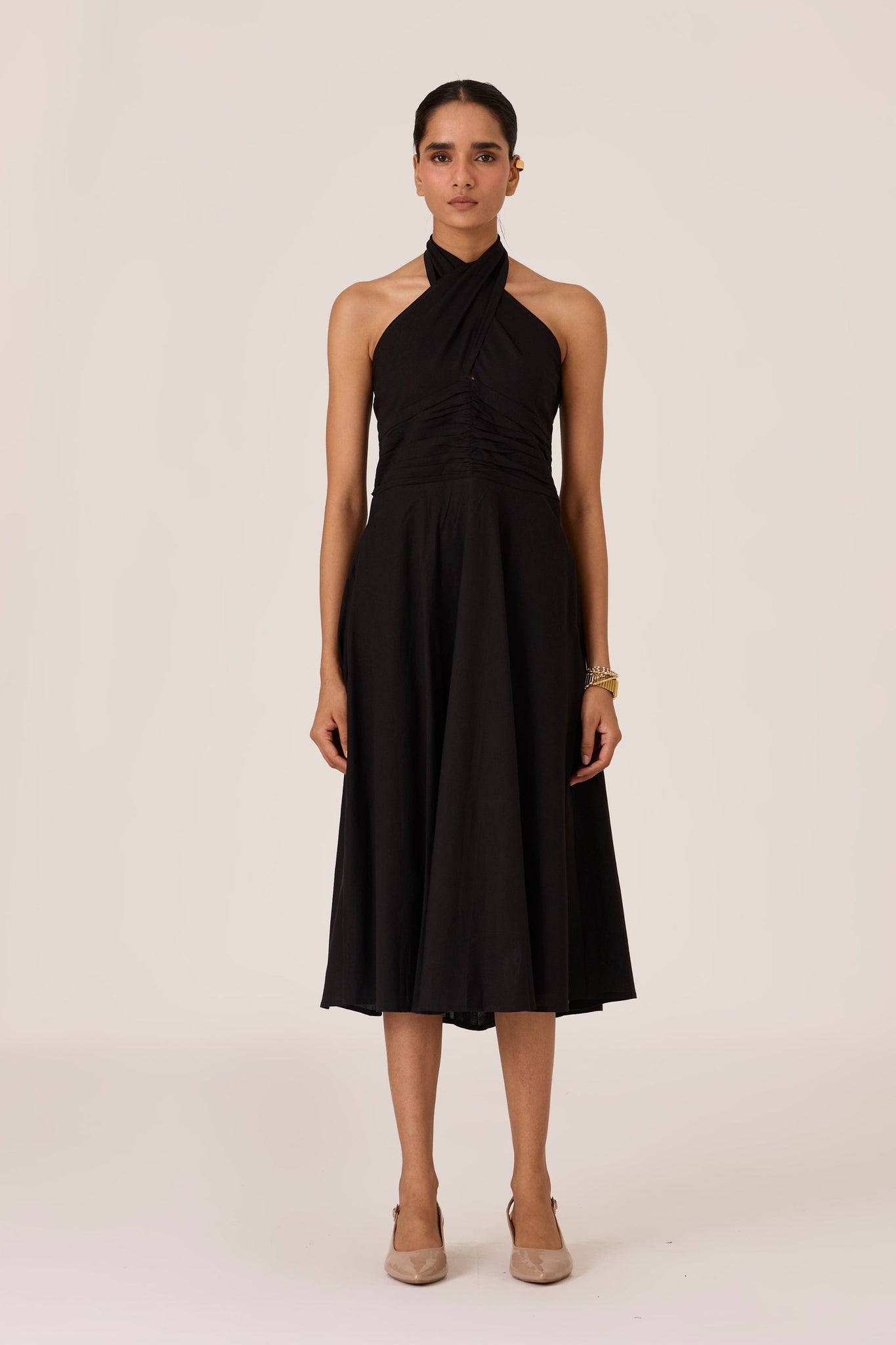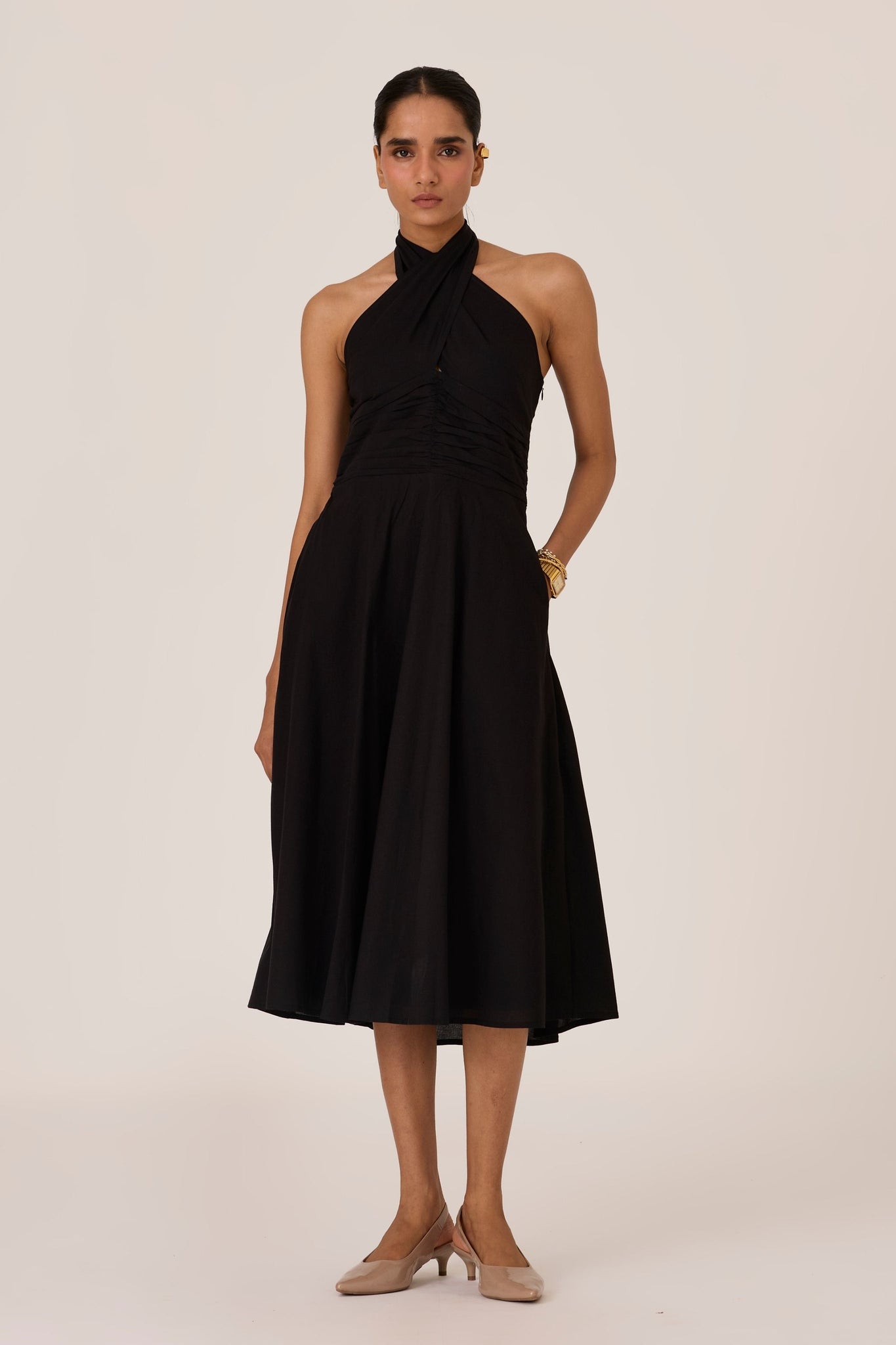 The ultimate black dress for a season of RSVPs. Crossover halter neck. Ruched at the waist for a comfortably cinched shape. Side zip fastening. In-seam pockets. This dress is fully lined.