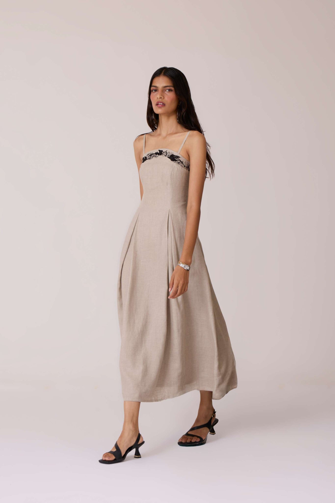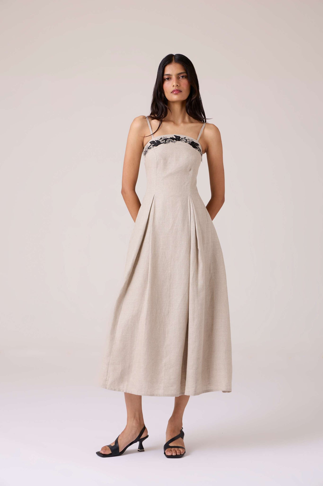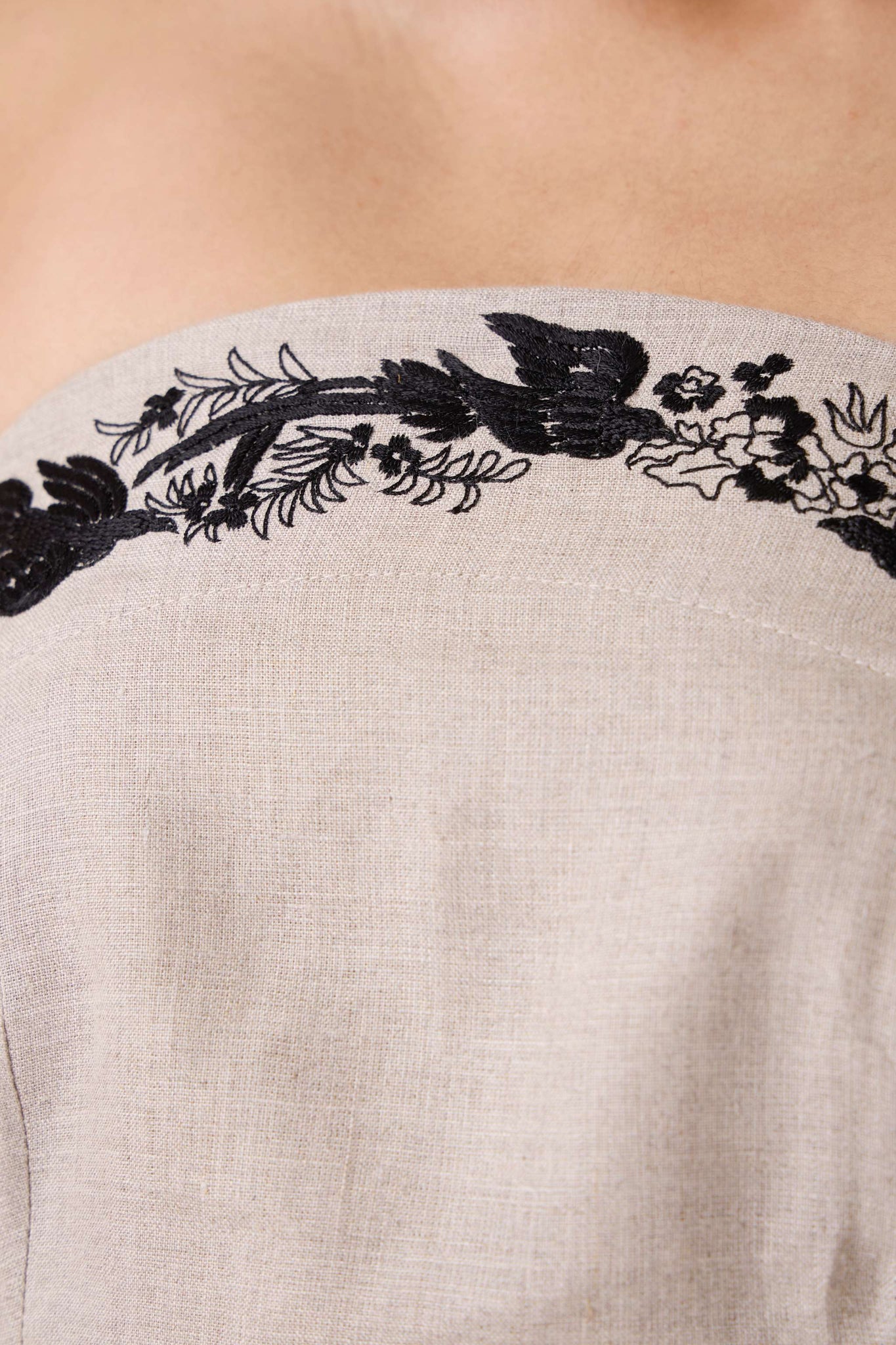 Sculpted yet easy. A tube dress marked by an embroidered neckline, smocked back, and detachable straps - balancing structure with freedom.