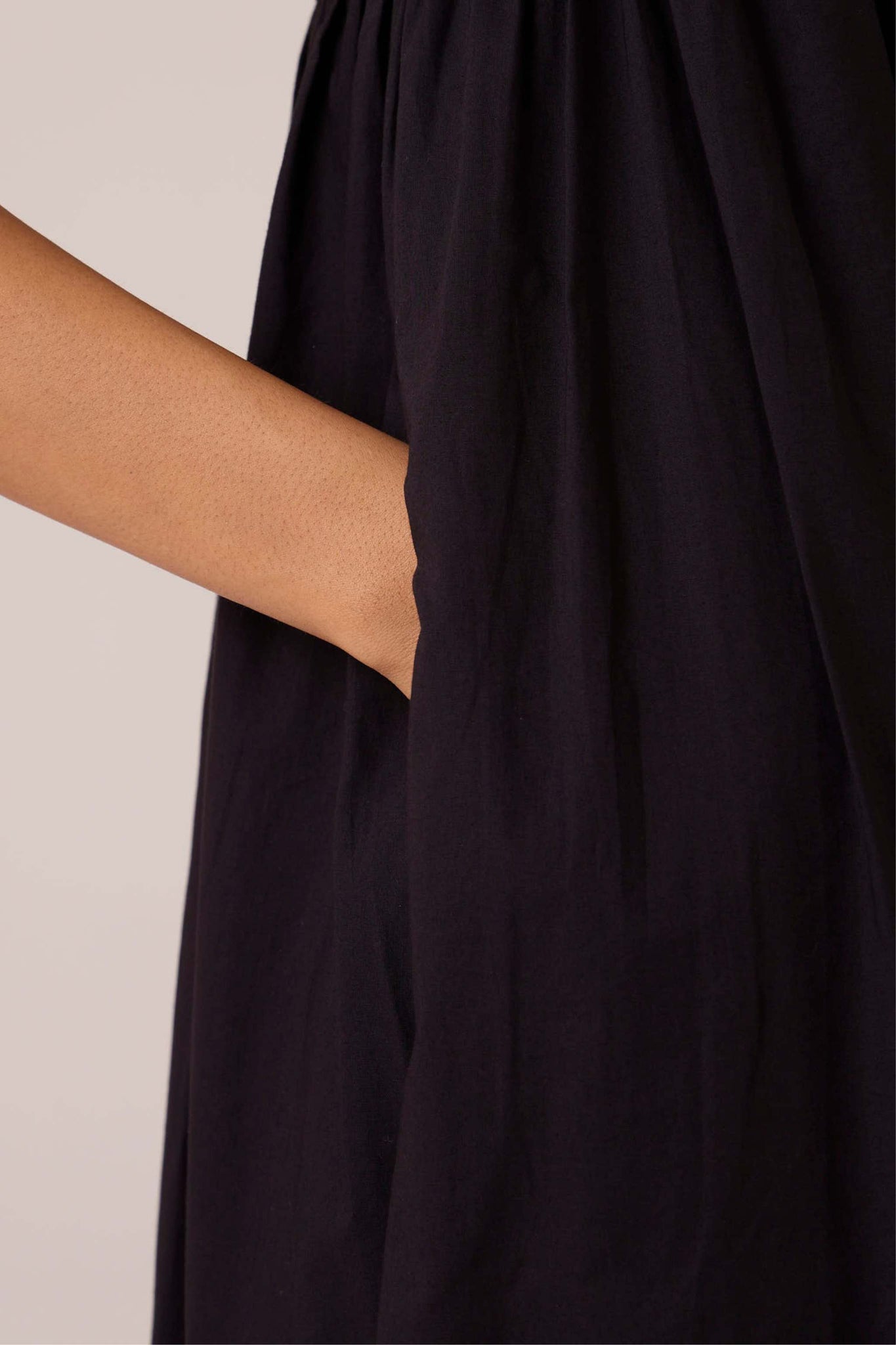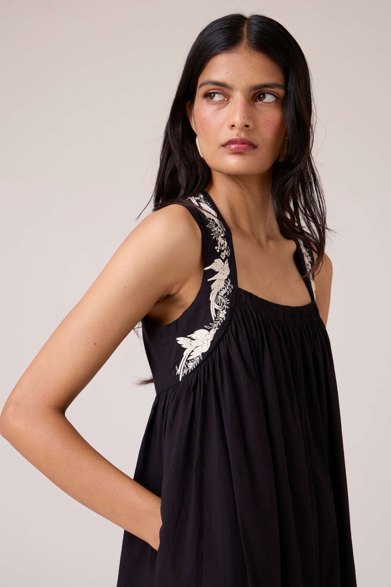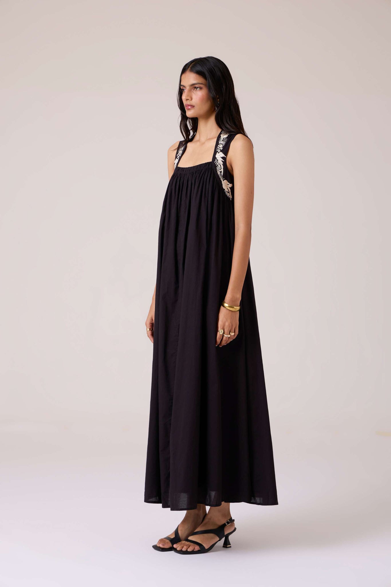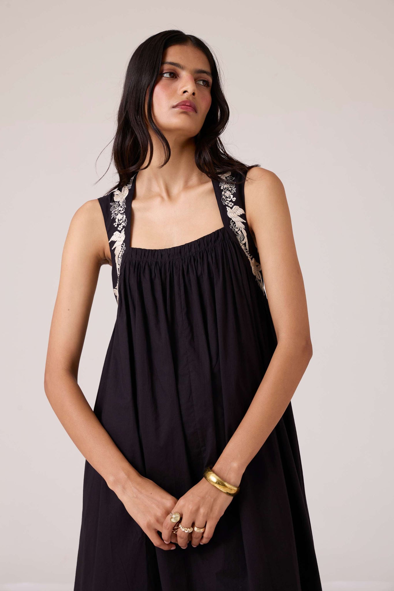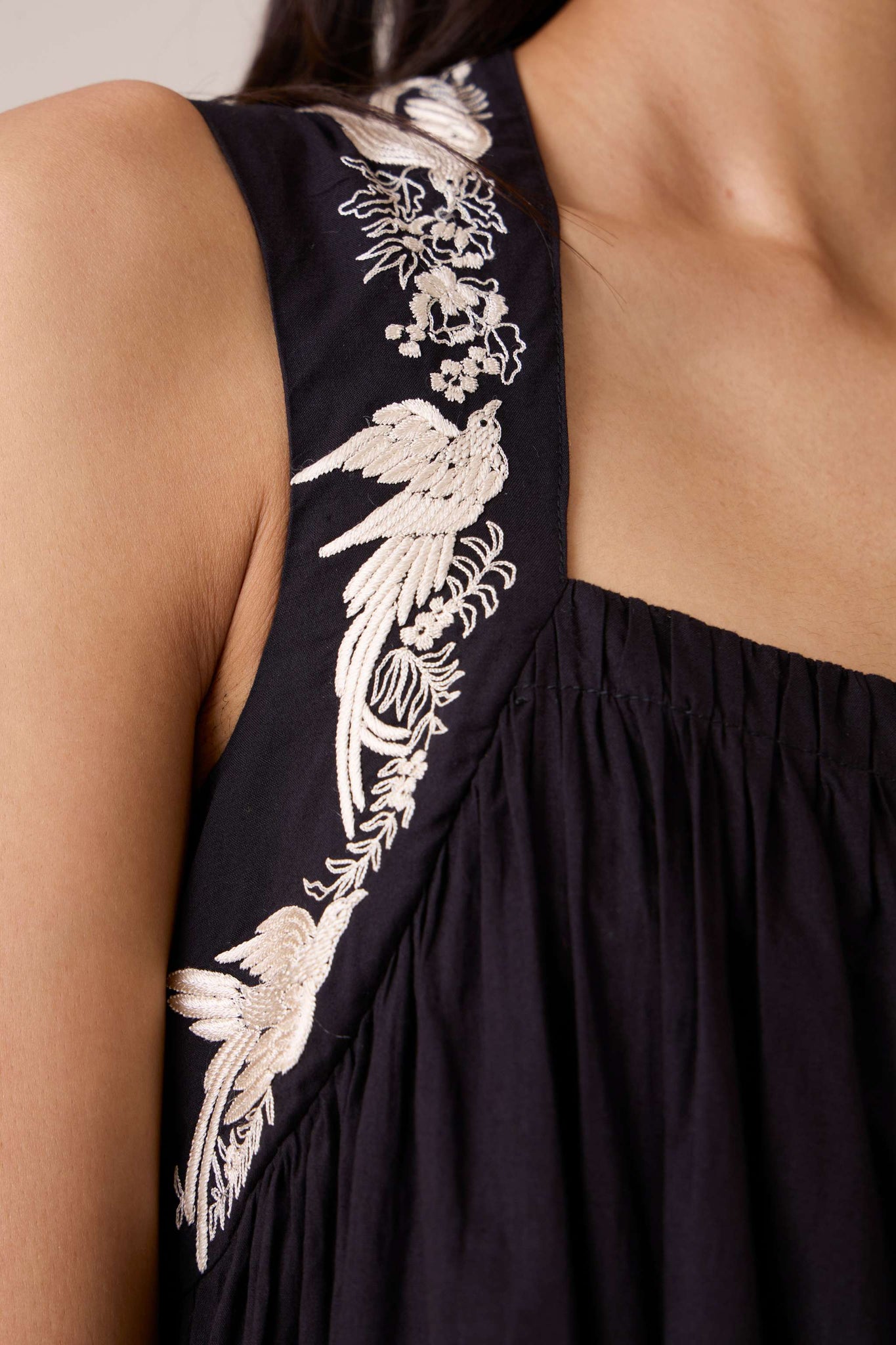 Bold yet restrained. A square neckline framed by embroidered straps, while the cut remains assuredly minimal.