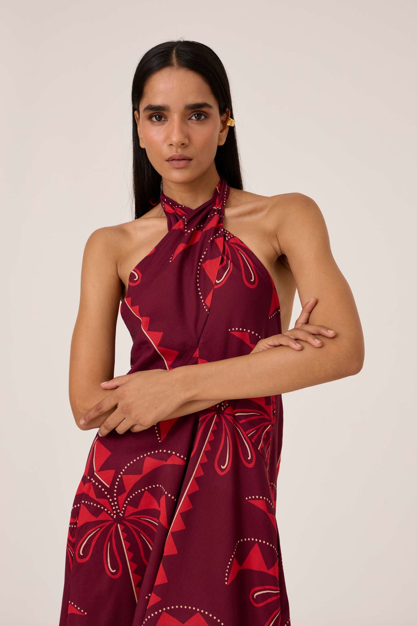 Crossover halter neck with knot fastening at the back. Elasticated back for a perfect fit. Fully lined. In-seam pockets