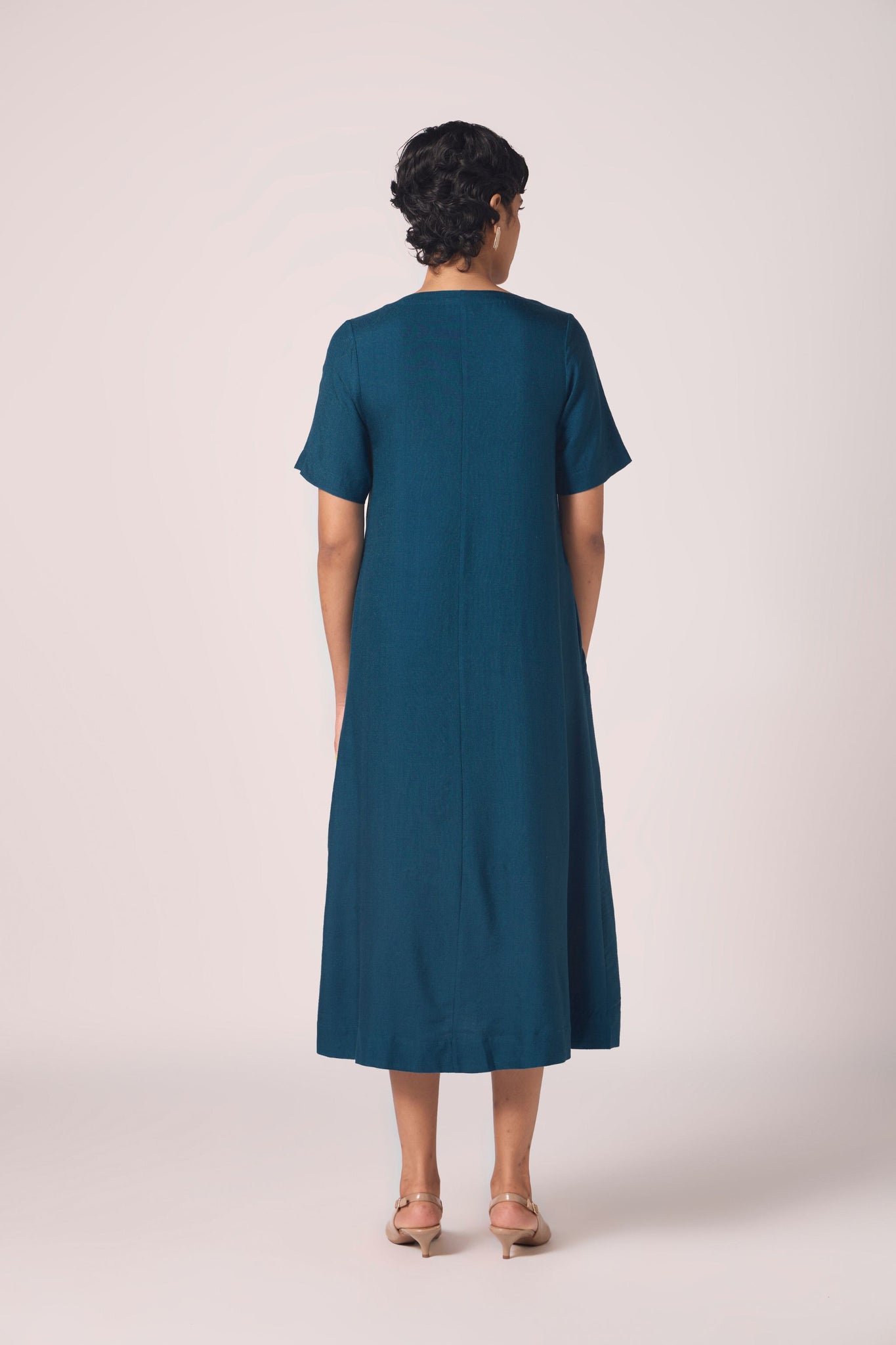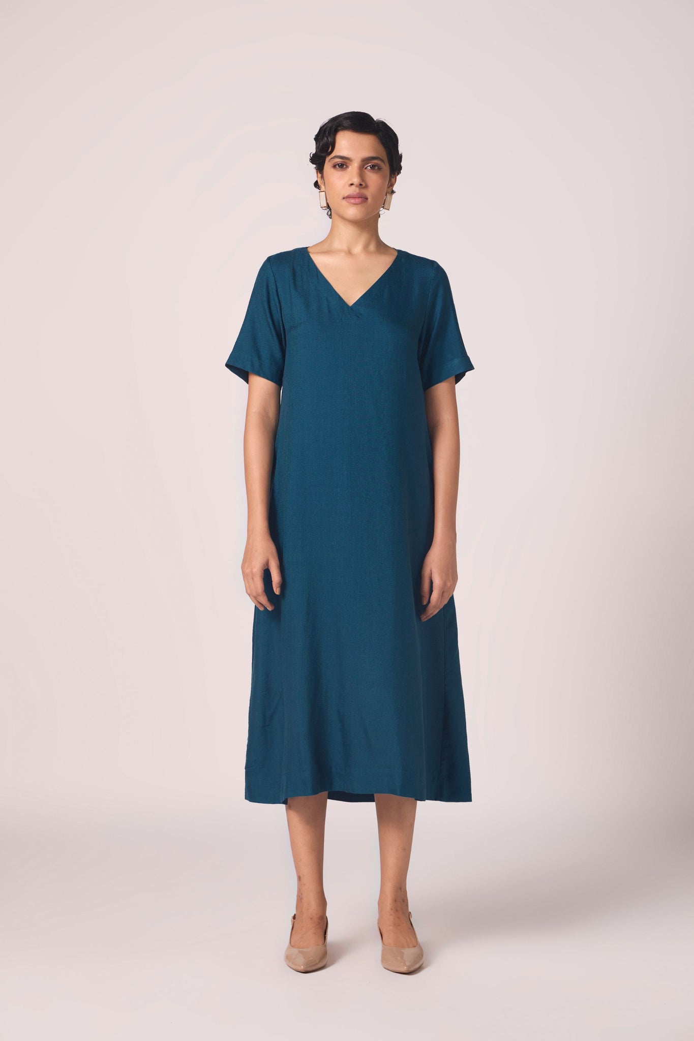 This midi dress frames the neckline with a sharp V, falling into a relaxed tent silhouette and finished with discreet pockets.