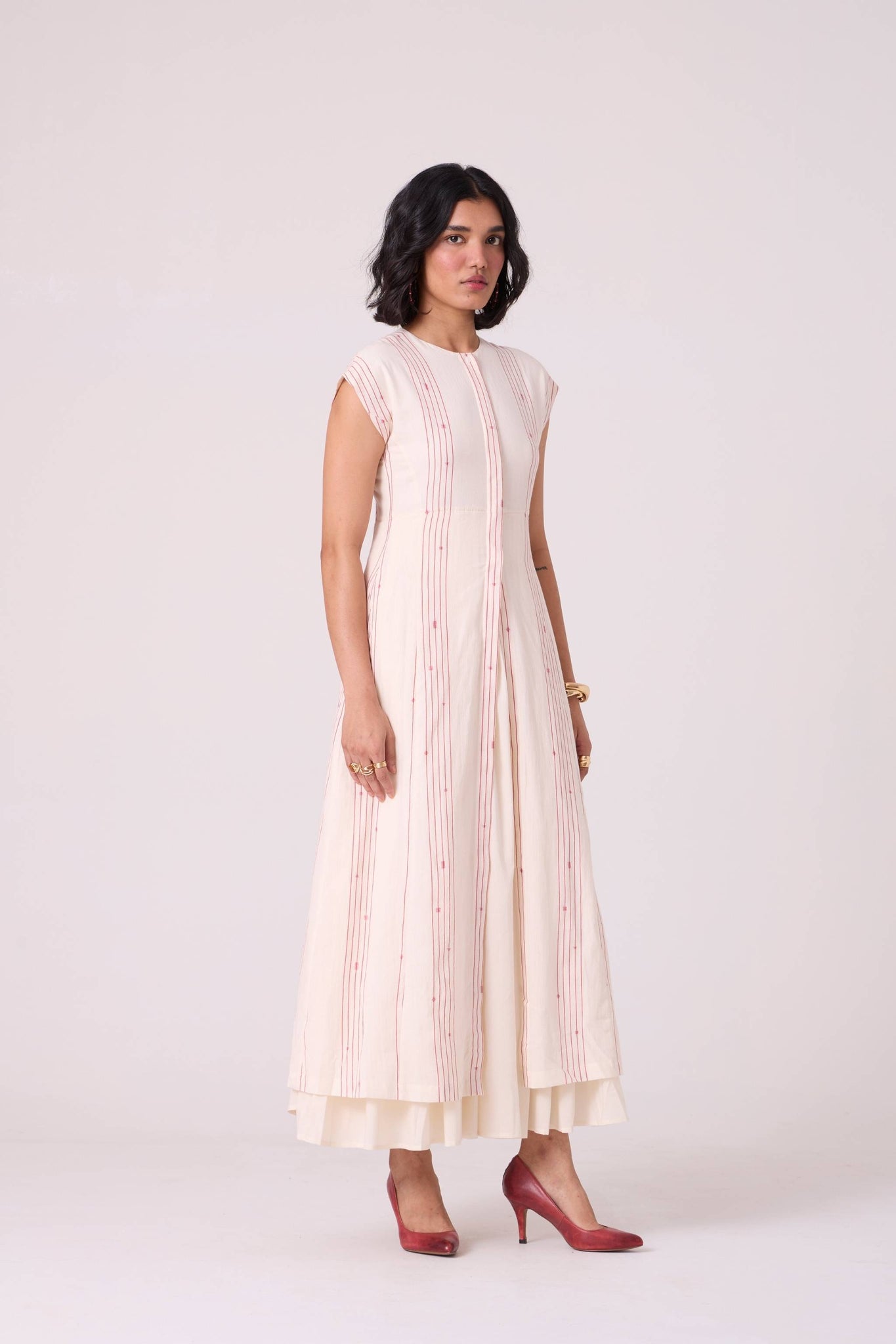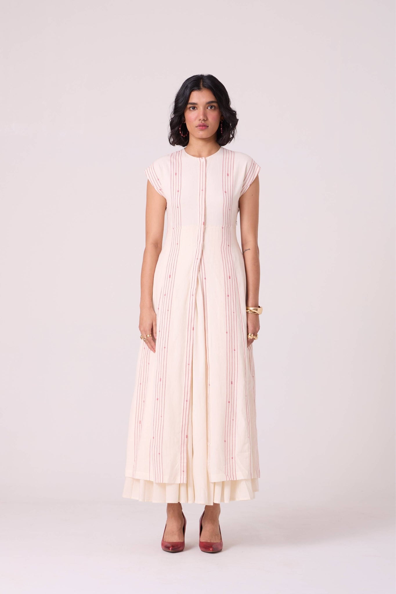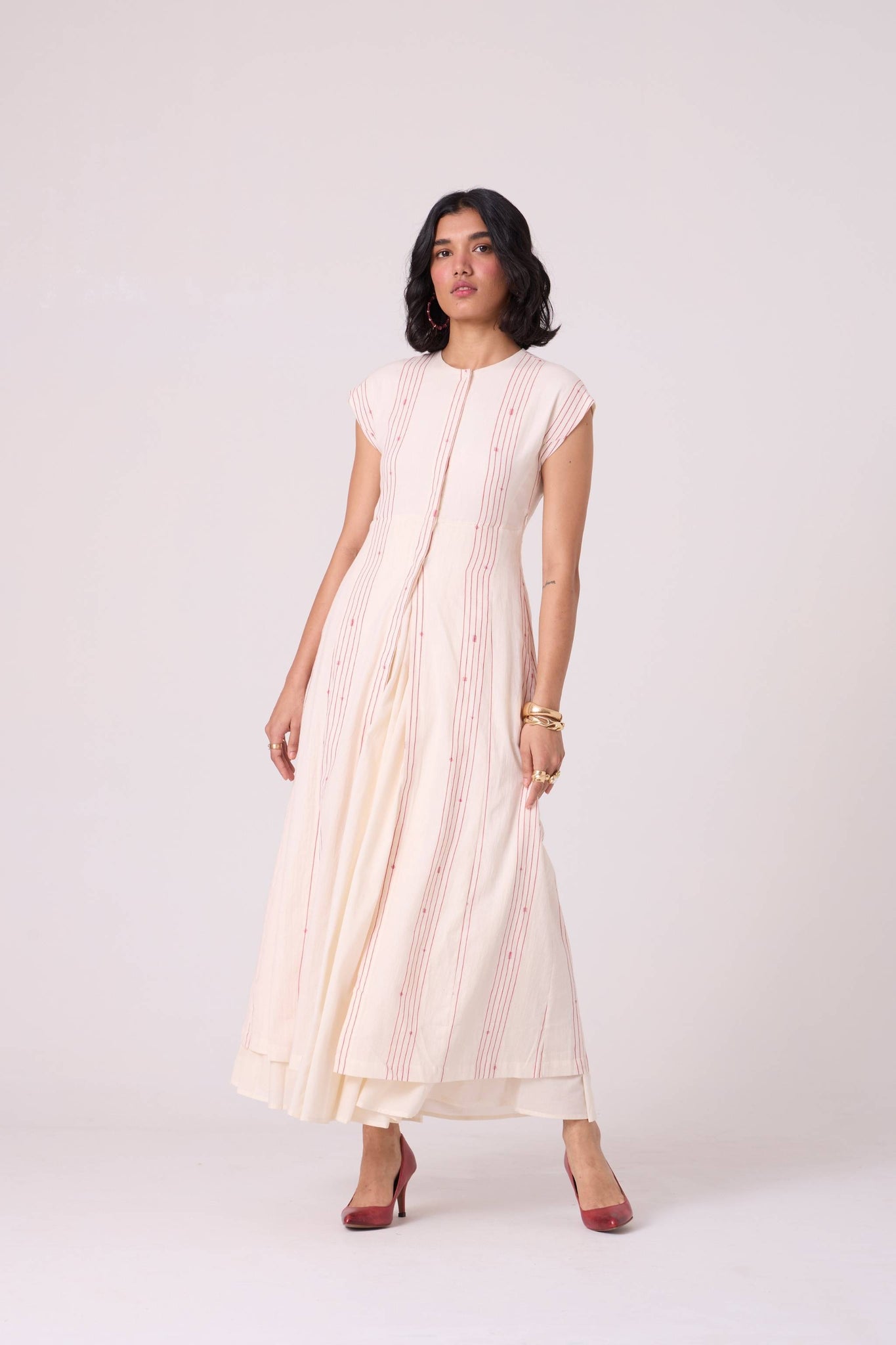 A double-layered maxi that frames the form with quiet structure. The striped outer layer defines the shoulders and neckline, while the softly gathered cotton beneath creates a graceful column through the body. A refined choice for plans that call for understated presence.