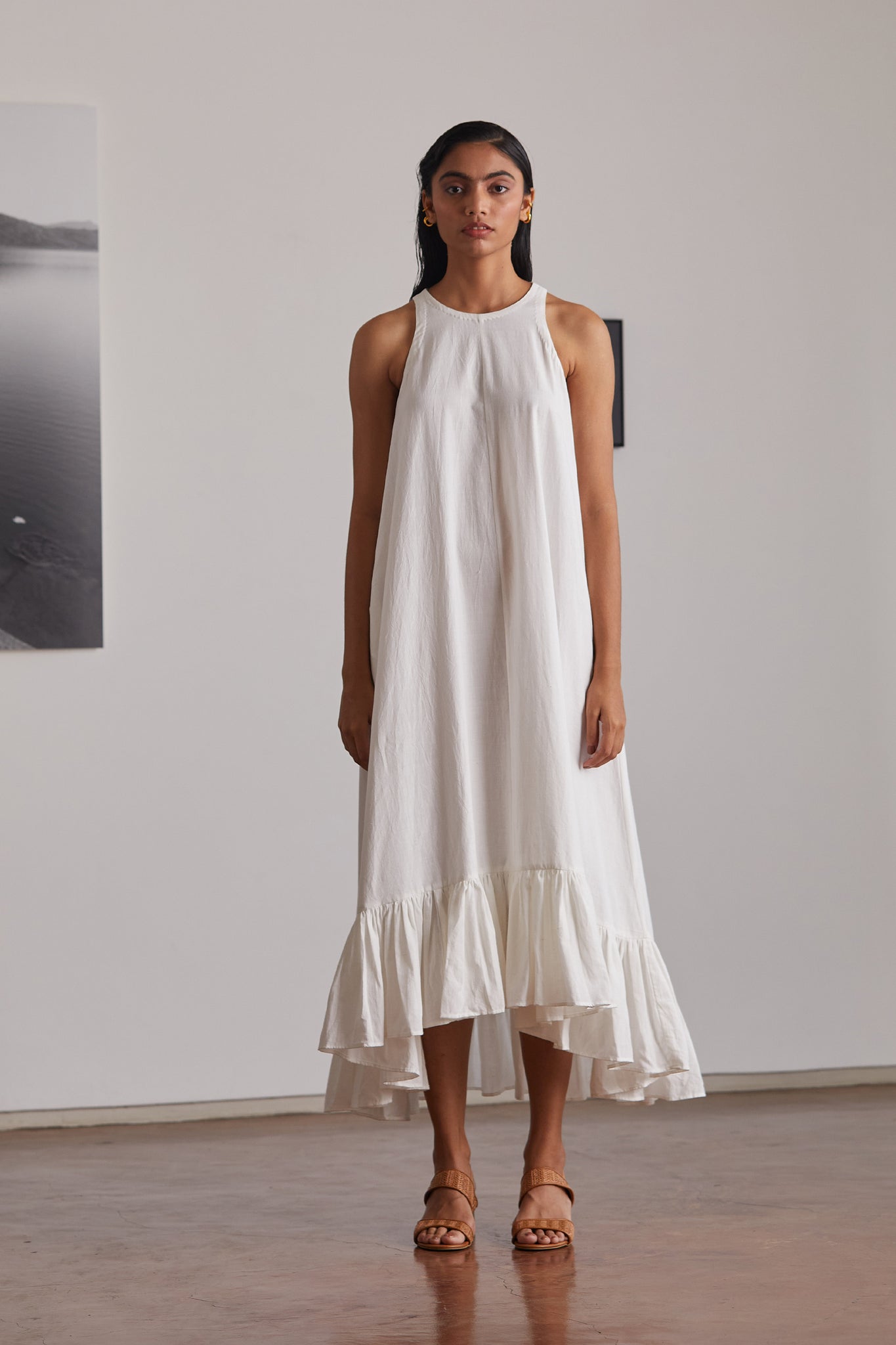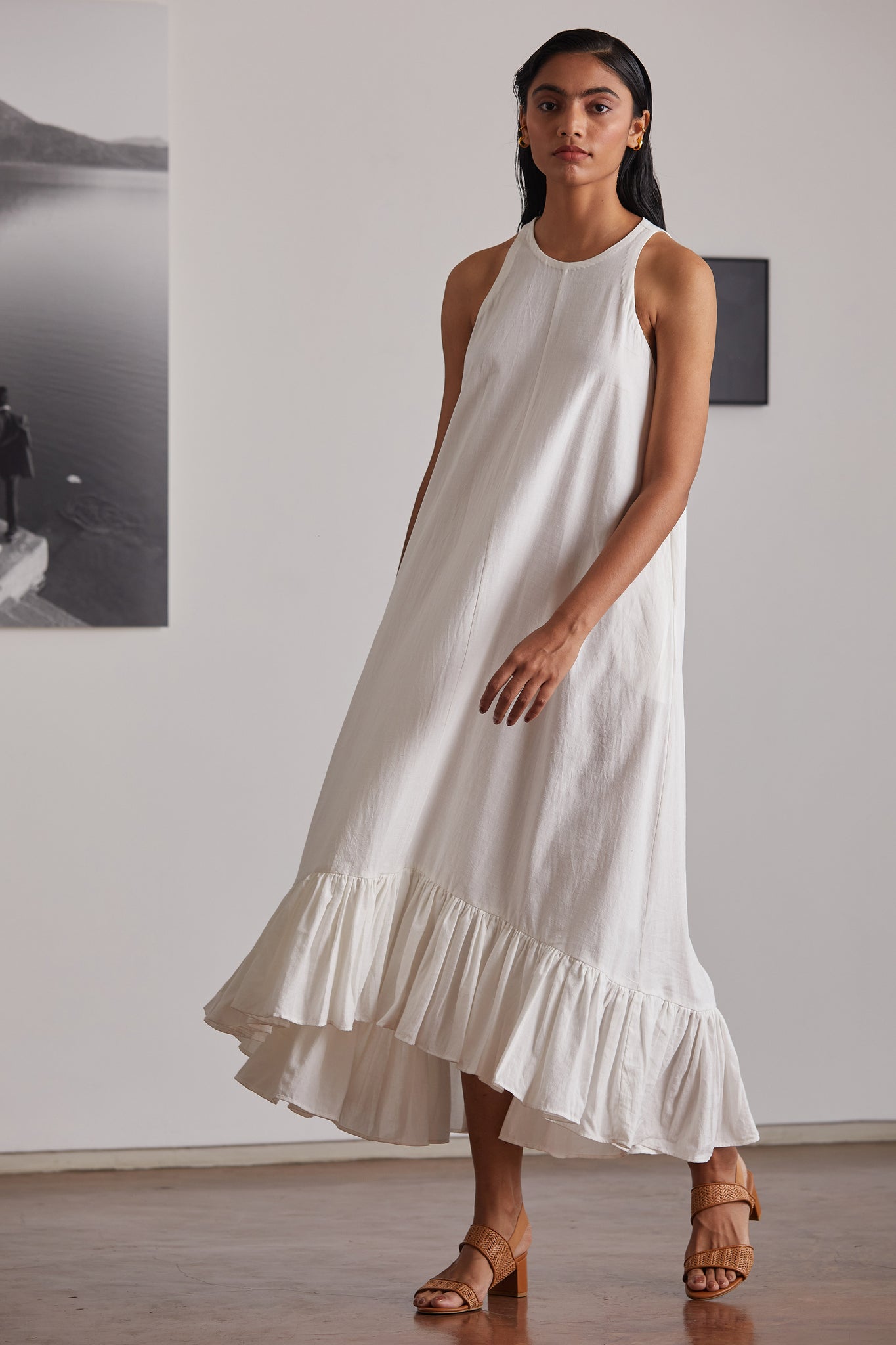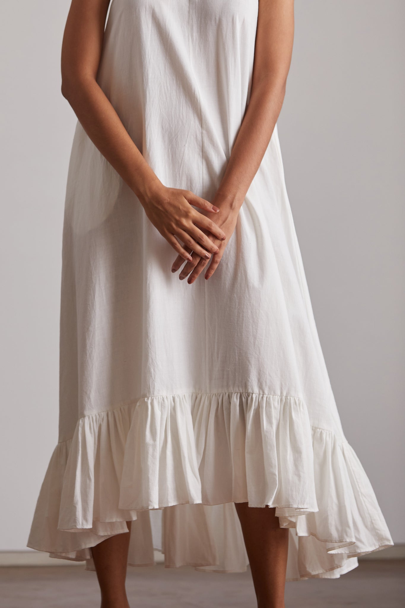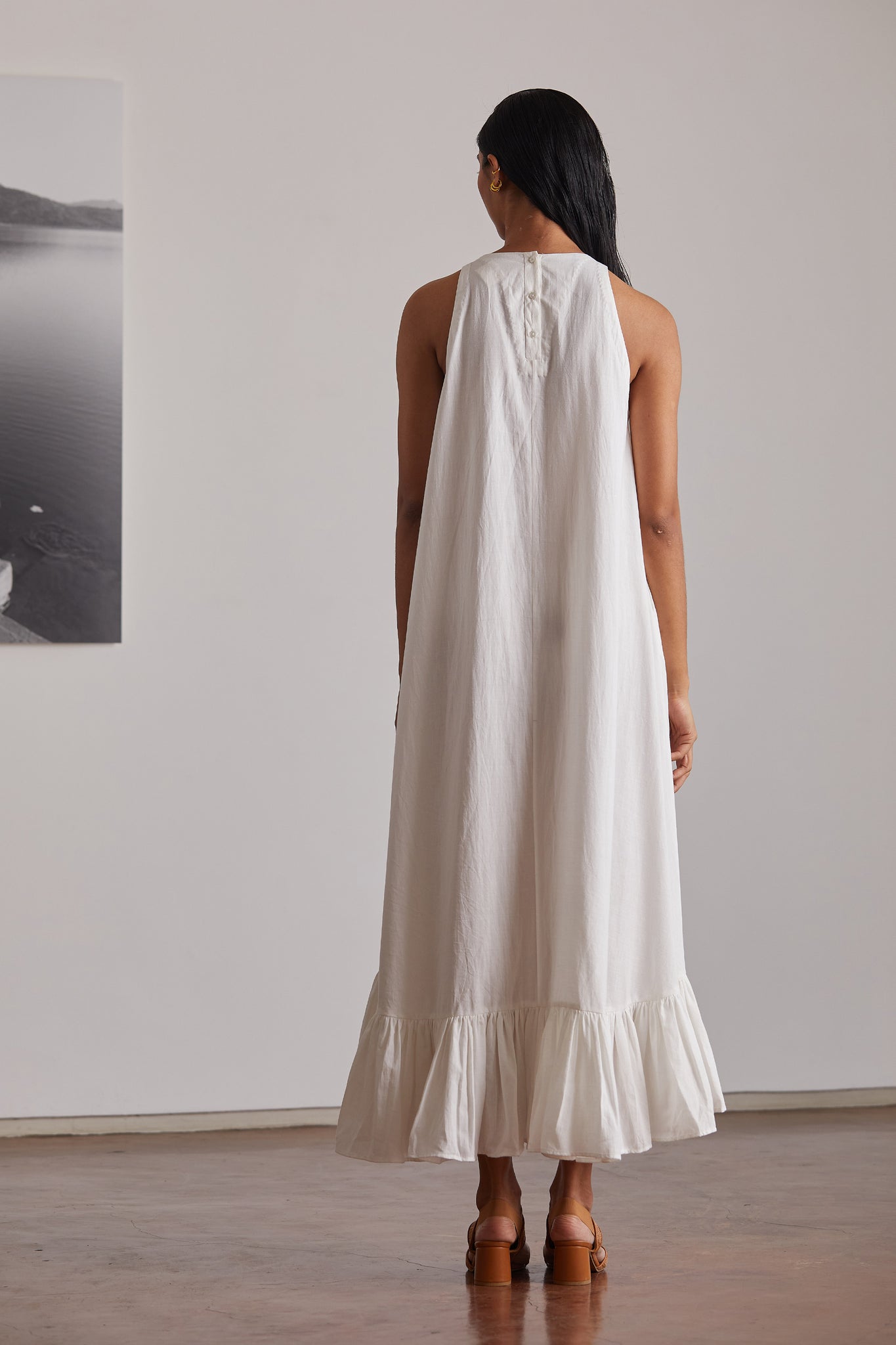 Your favourite mid-calf length in a relaxed silhouette. Button opening in the back. Bold ruffle hemline. In-seam pockets.