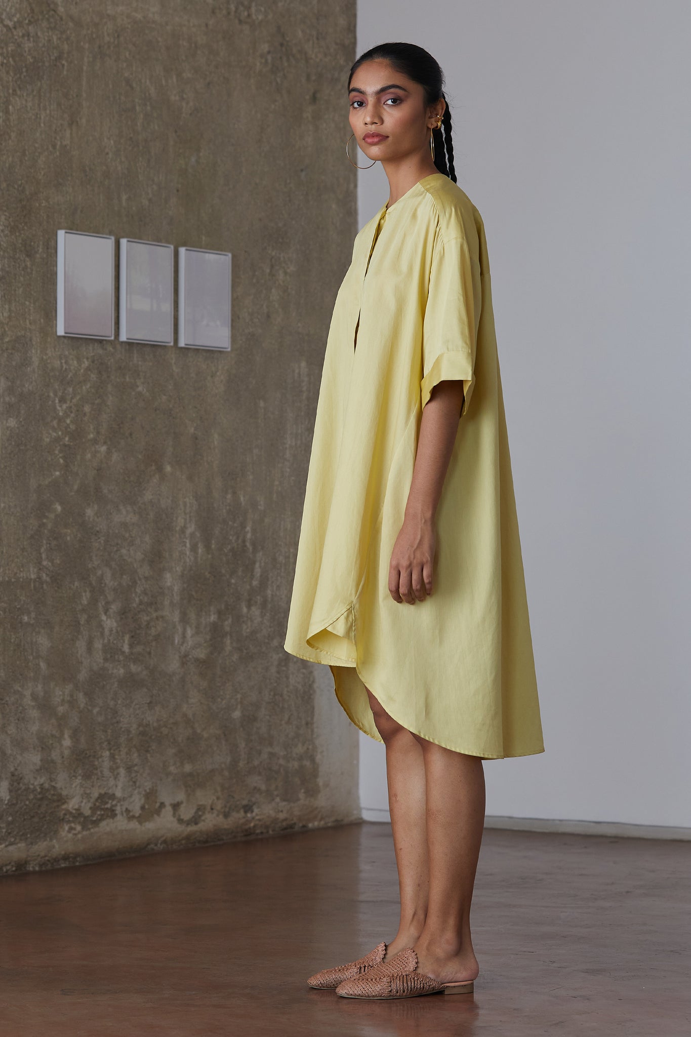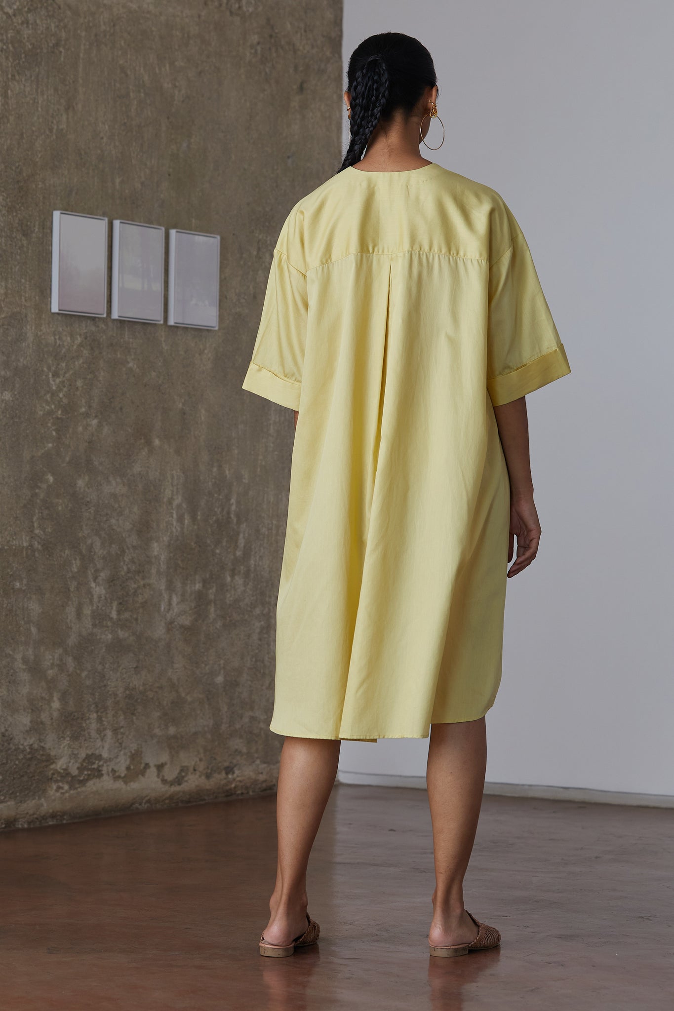Anti-fit yet feminine dress. Boxy sleeves. Modish round neck. Curved hemline with gazette detail. Button through with neatly concealed placket. Back yoke with single a inverted pleat. Can be worn as is or paired with pants. Easy to style.