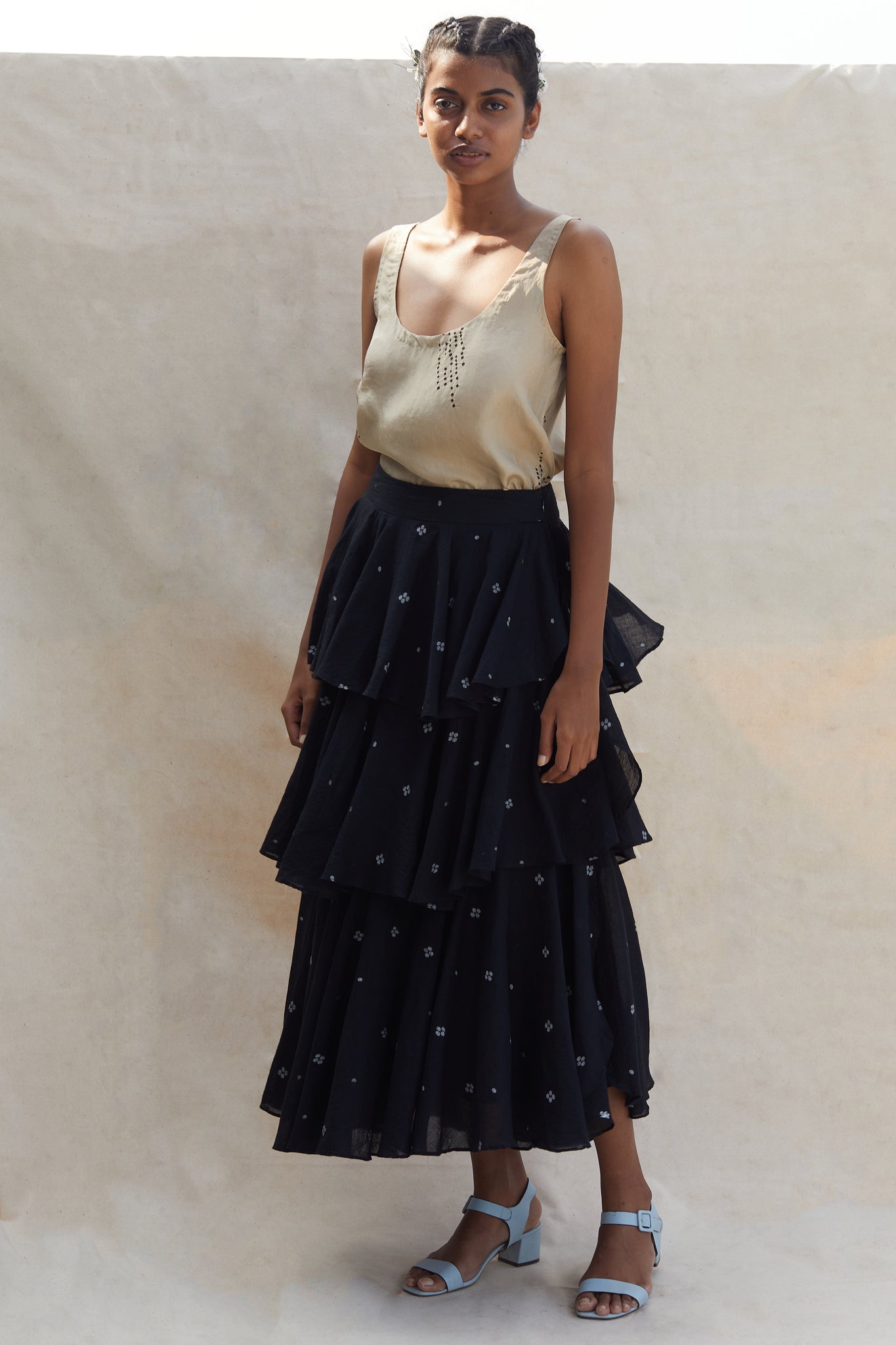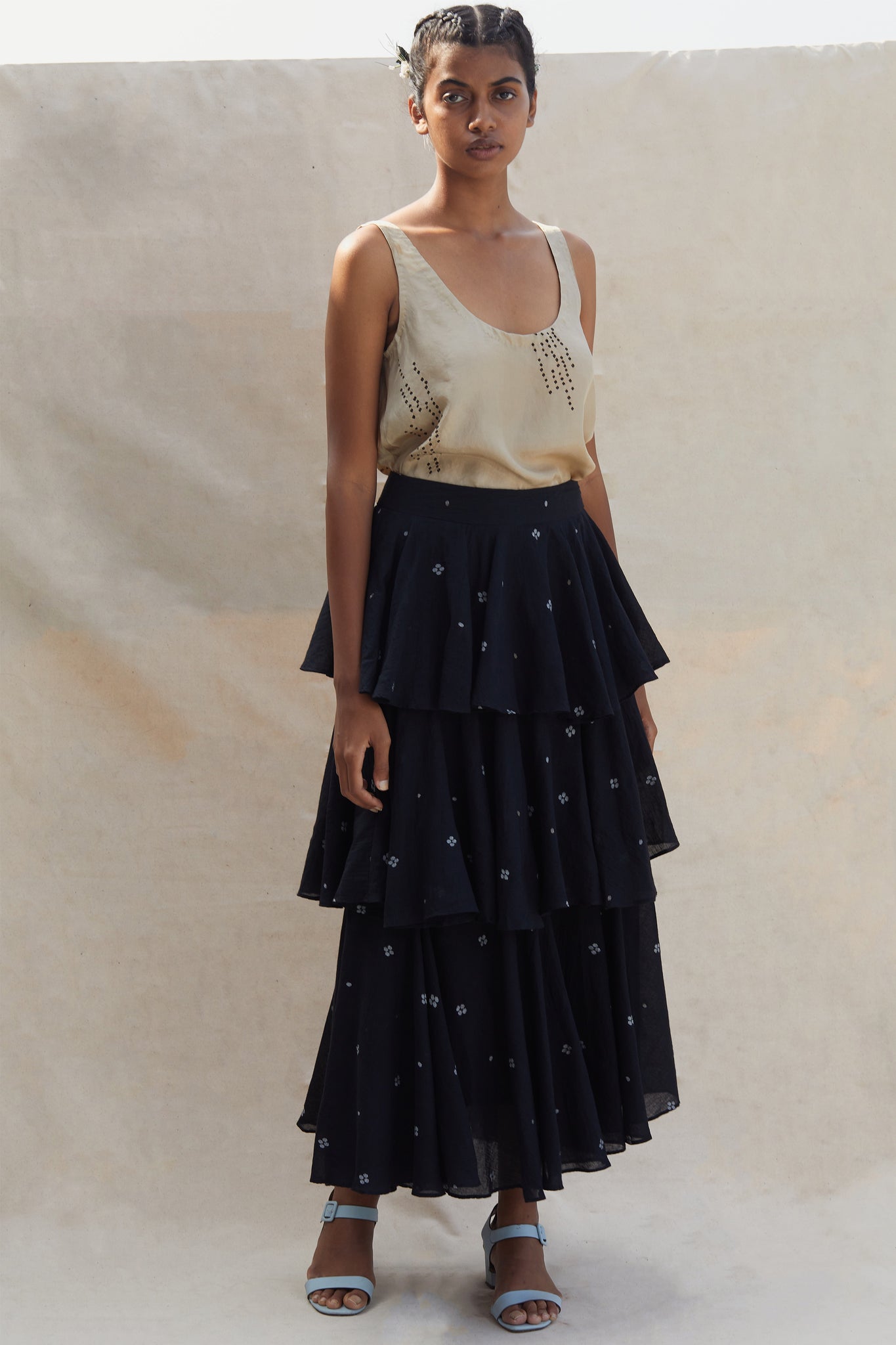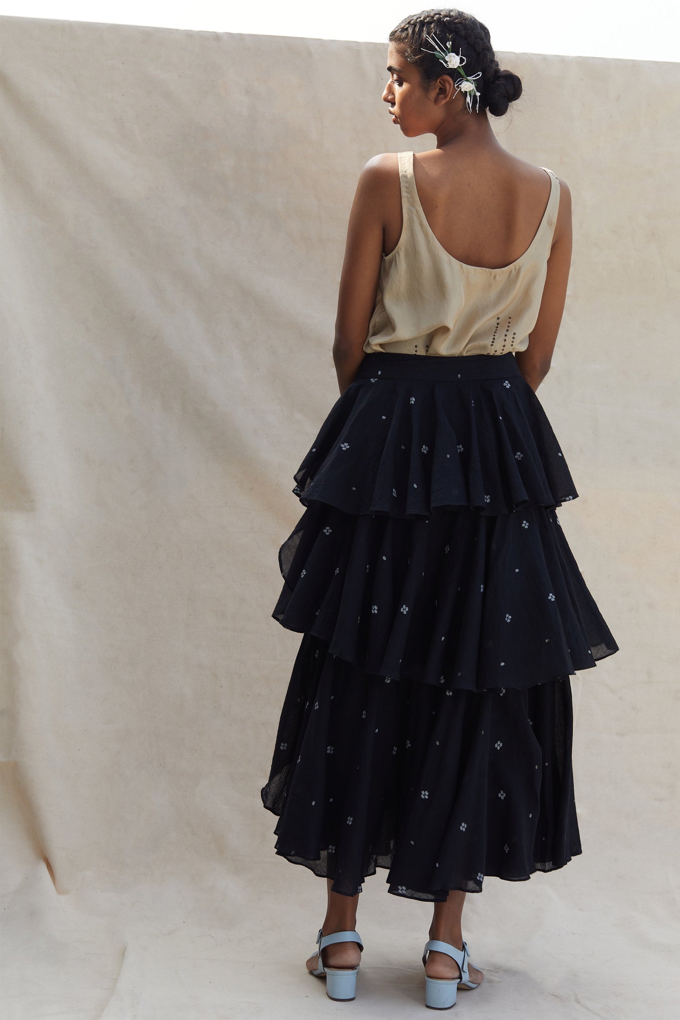 Tiered statement skirt in fine jamdani. Concealed side zip. Playful and chic.