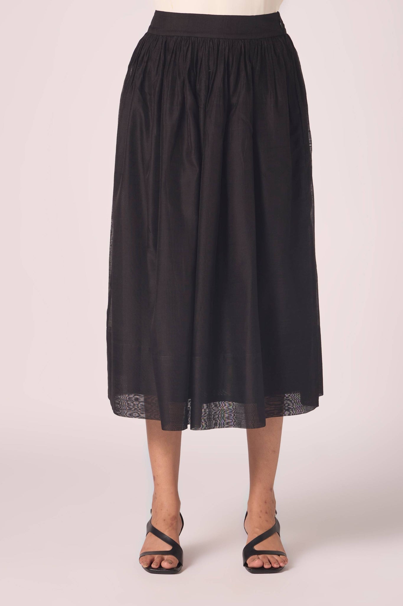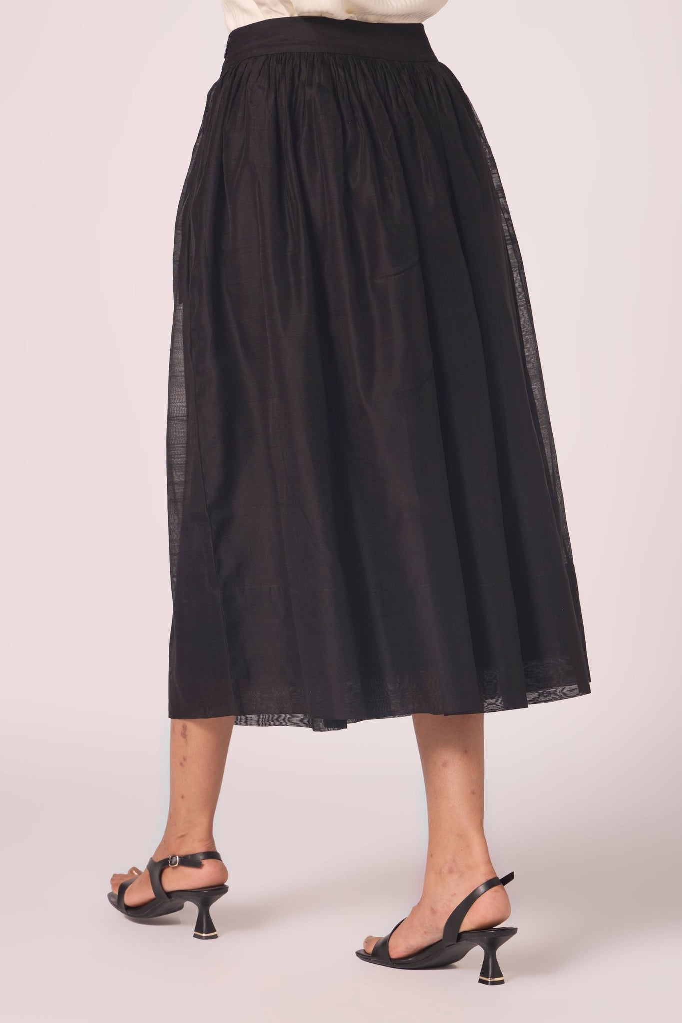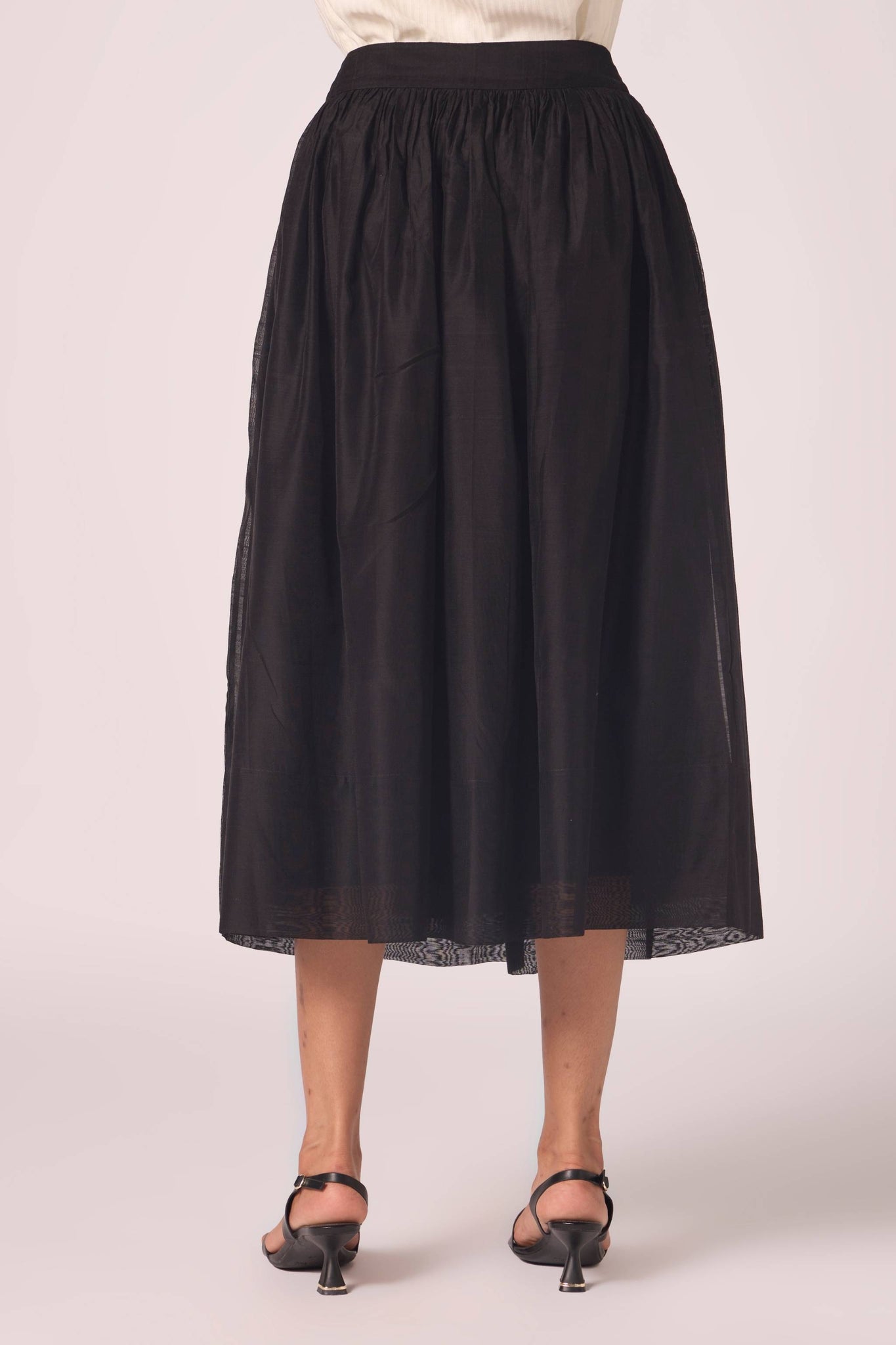 Handwoven Chanderi, this skirt gathers at the waist before flowing into measured fullness. Its construction ensures body and fall, while full lining lends depth to the silhouette.