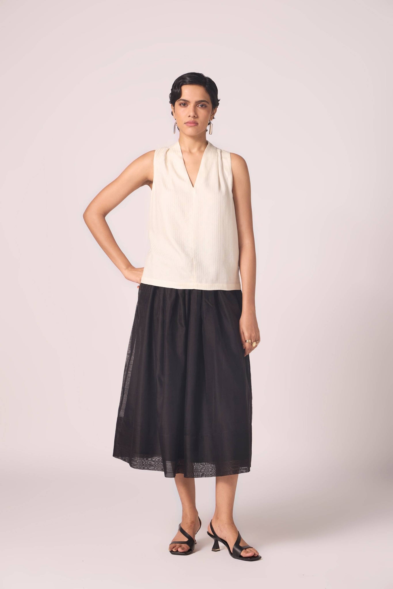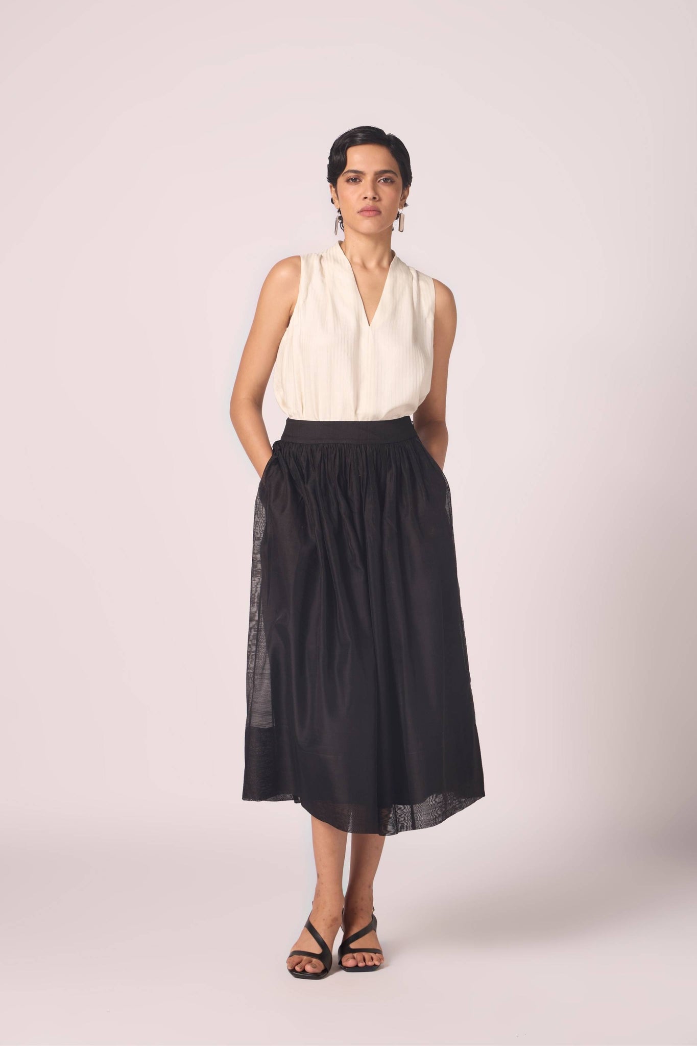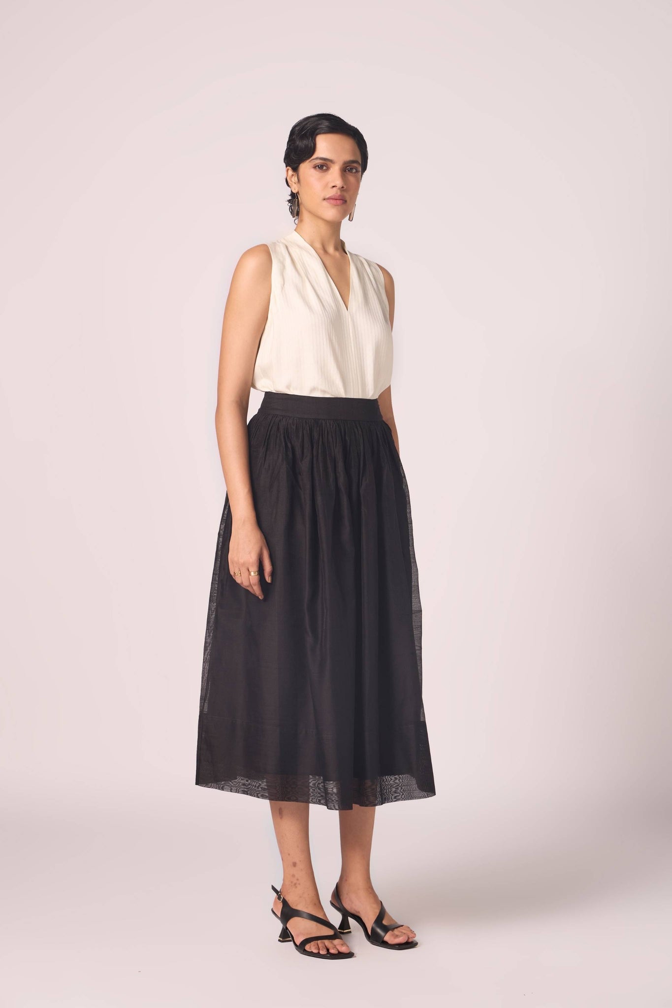 Handwoven Chanderi, this skirt gathers at the waist before flowing into measured fullness. Its construction ensures body and fall, while full lining lends depth to the silhouette.