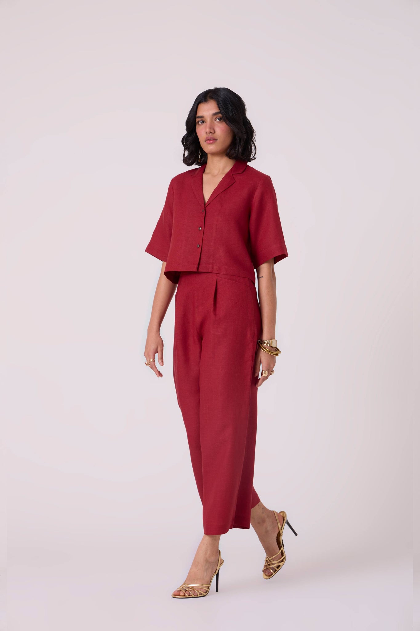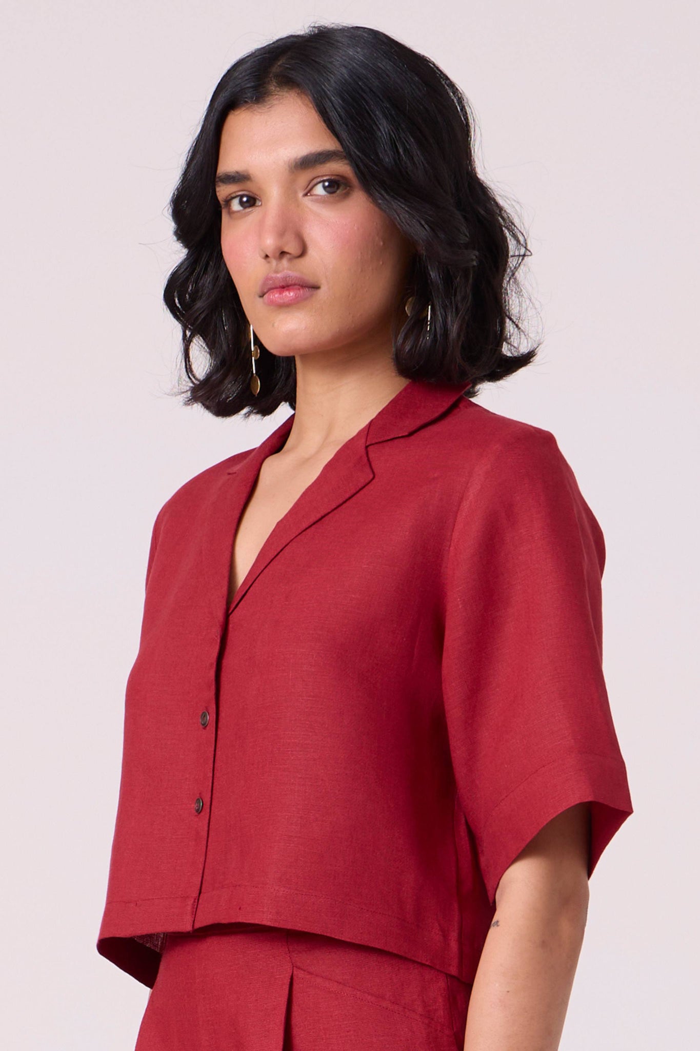 Cropped shirt in linen. Elbow length sleeves and notch collar. Boxy fit