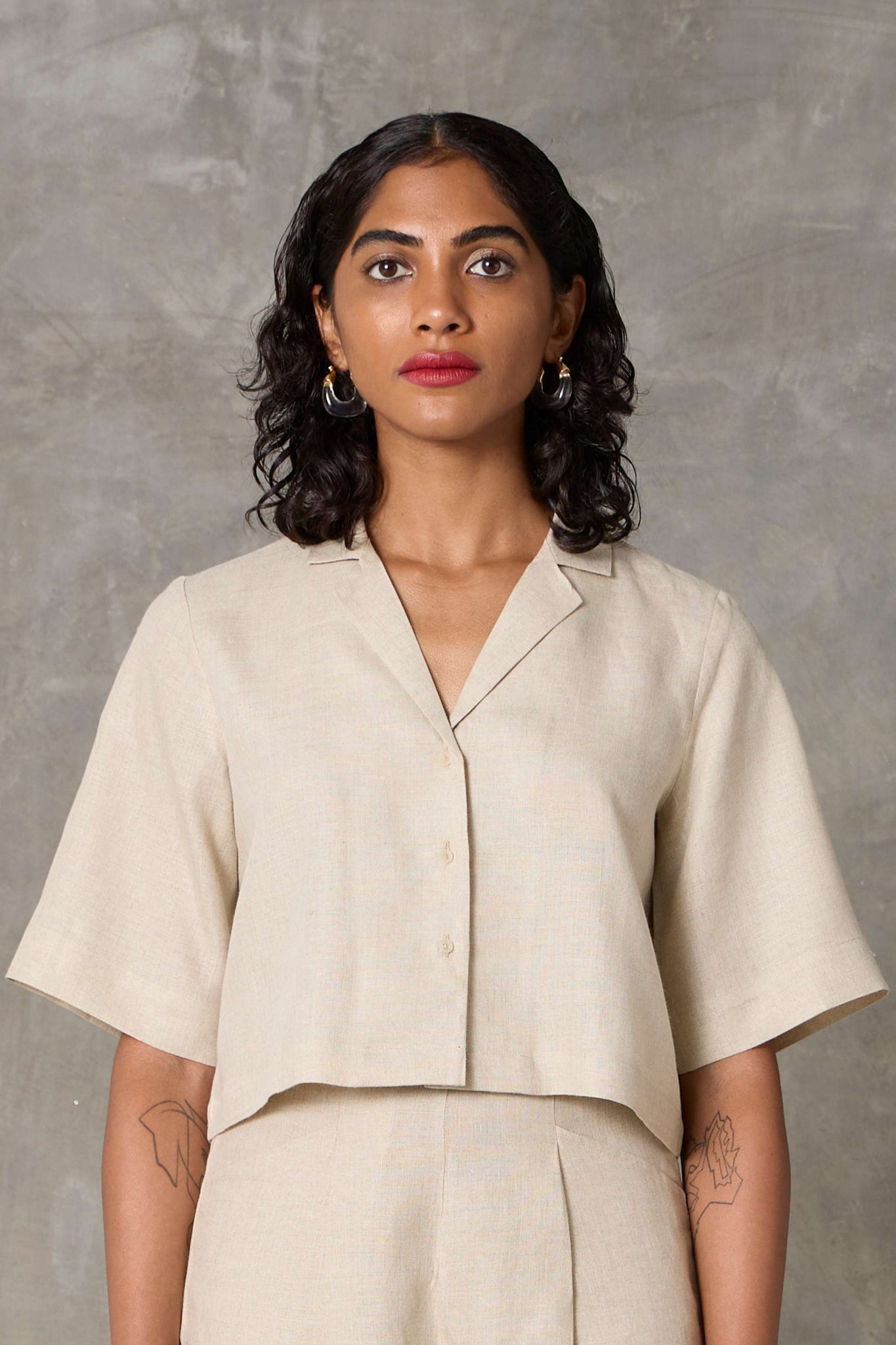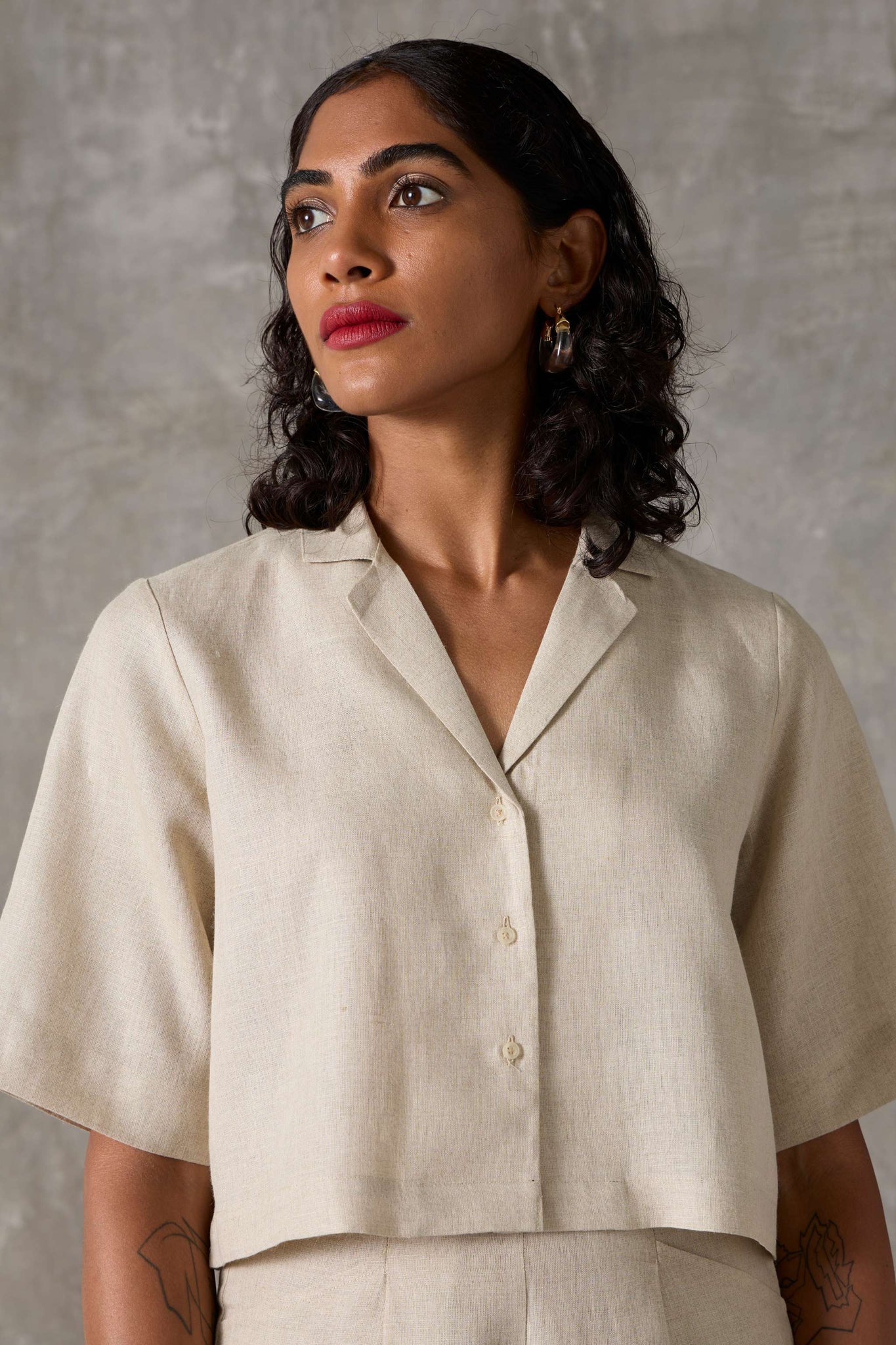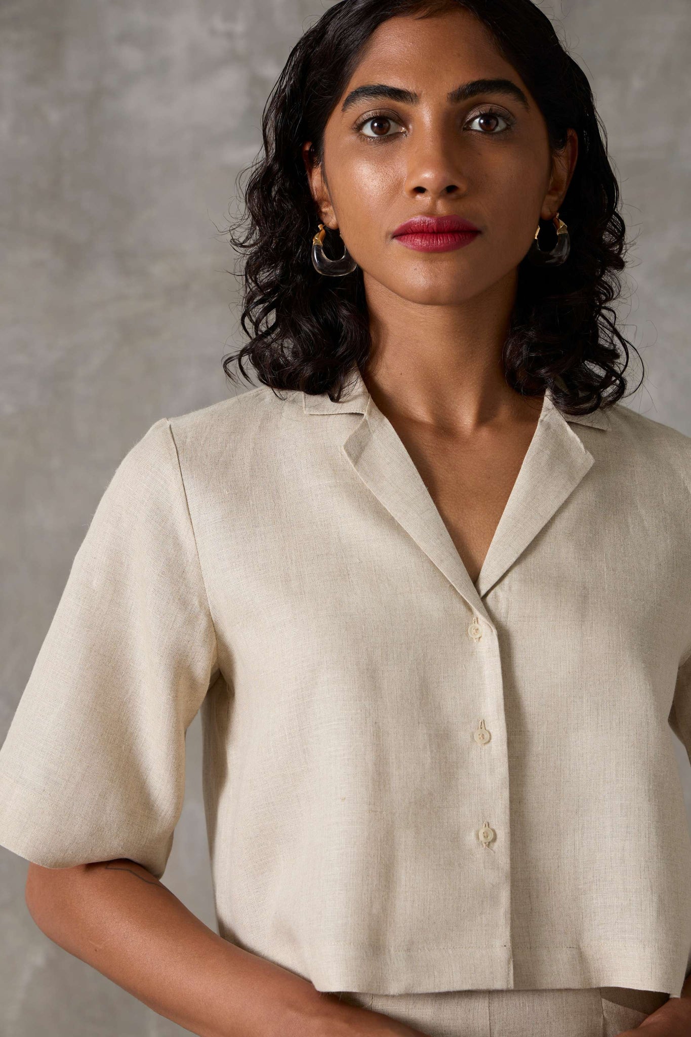 Organic linen cropped shirt with set-in sleeves and a notch collar for. Boxy fit for breathable style.