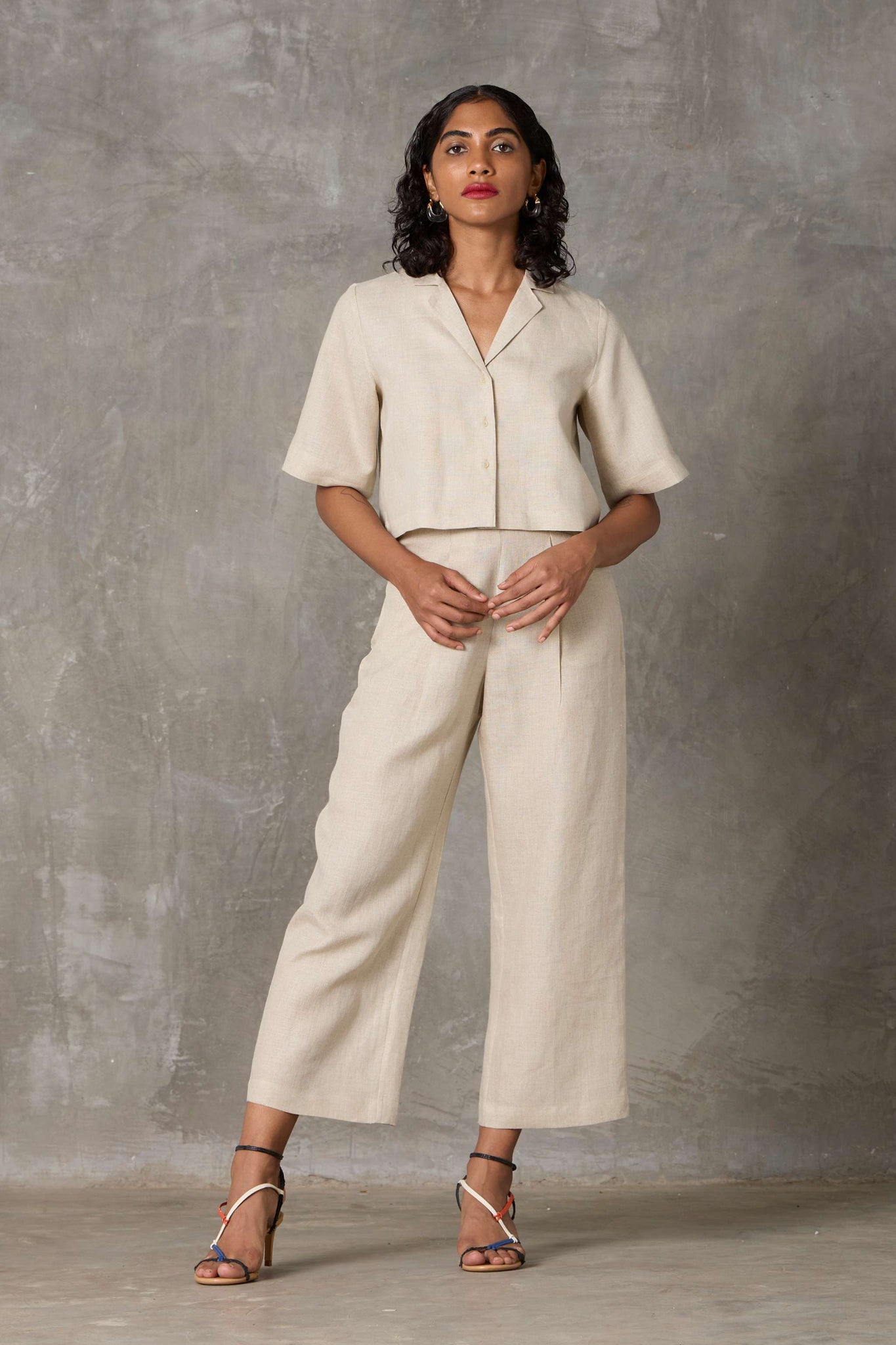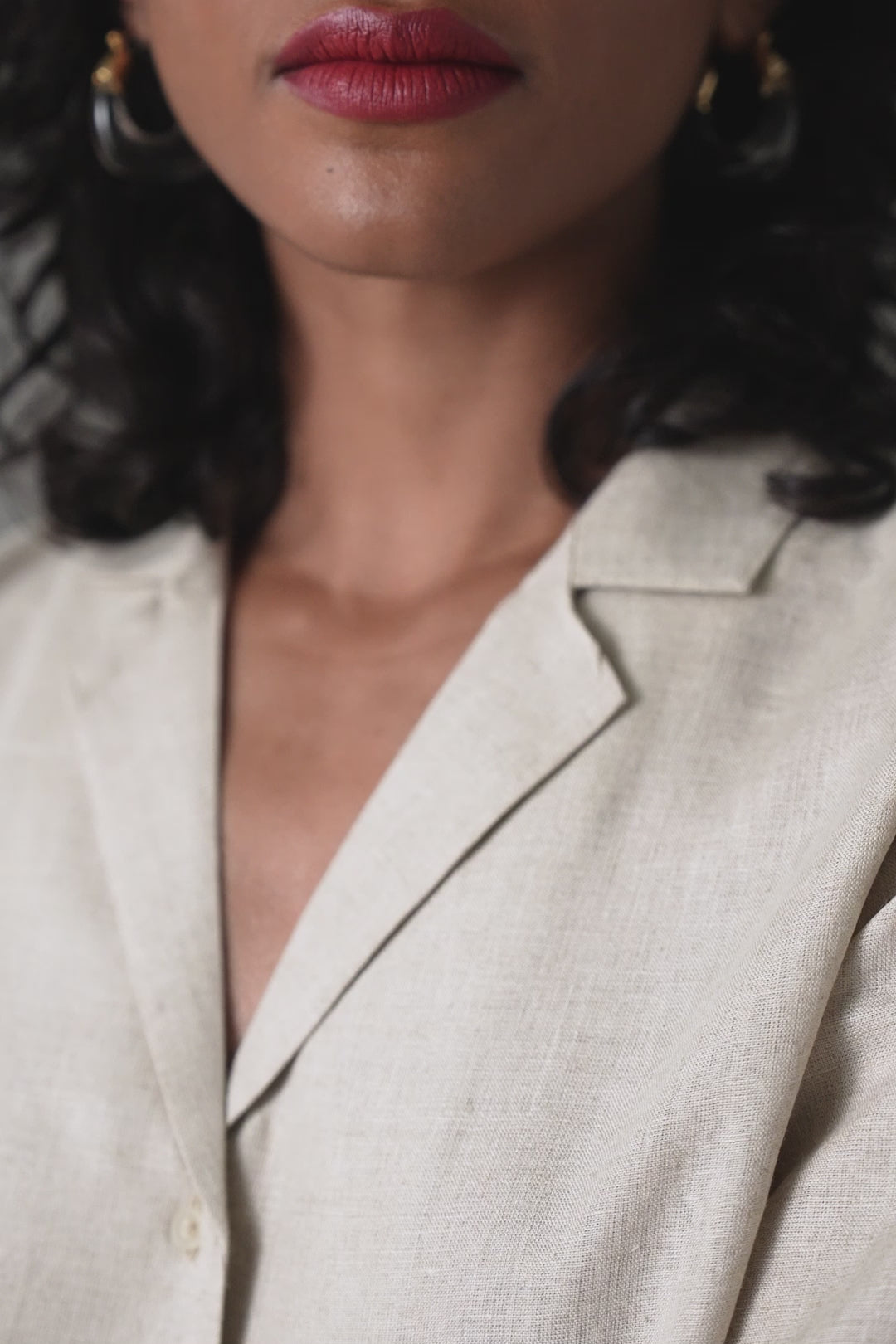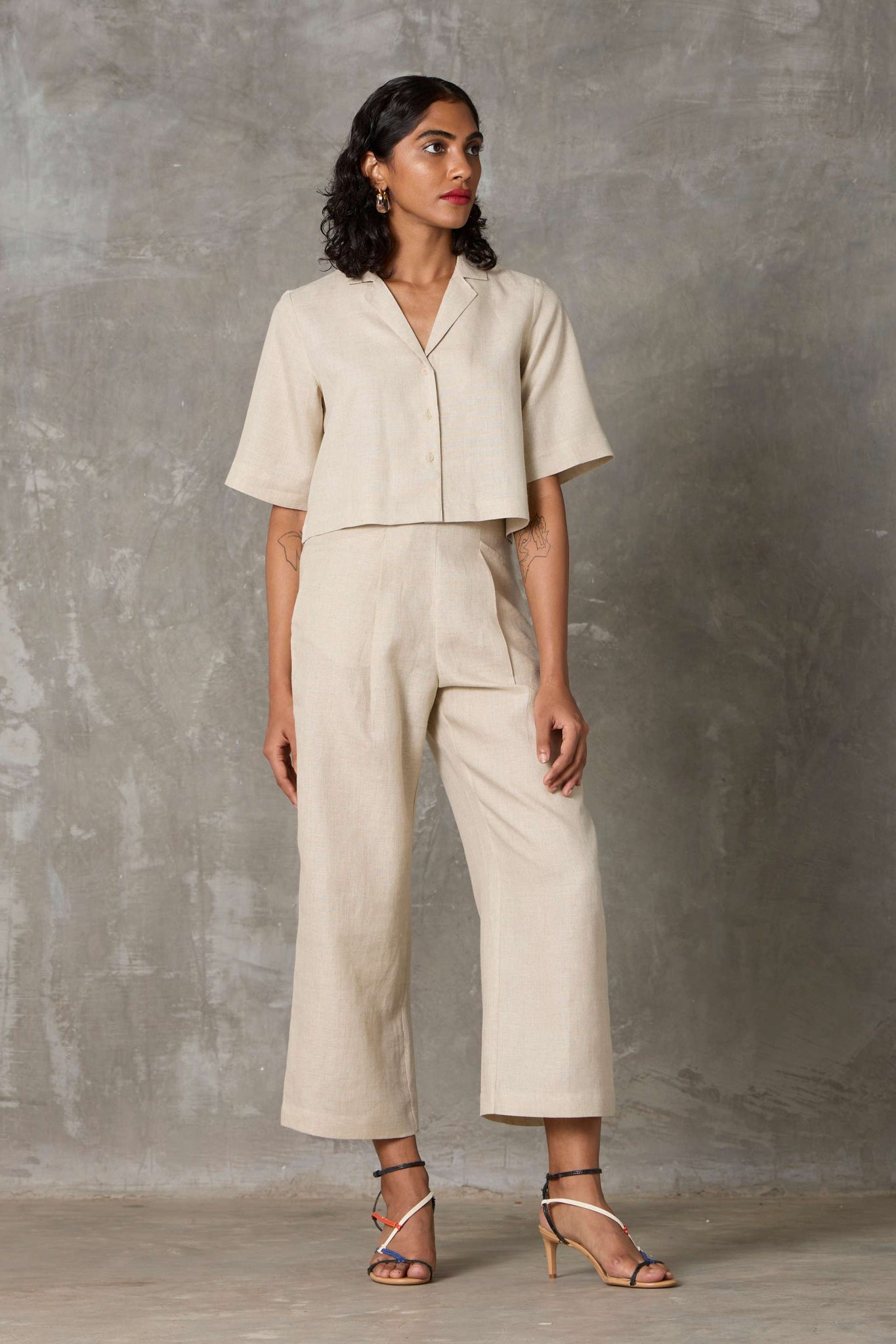 Organic linen cropped shirt with set-in sleeves and a notch collar for. Boxy fit for breathable style.