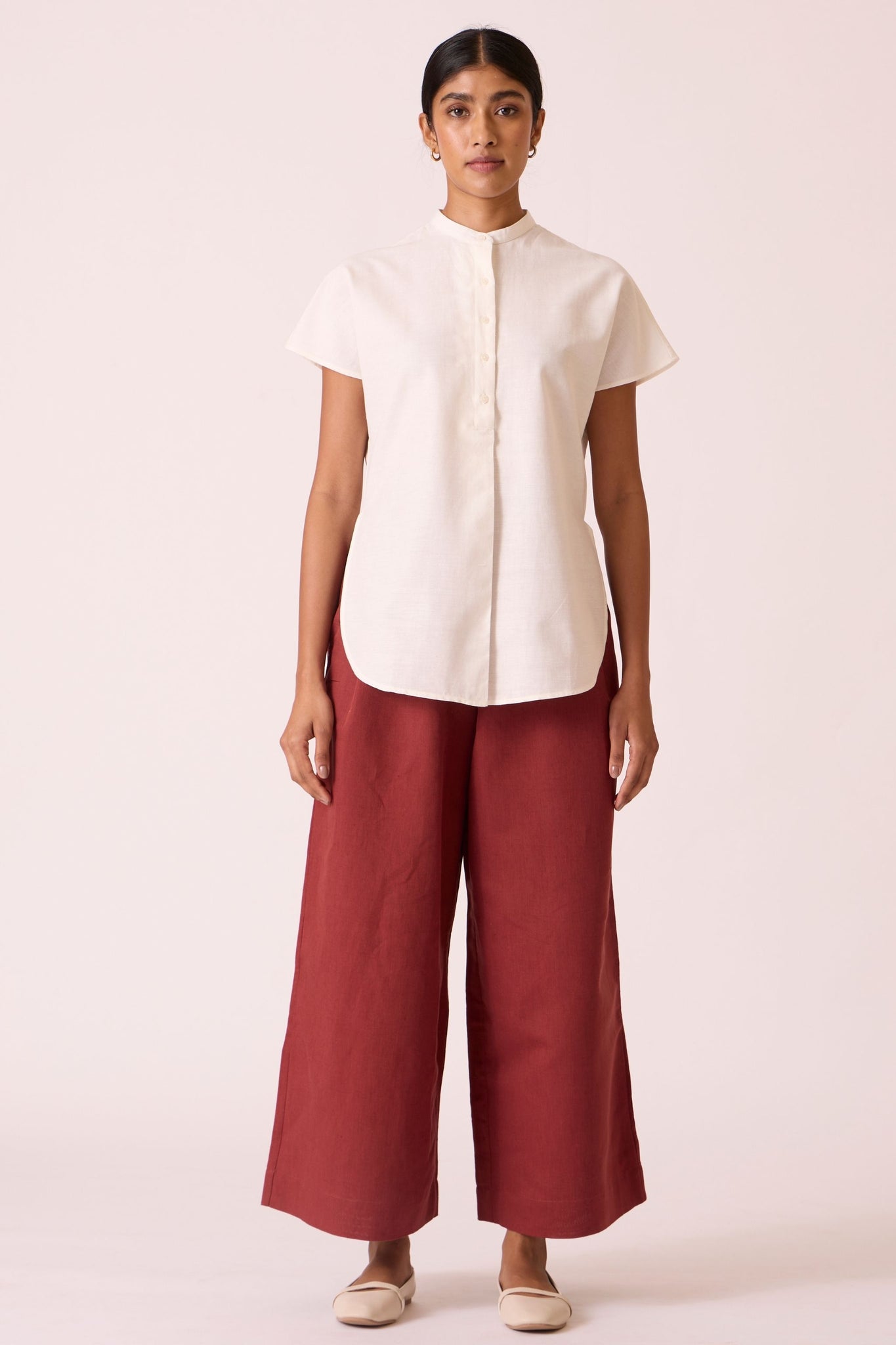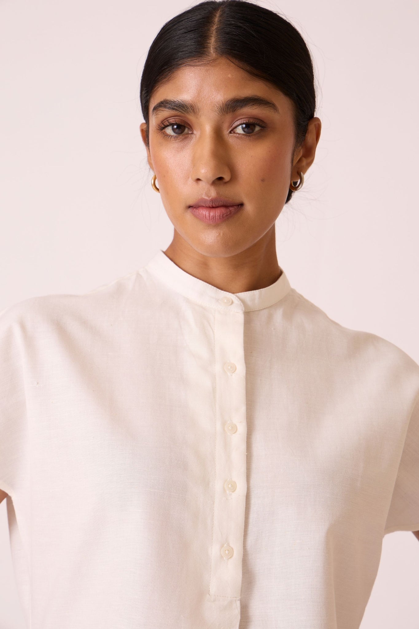 Crafted from soft handwoven cotton. Easy fit with drop sleeves. Concealed placket. Accentuated high-low hem.