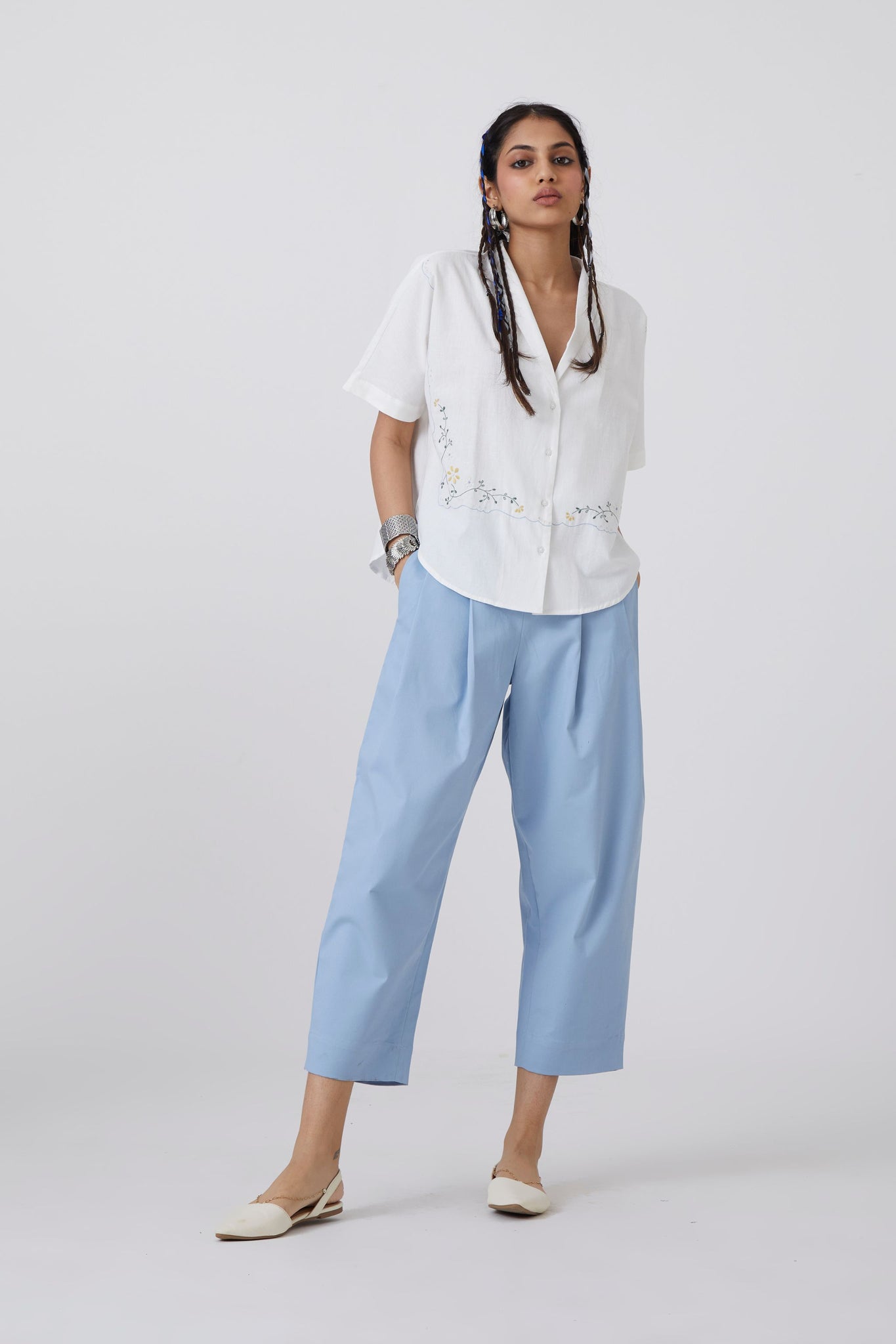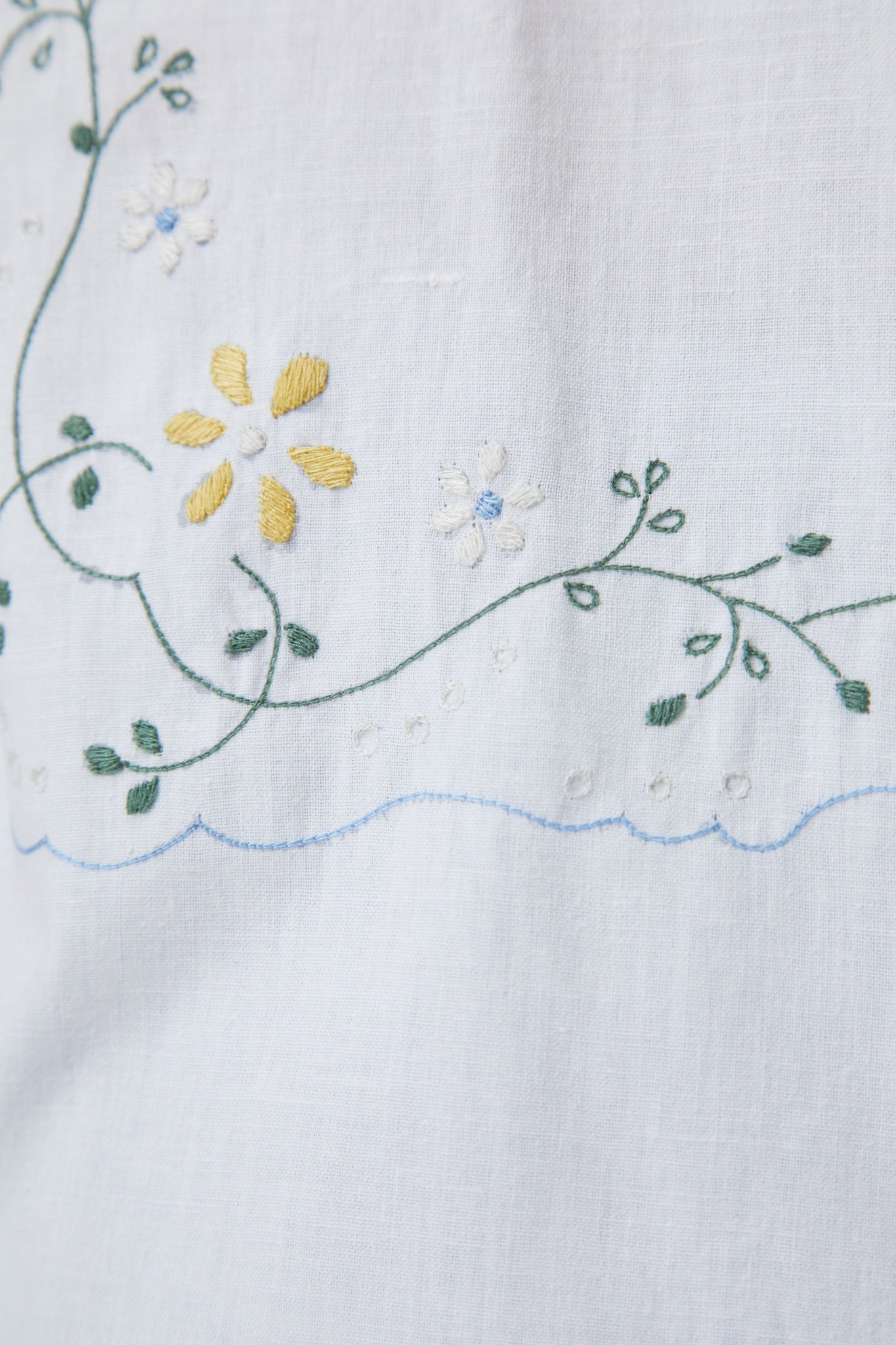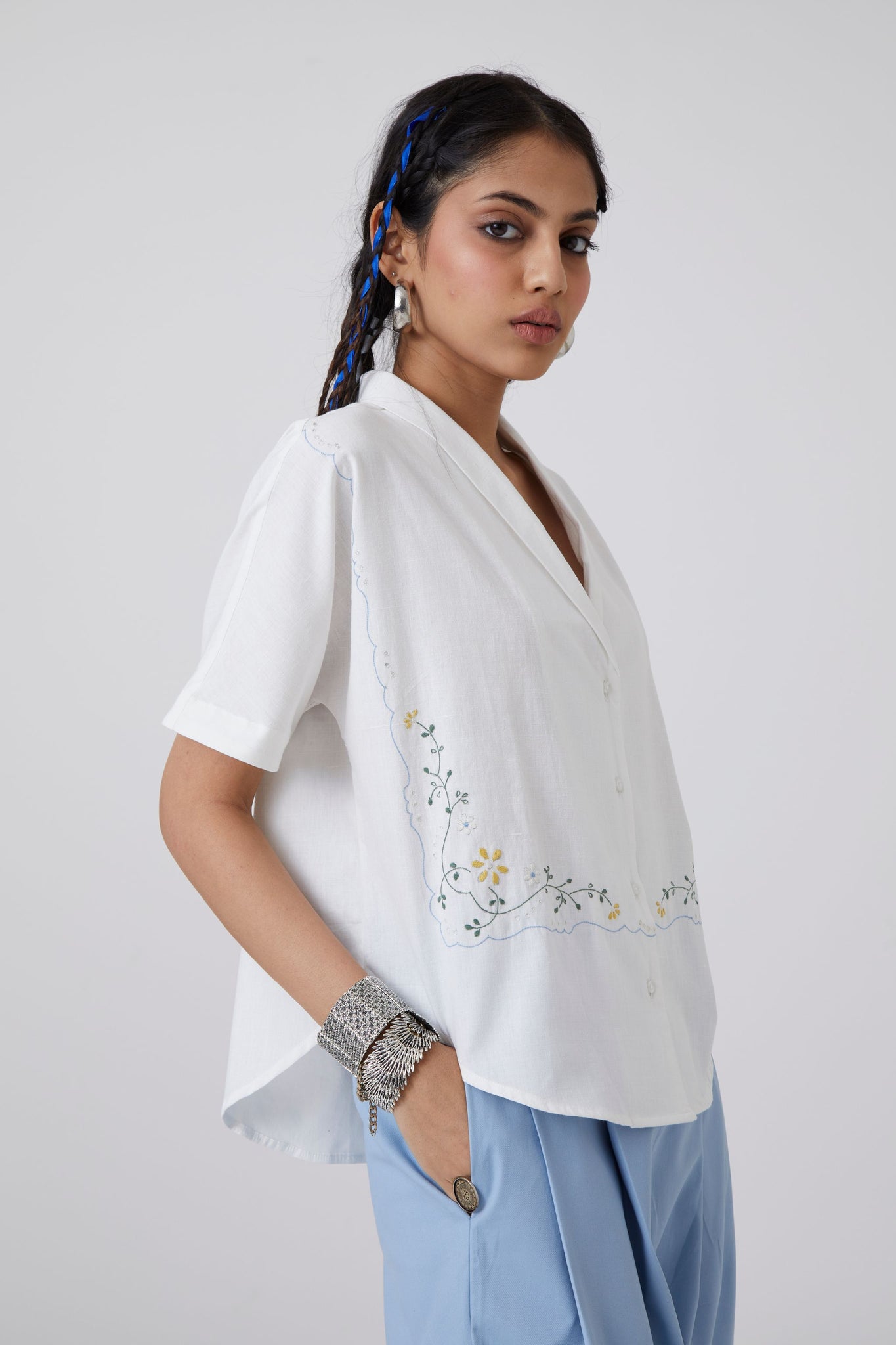 Cuban collar shirt made in handspun and handwoven cotton. Short sleeves. Finished with vintage floral motifs embroidered by hand.