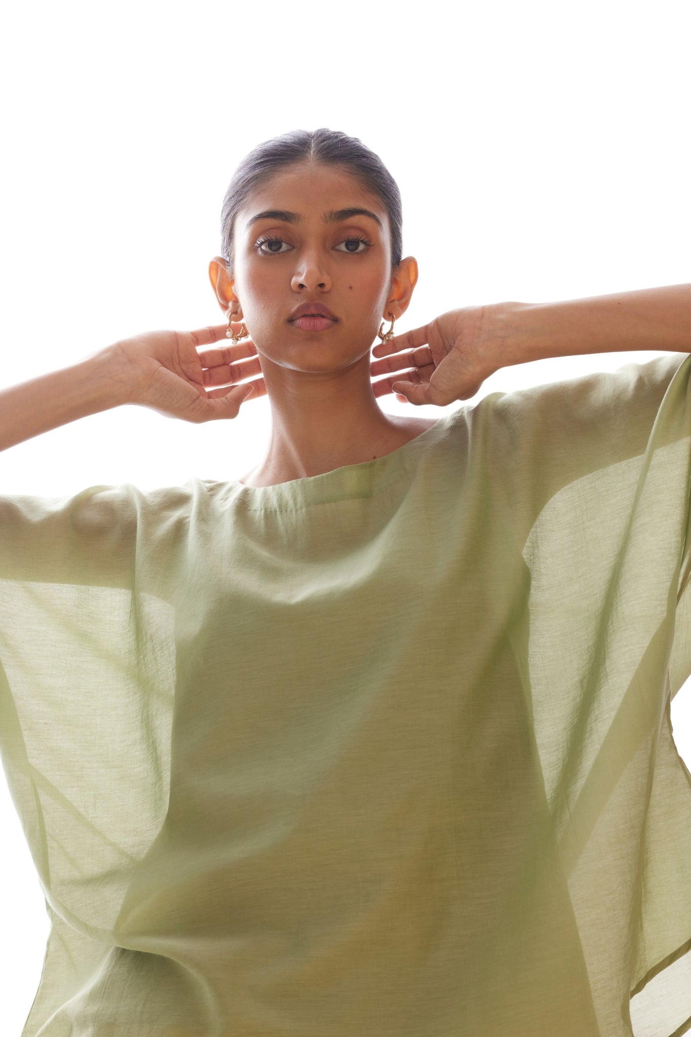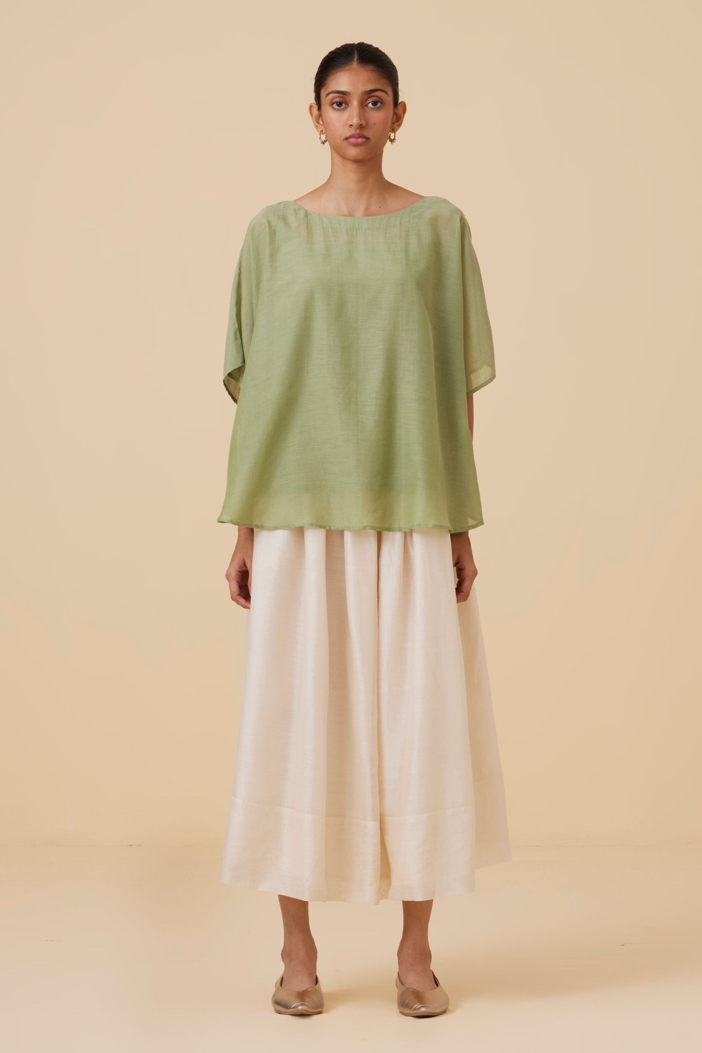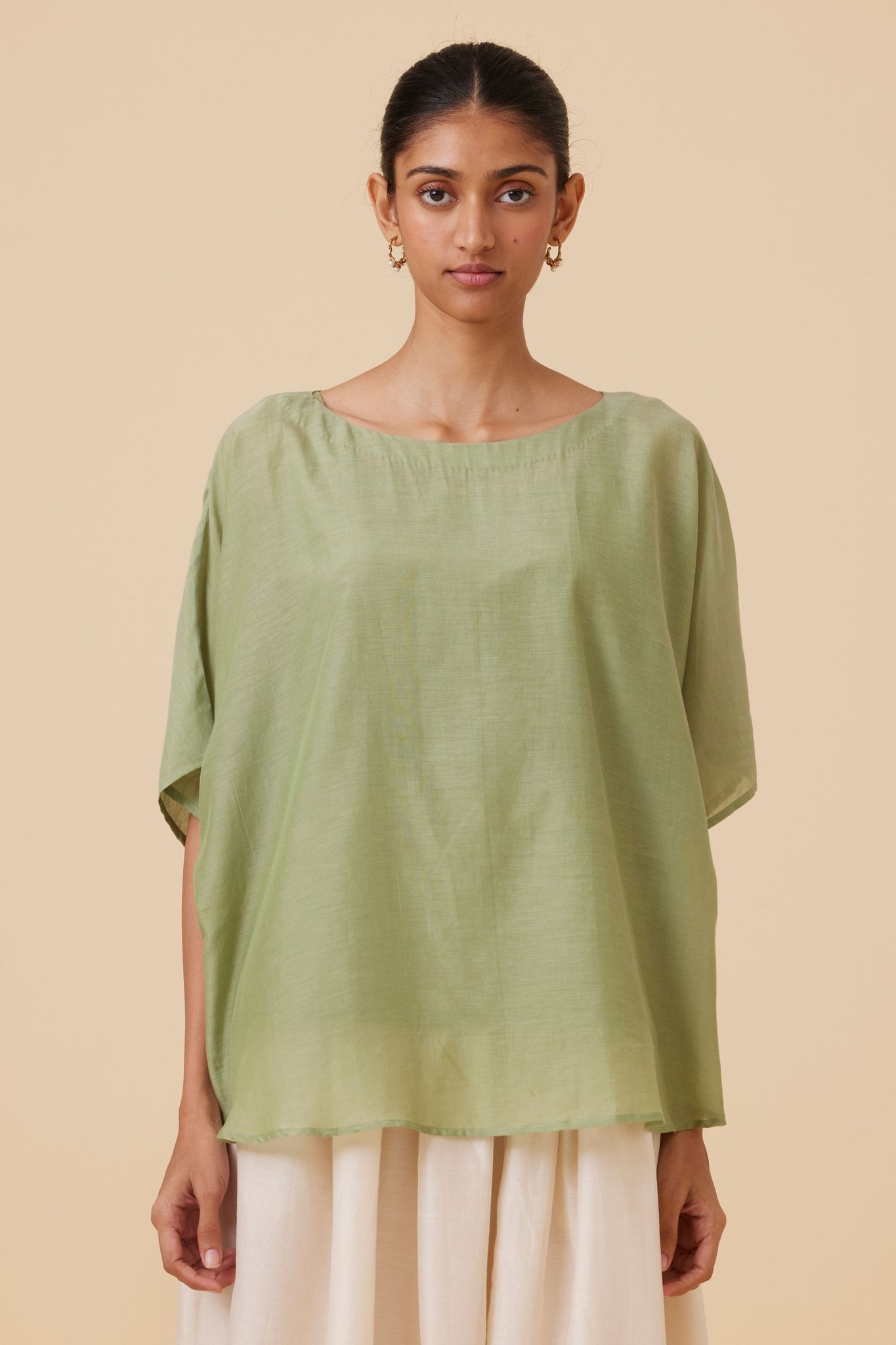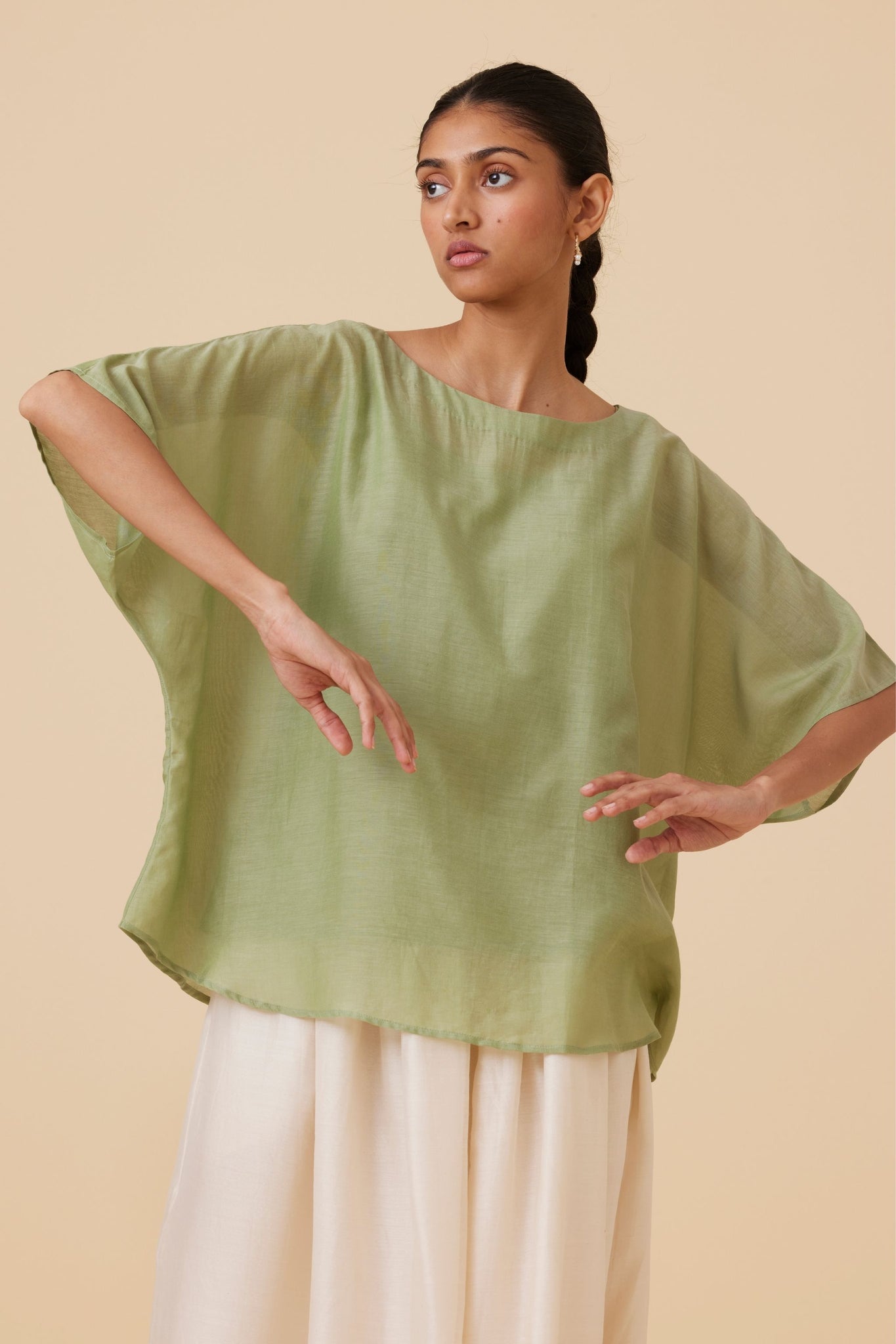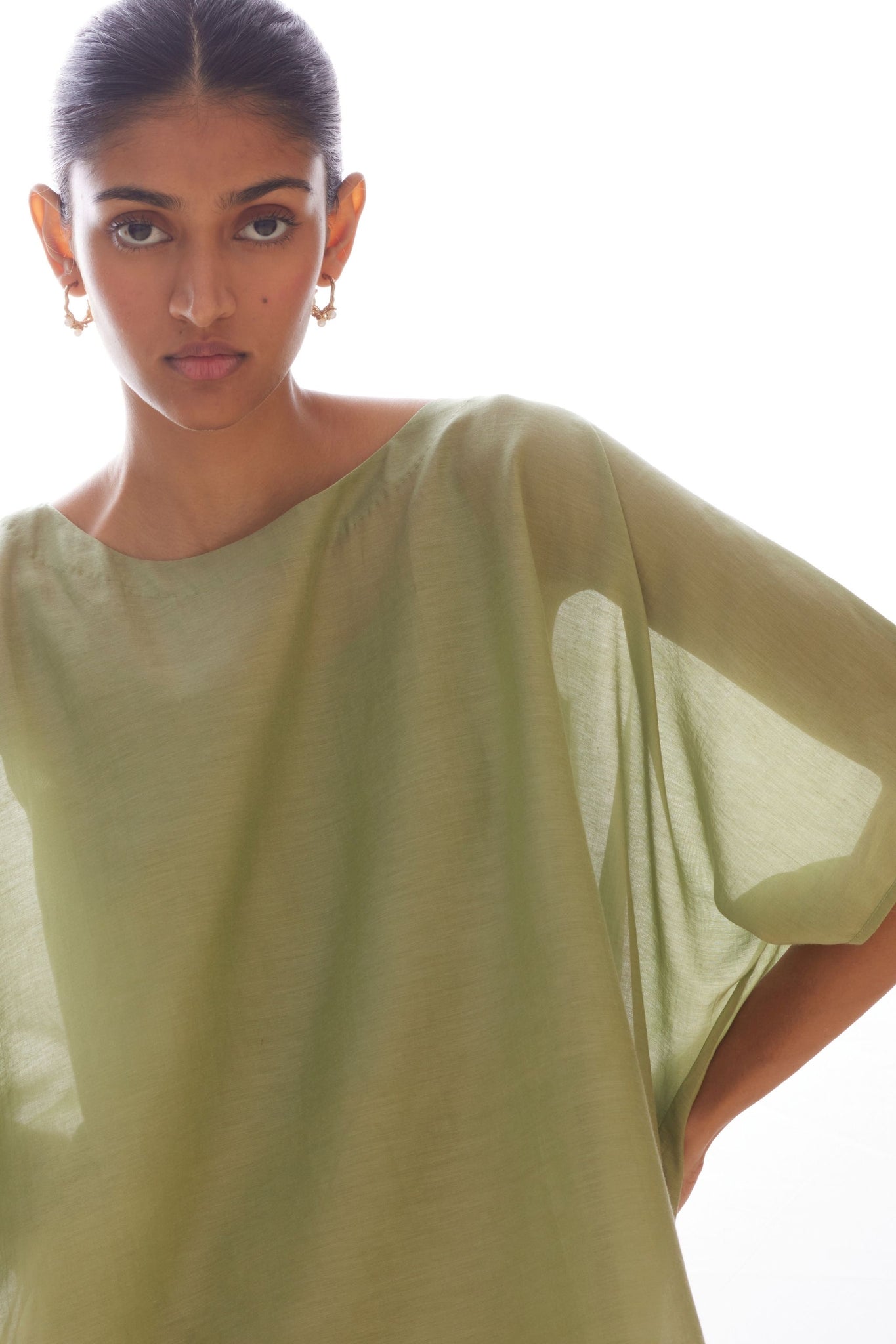 A flowing cape top with a boatish neckline and elbow length sleeves. Crafted from soft cotton silk. Slip included.