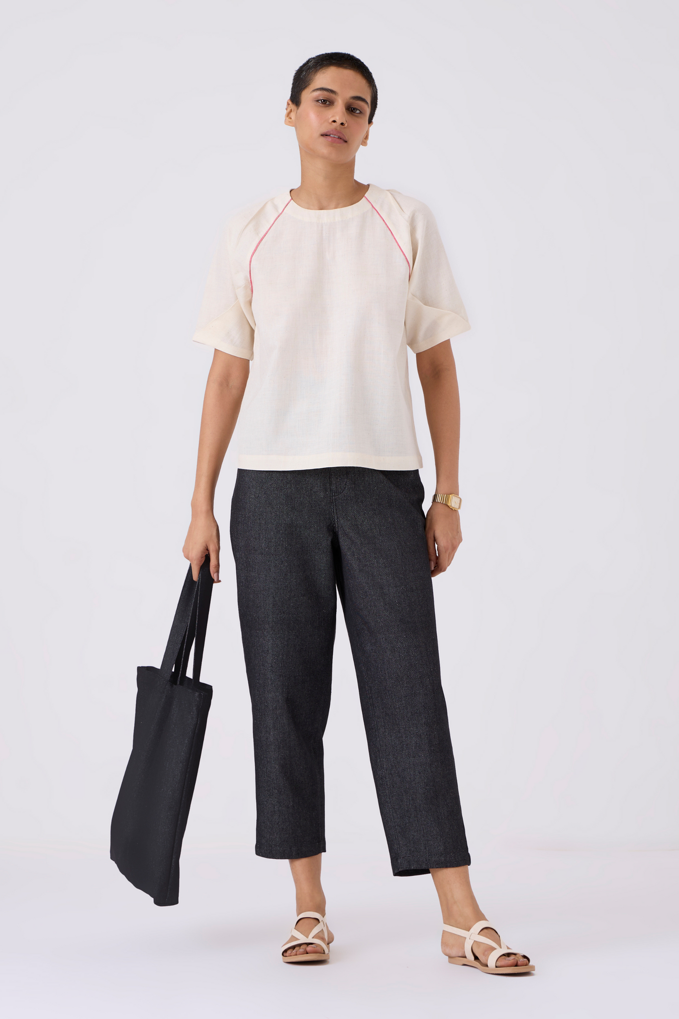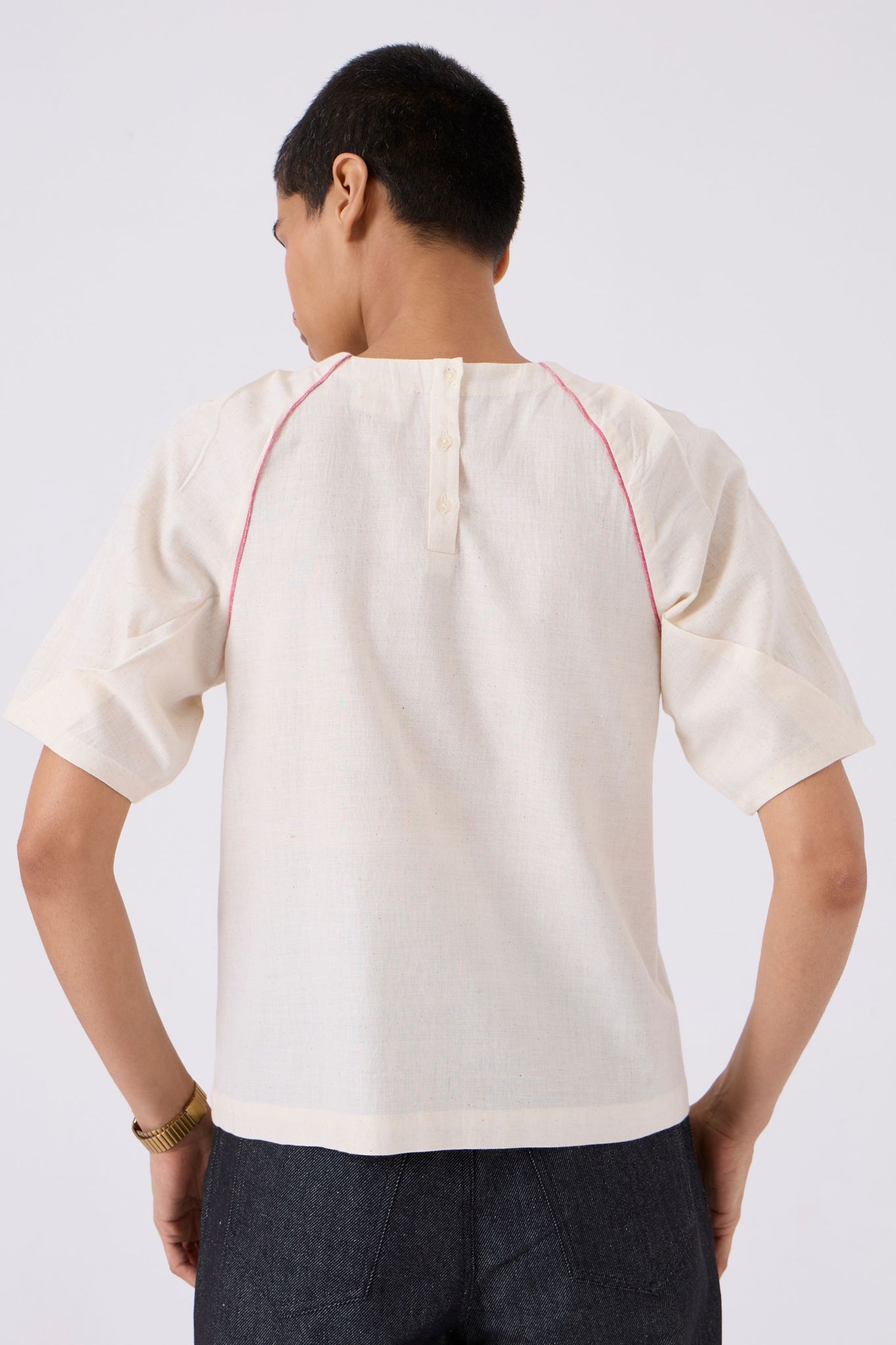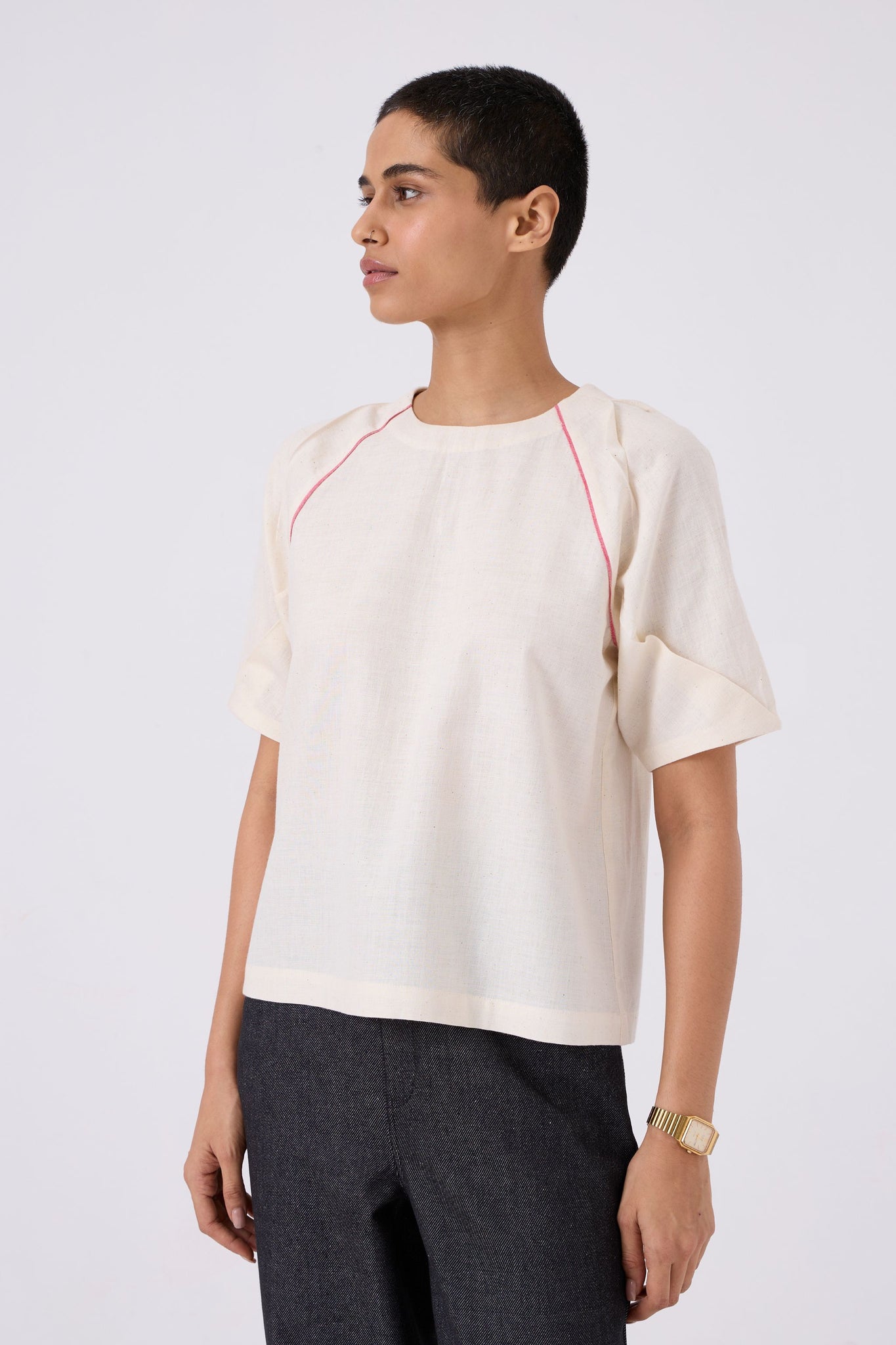 A petal pleat sleeve detail sets this khadi top apart. In natural ivory, this statement top features a modish neckline and an unusual raglan sleeve. Concealed button fastening at the back. Perfect for smart-casual events.