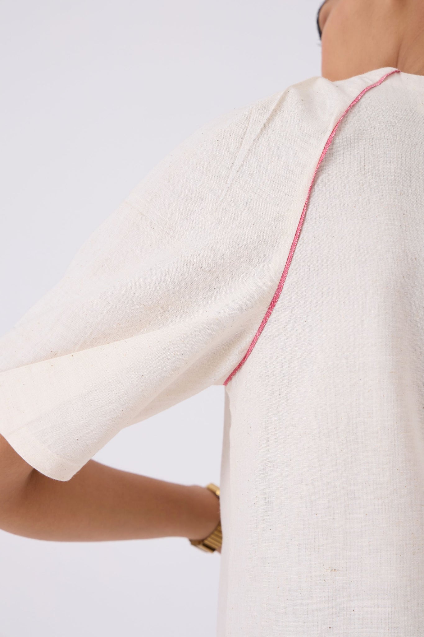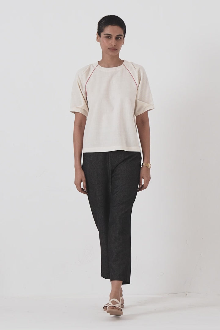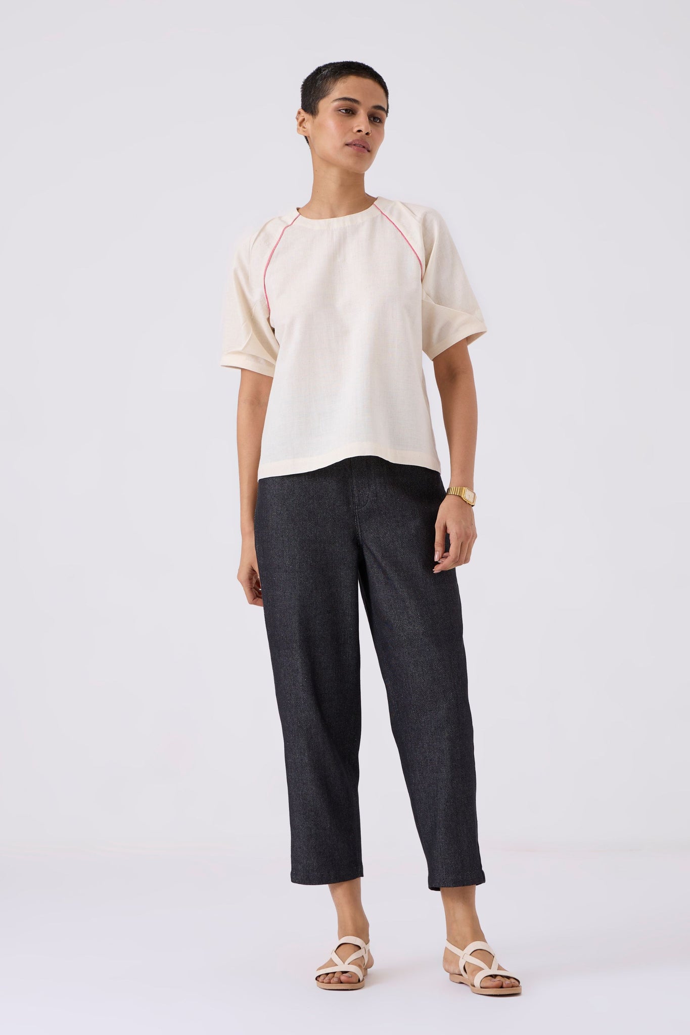 A petal pleat sleeve detail sets this khadi top apart. In natural ivory, this statement top features a modish neckline and an unusual raglan sleeve. Concealed button fastening at the back. Perfect for smart-casual events.