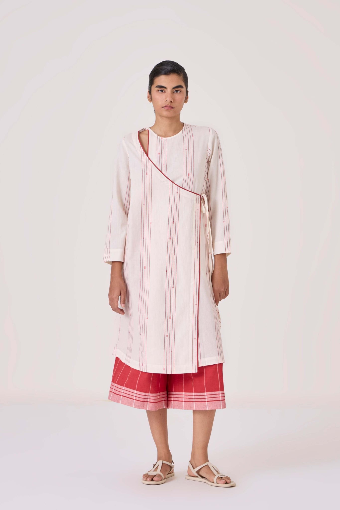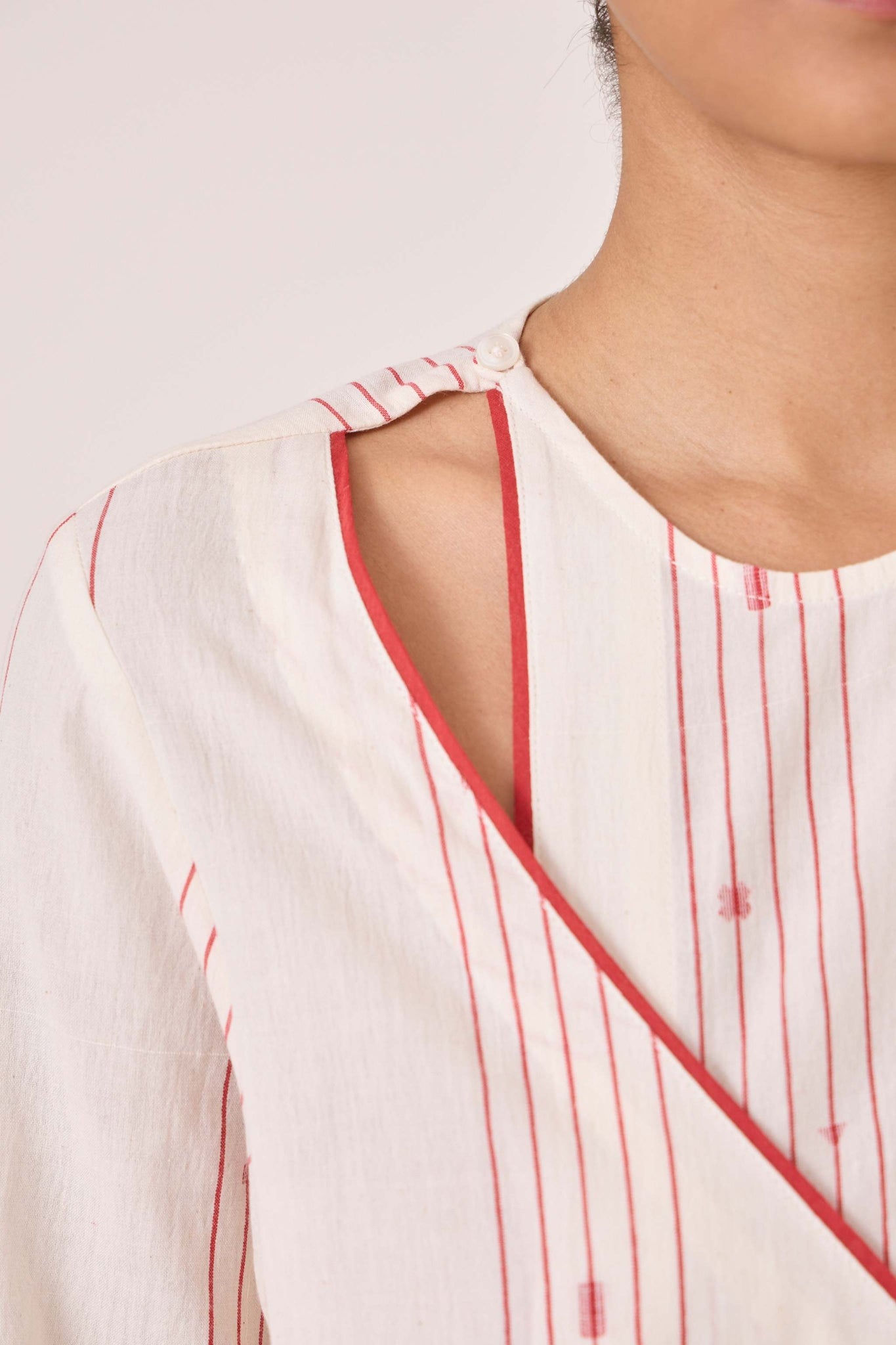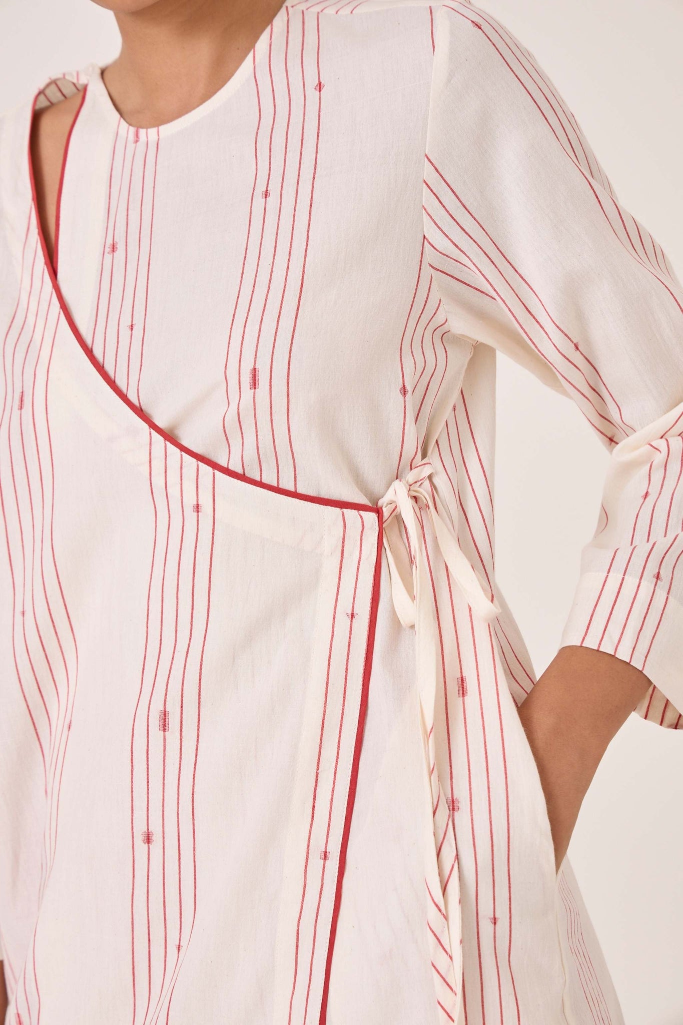 Wrap tunic that combines elegance with modern flair, crafted from fine Jamdani cotton. Features piping detail, 3/4th length sleeves and a single loop button fastening on the shoulder.