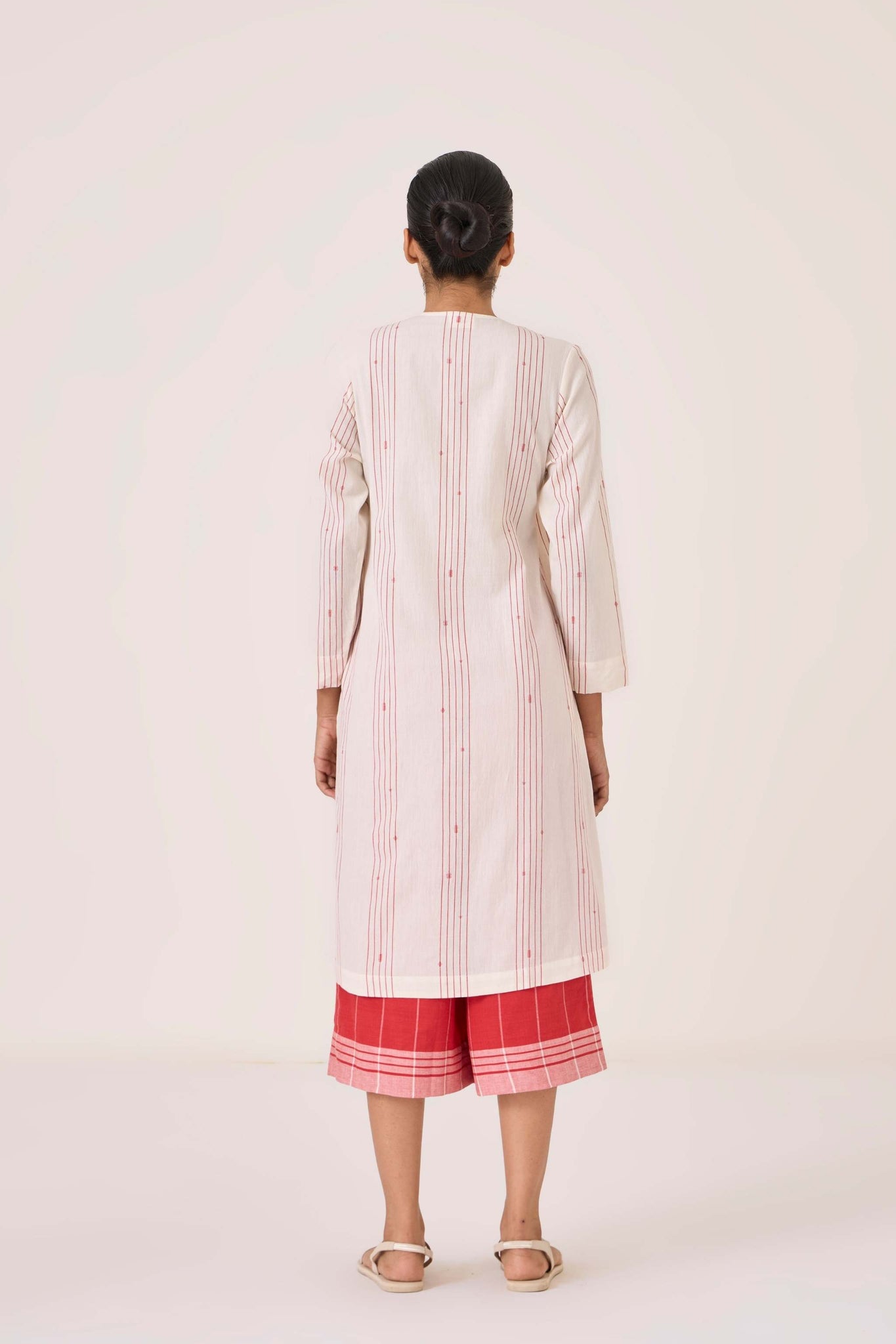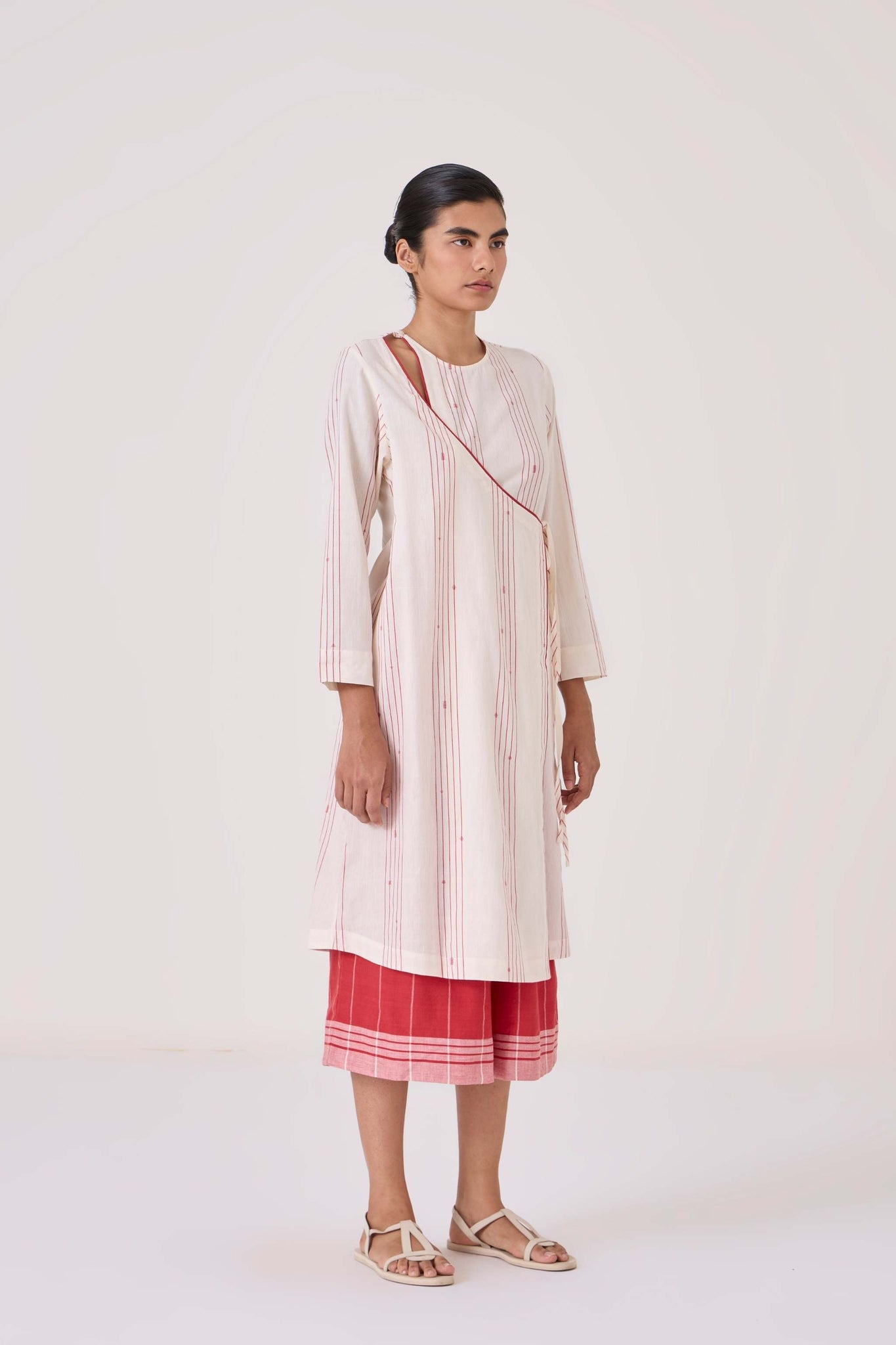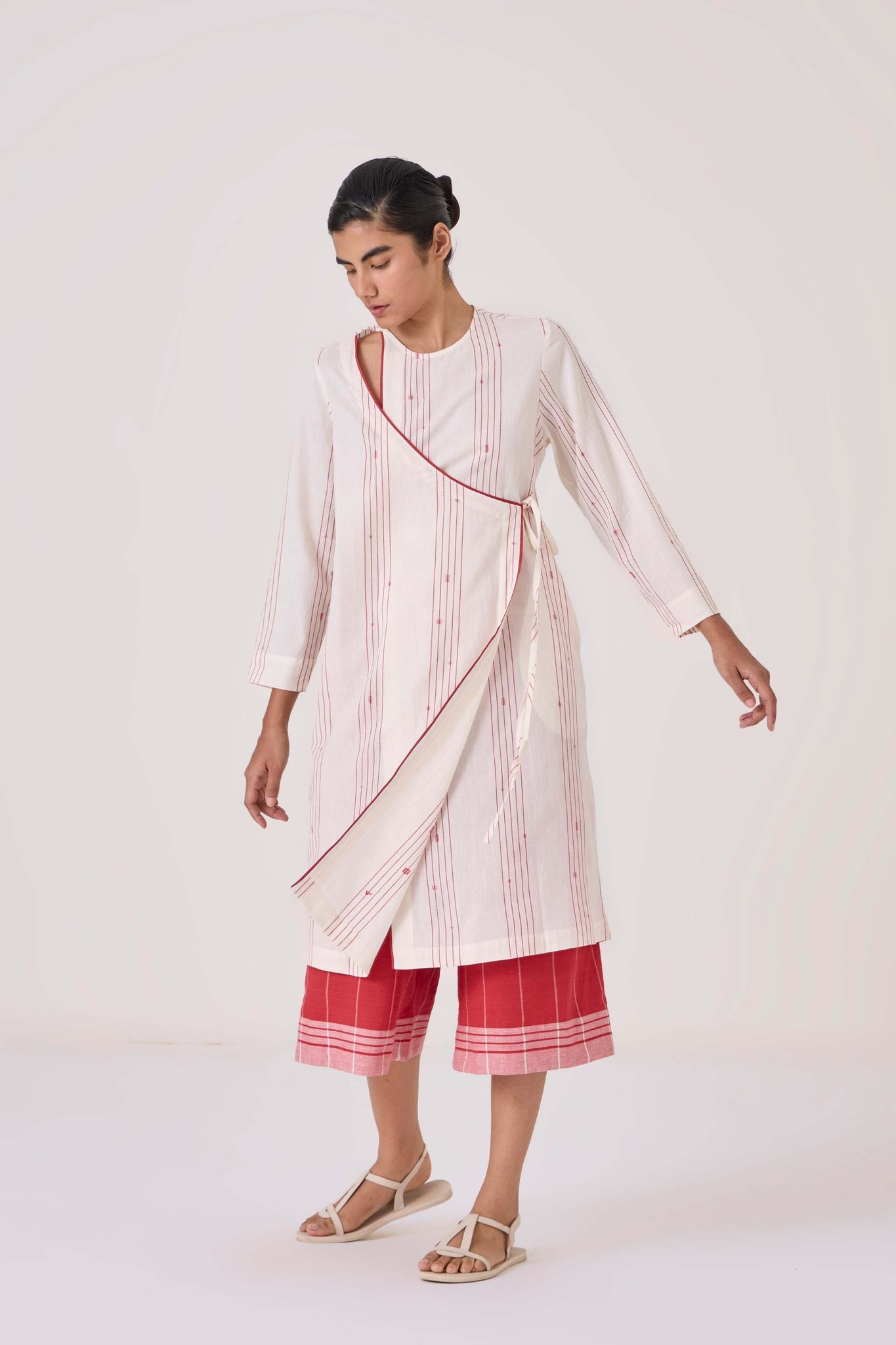 Wrap tunic that combines elegance with modern flair, crafted from fine Jamdani cotton. Features piping detail, 3/4th length sleeves and a single loop button fastening on the shoulder.