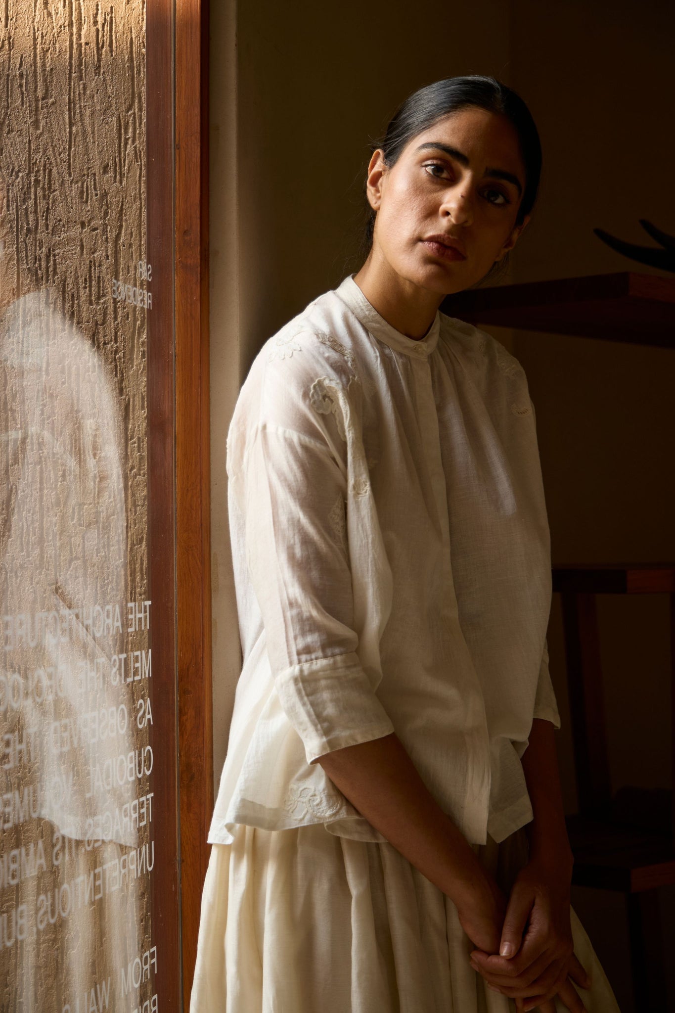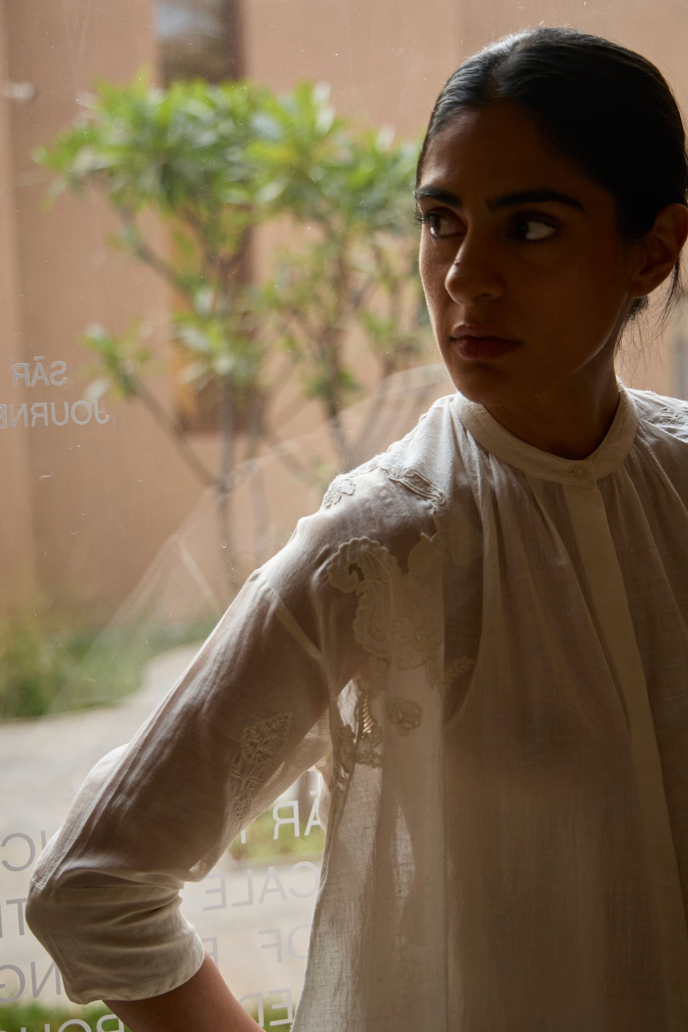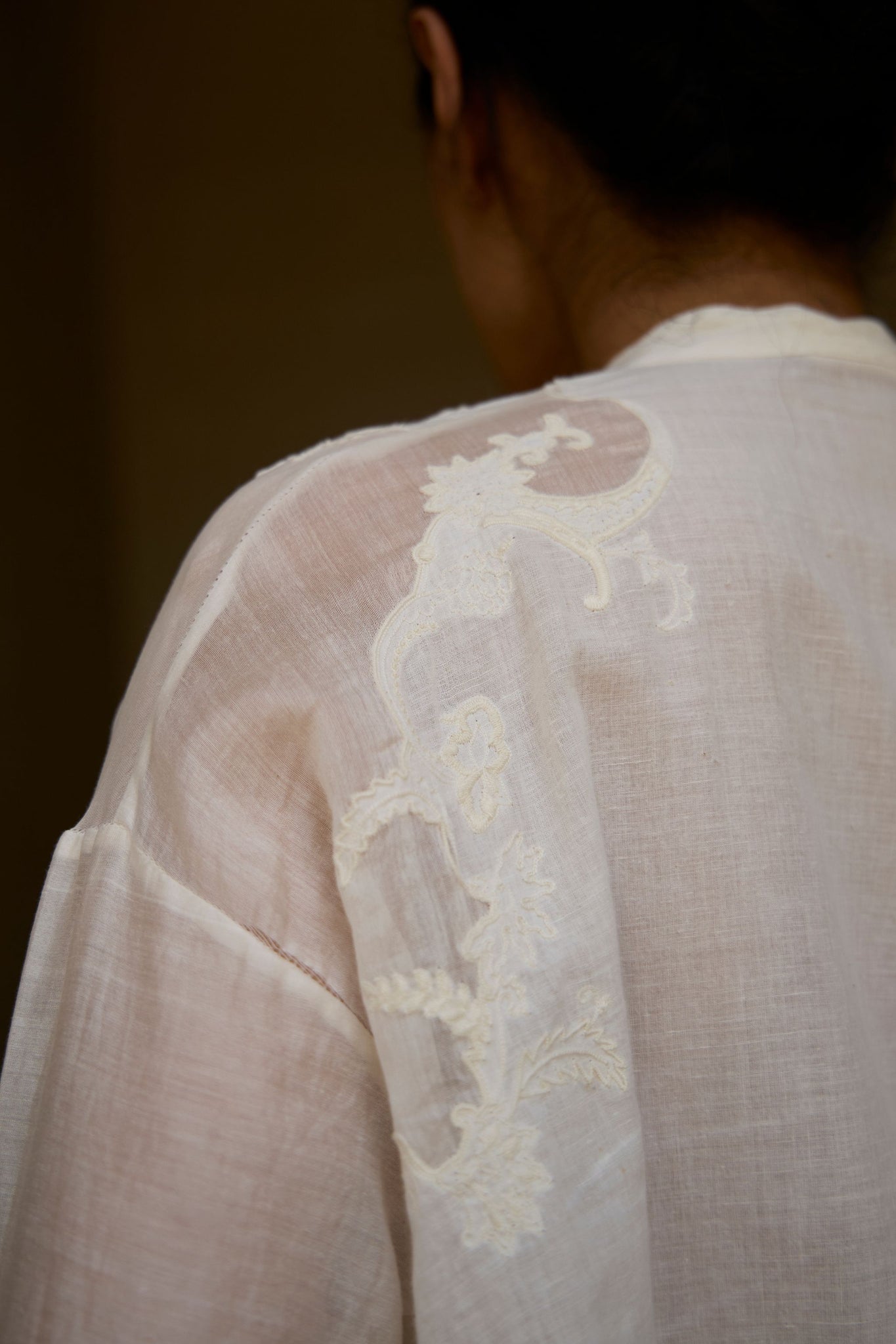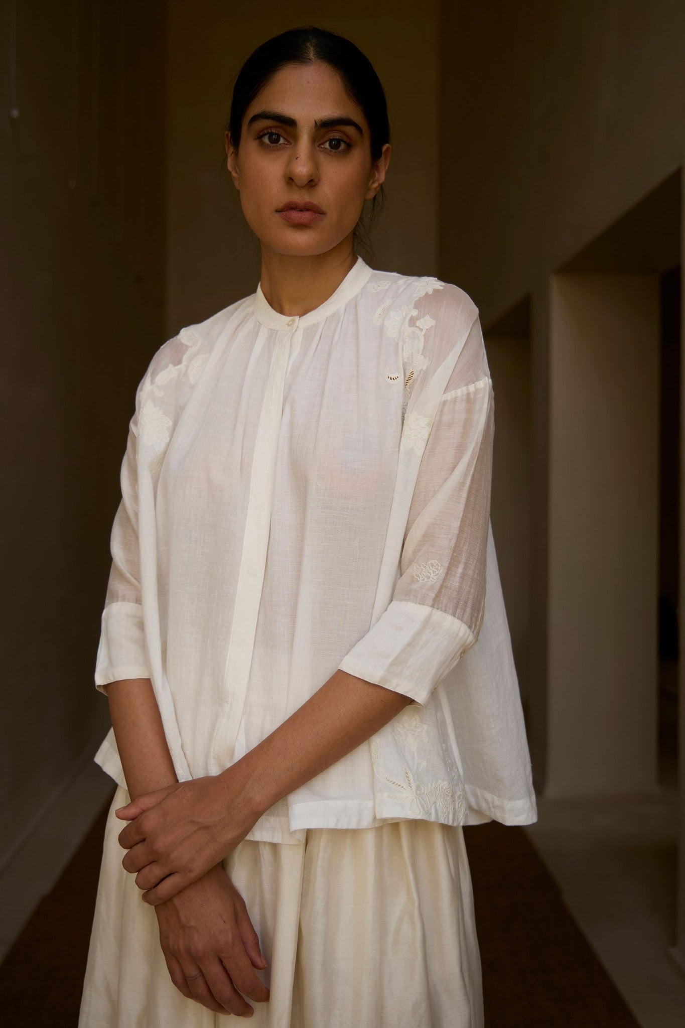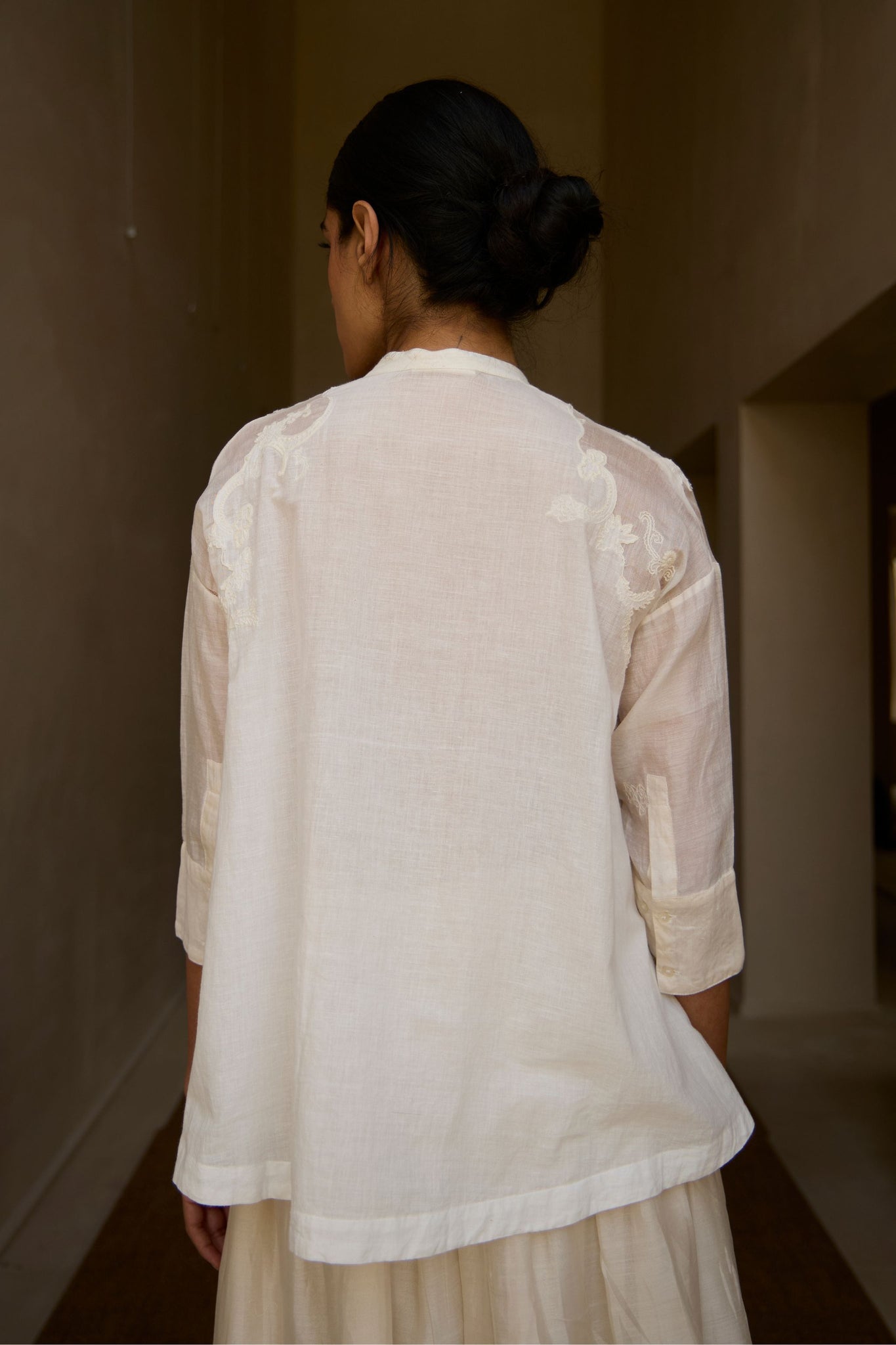 Crafted from handwoven cotton, with sleeves in chanderi. This garment is embroidered by hand in The Summer House studio. Slight differences in embroidery speak to the hand process involved.