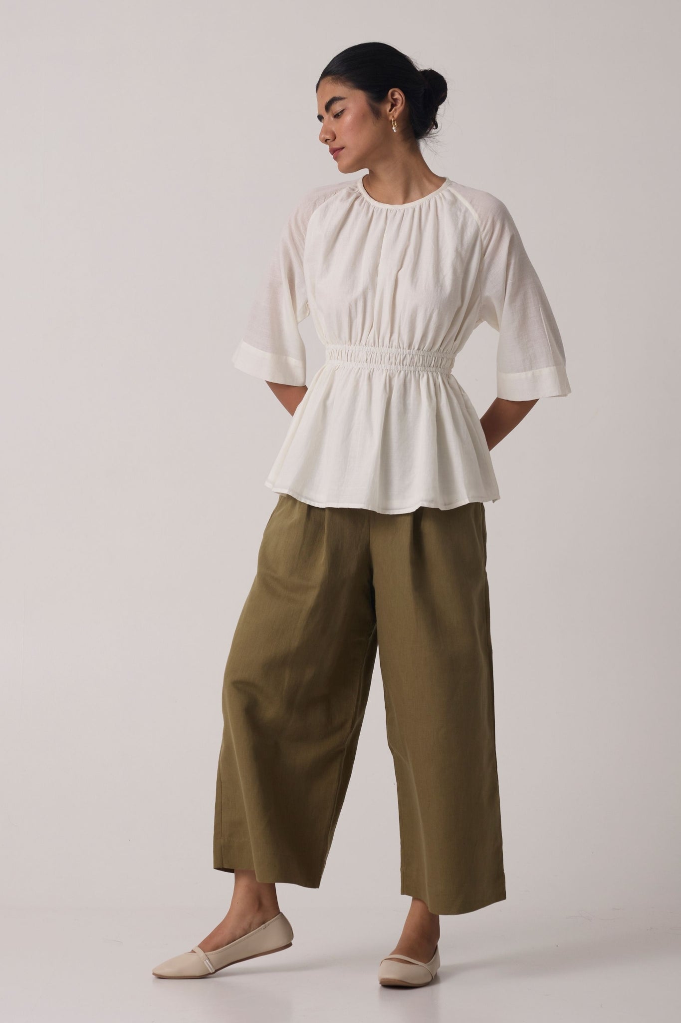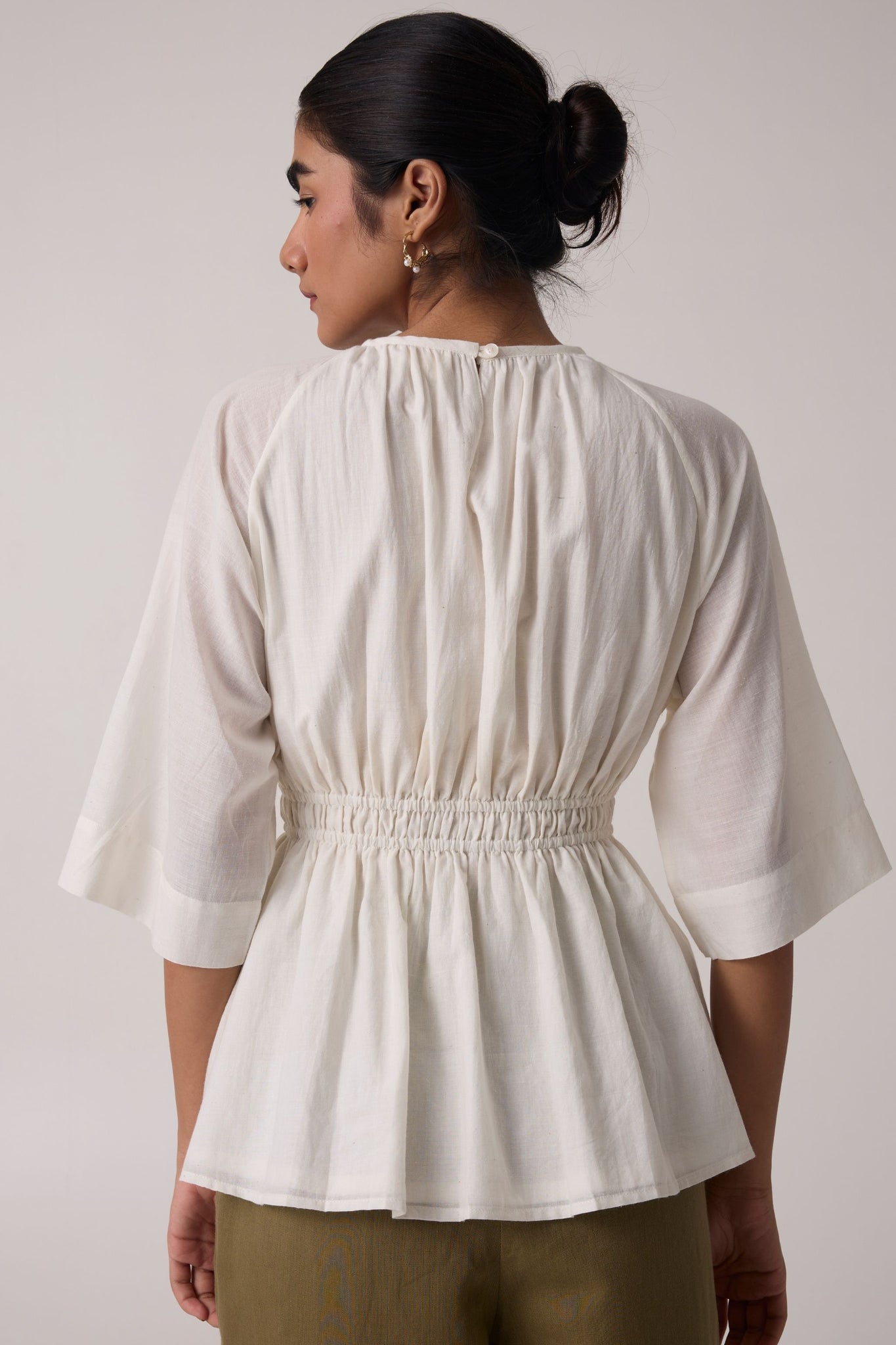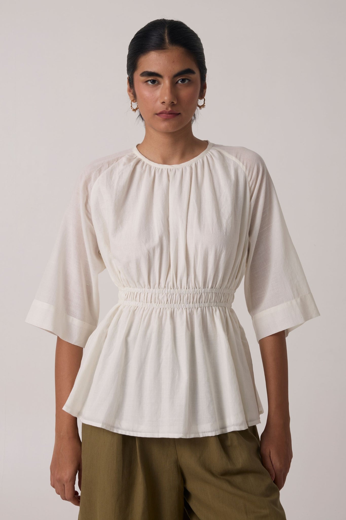 This top has a round neckline with a back loop button fastening. Drop sleeves. Ruching at the waist create a cinched look. Fully lined.