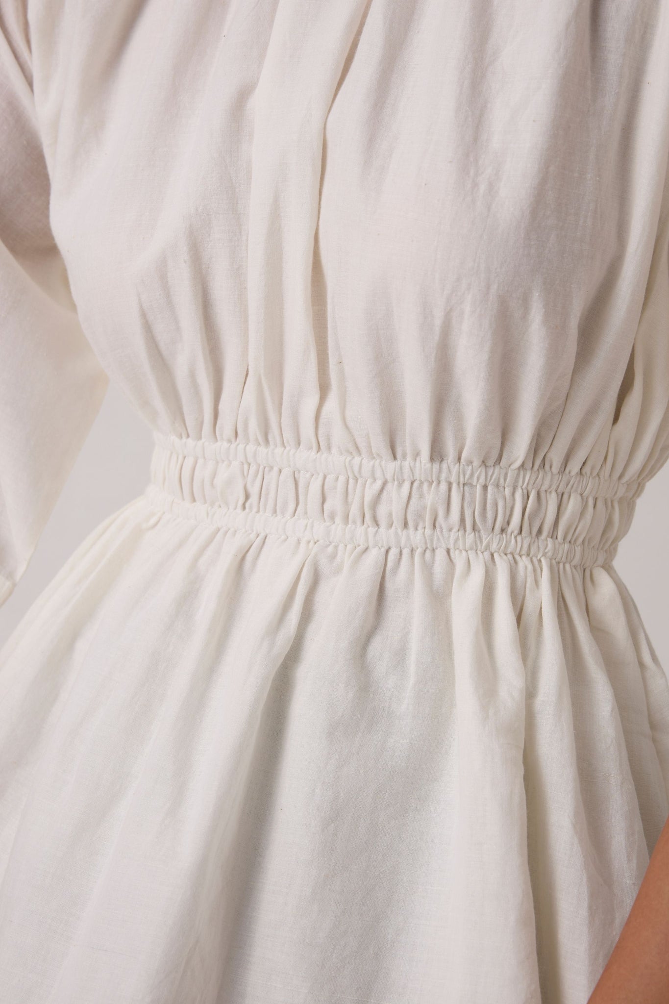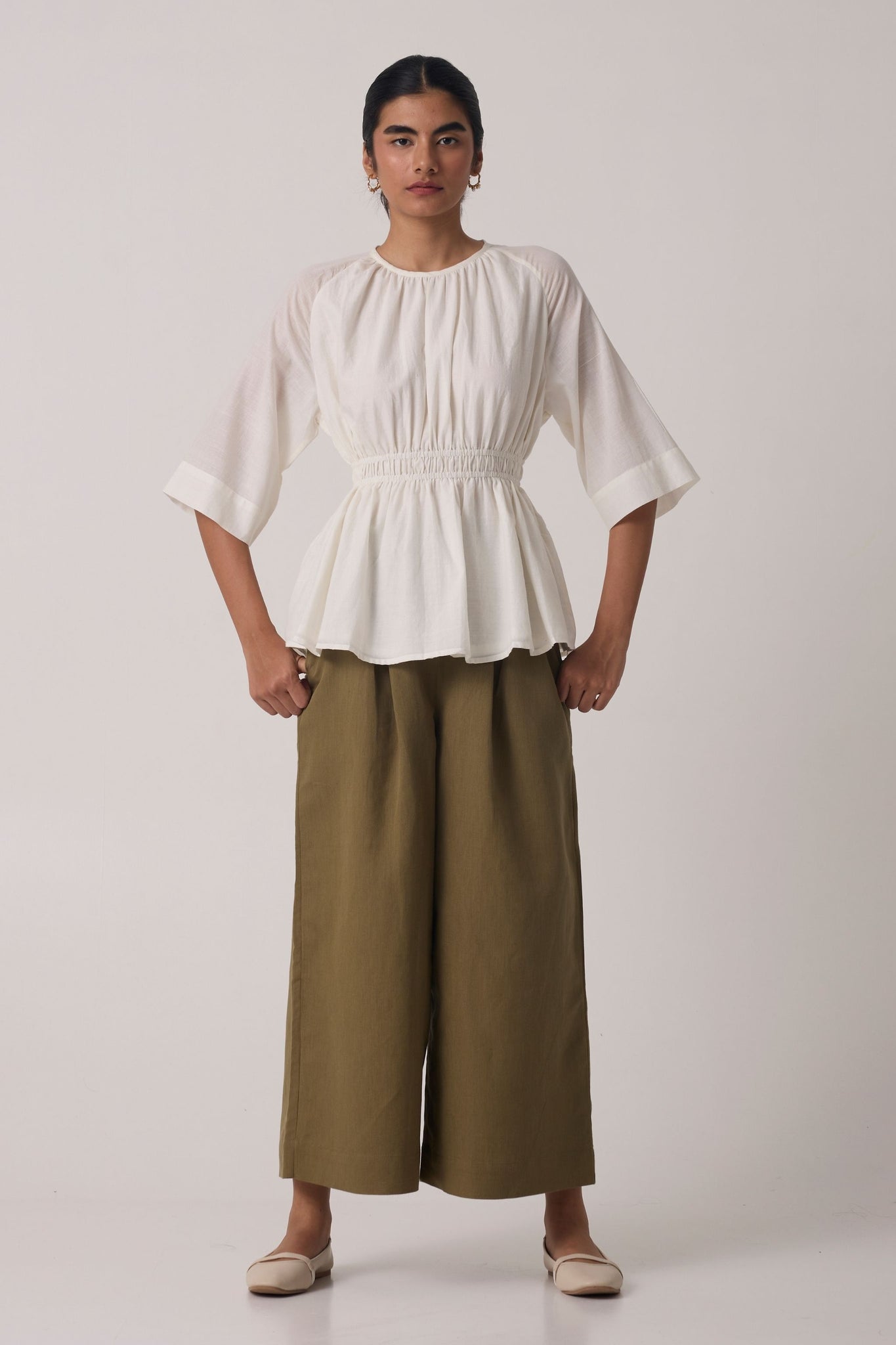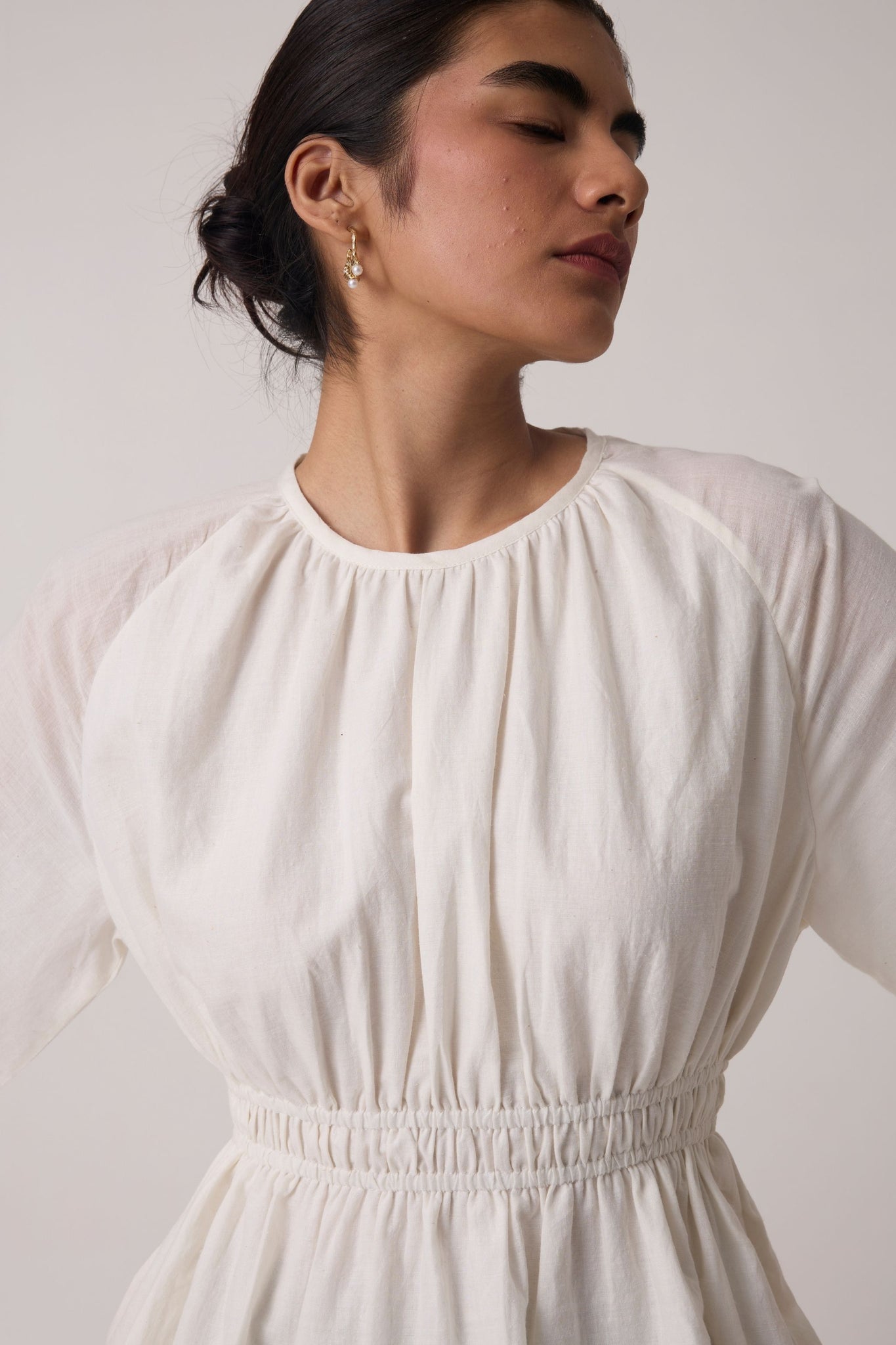 This top has a round neckline with a back loop button fastening. Drop sleeves. Ruching at the waist create a cinched look. Fully lined.