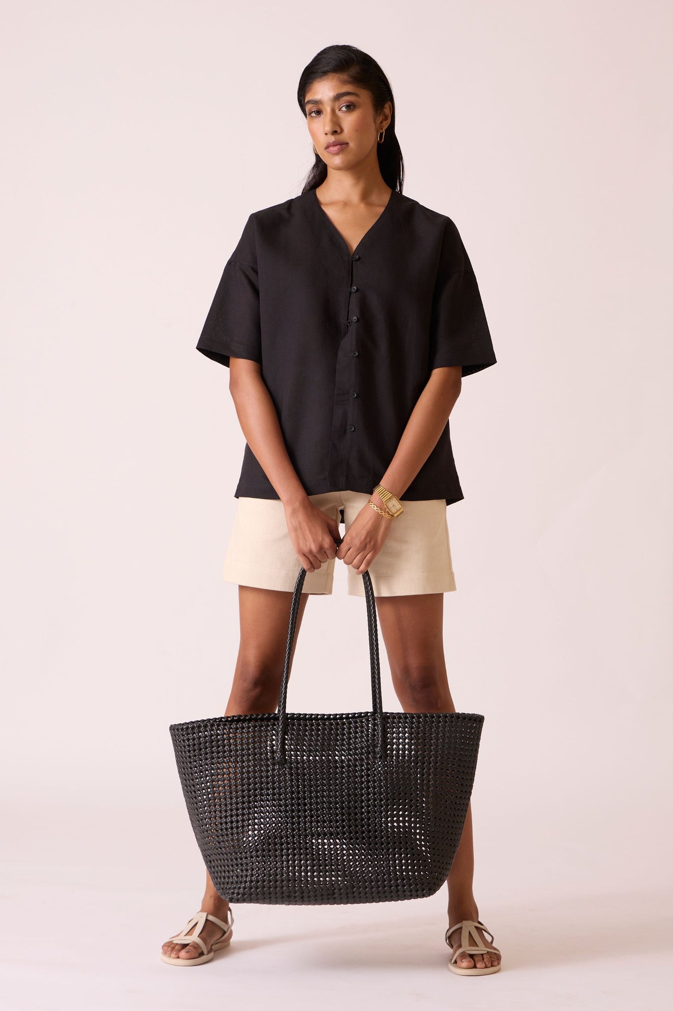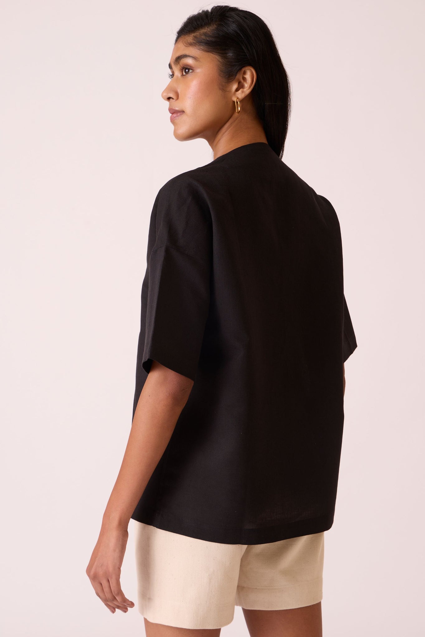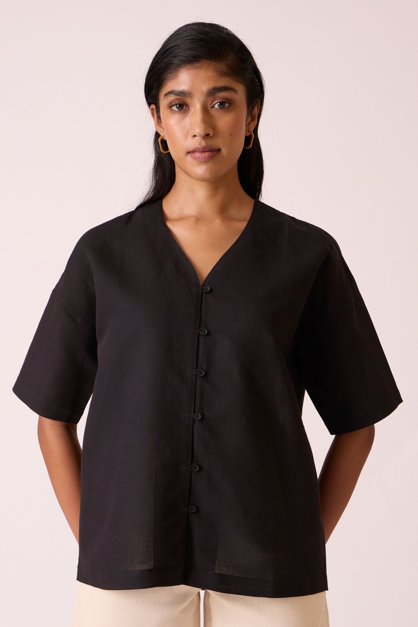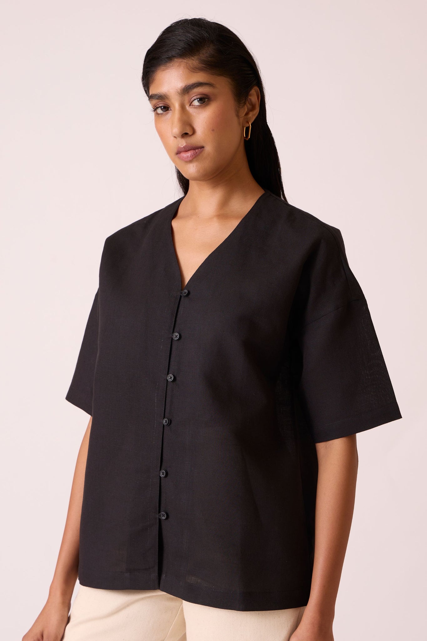 V neck top crafted from tactile linen cotton in deep black. Button down with loops. Drop sleeves.
