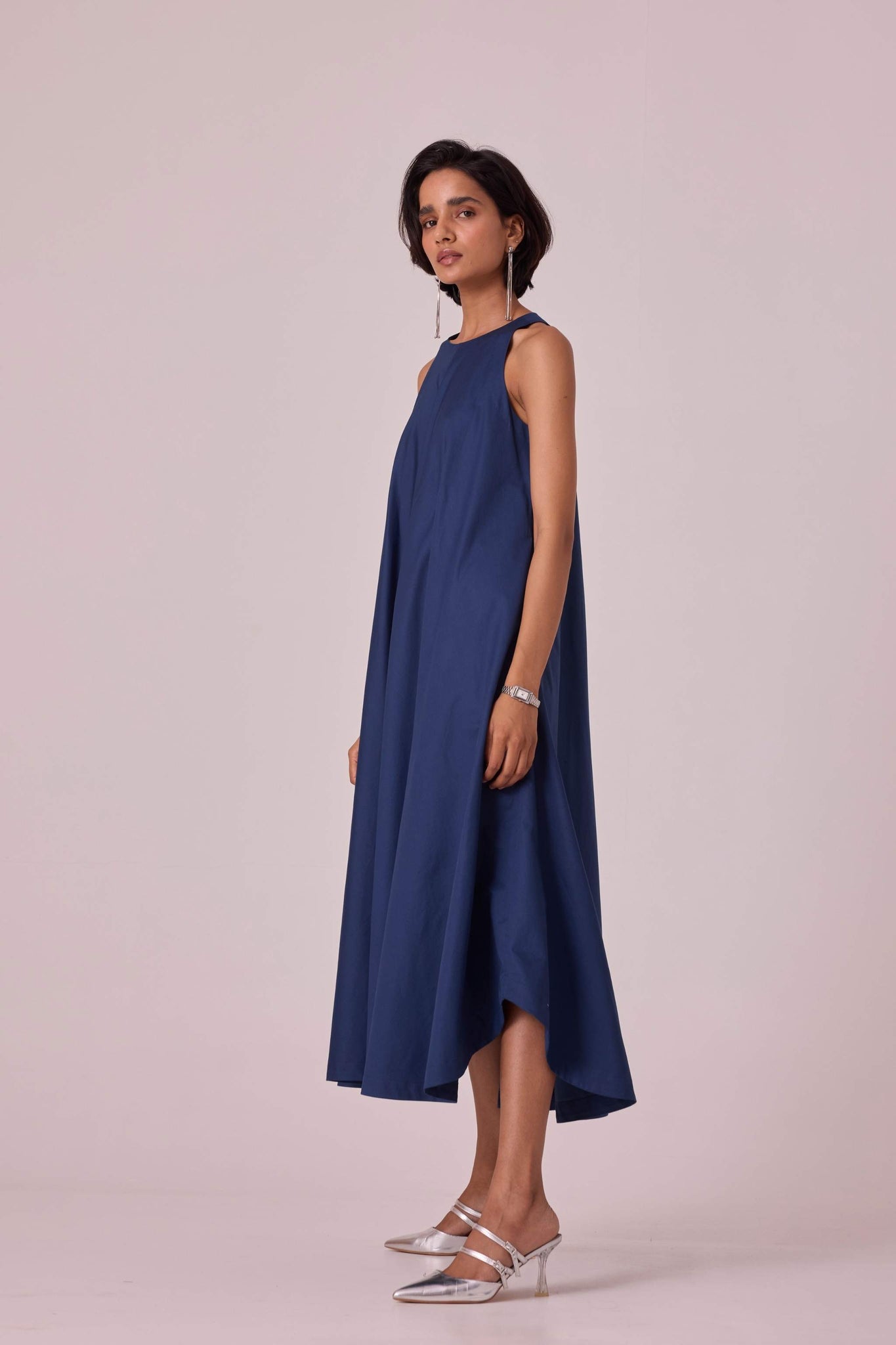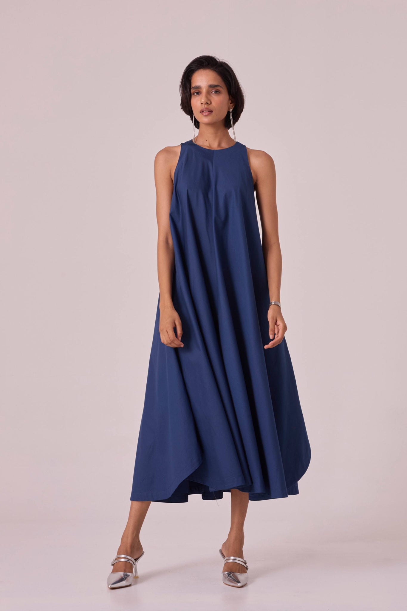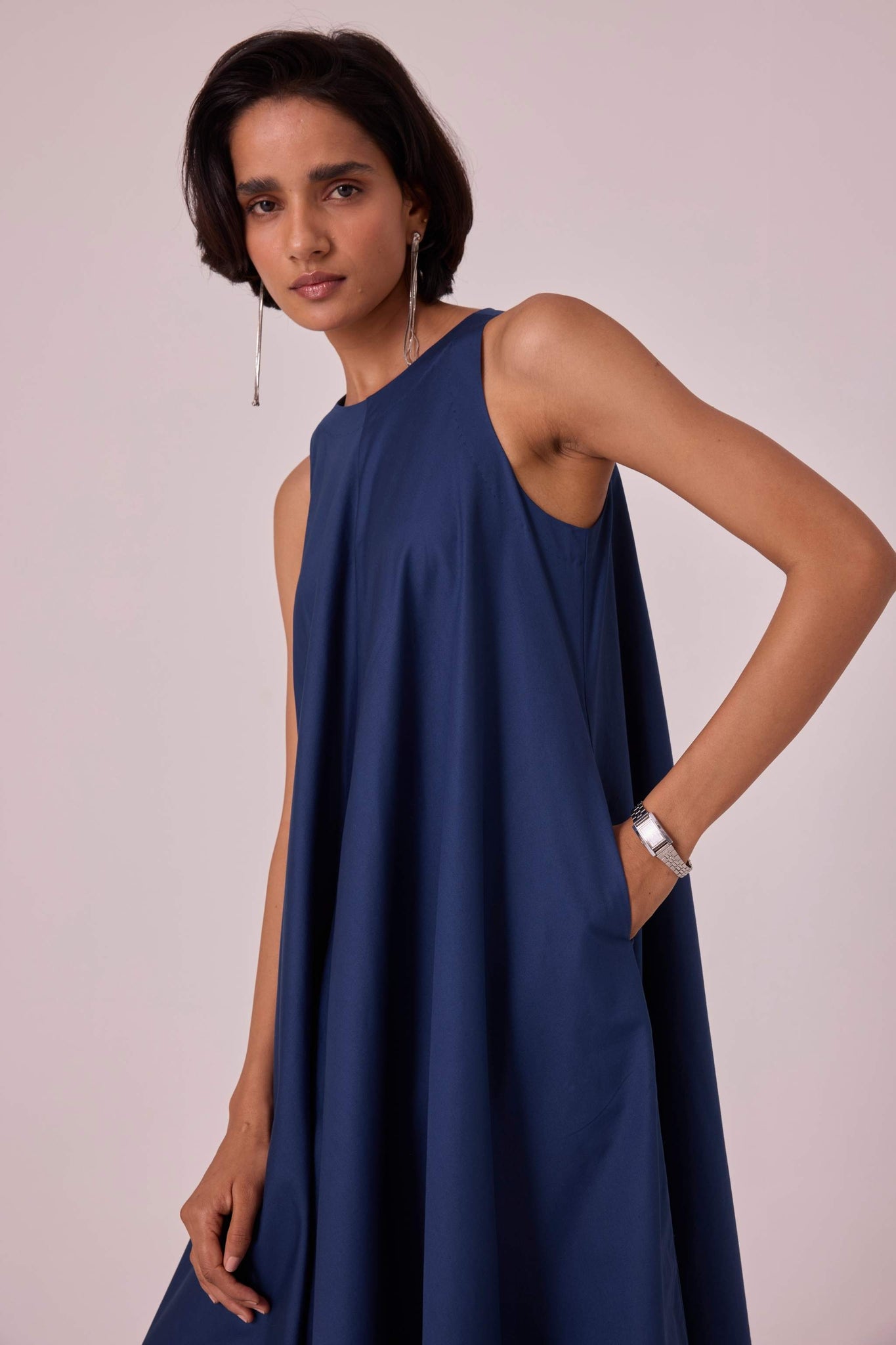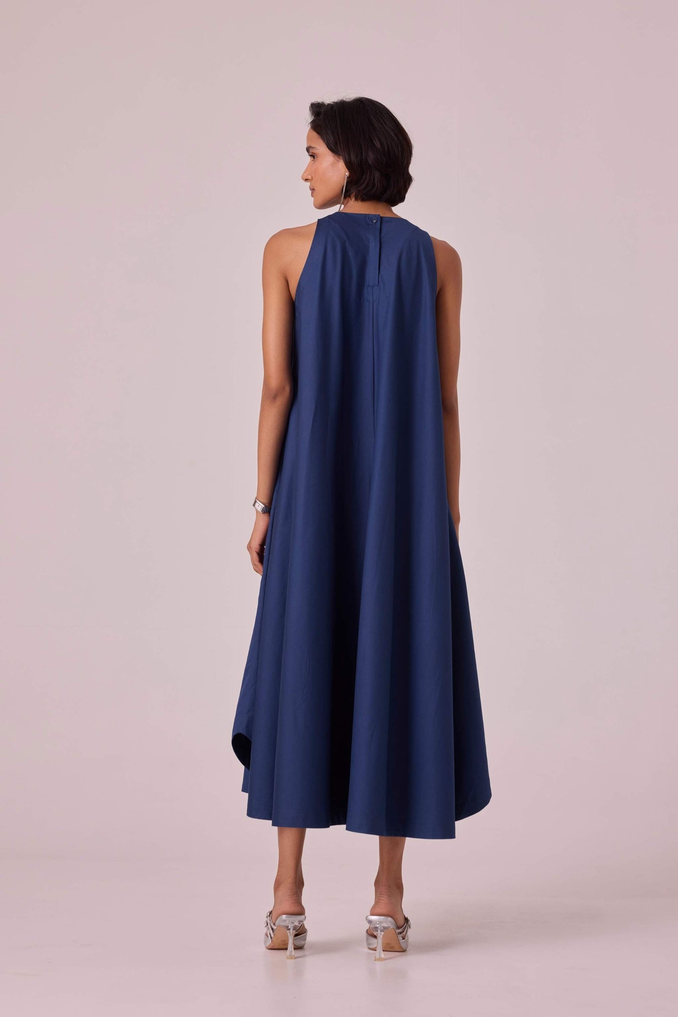 Midi dress with bounteous flare featuring a slight high low hem. Modern high neckline with cutaway shoulders. Pairs well with a belt too. Inseam pockets.