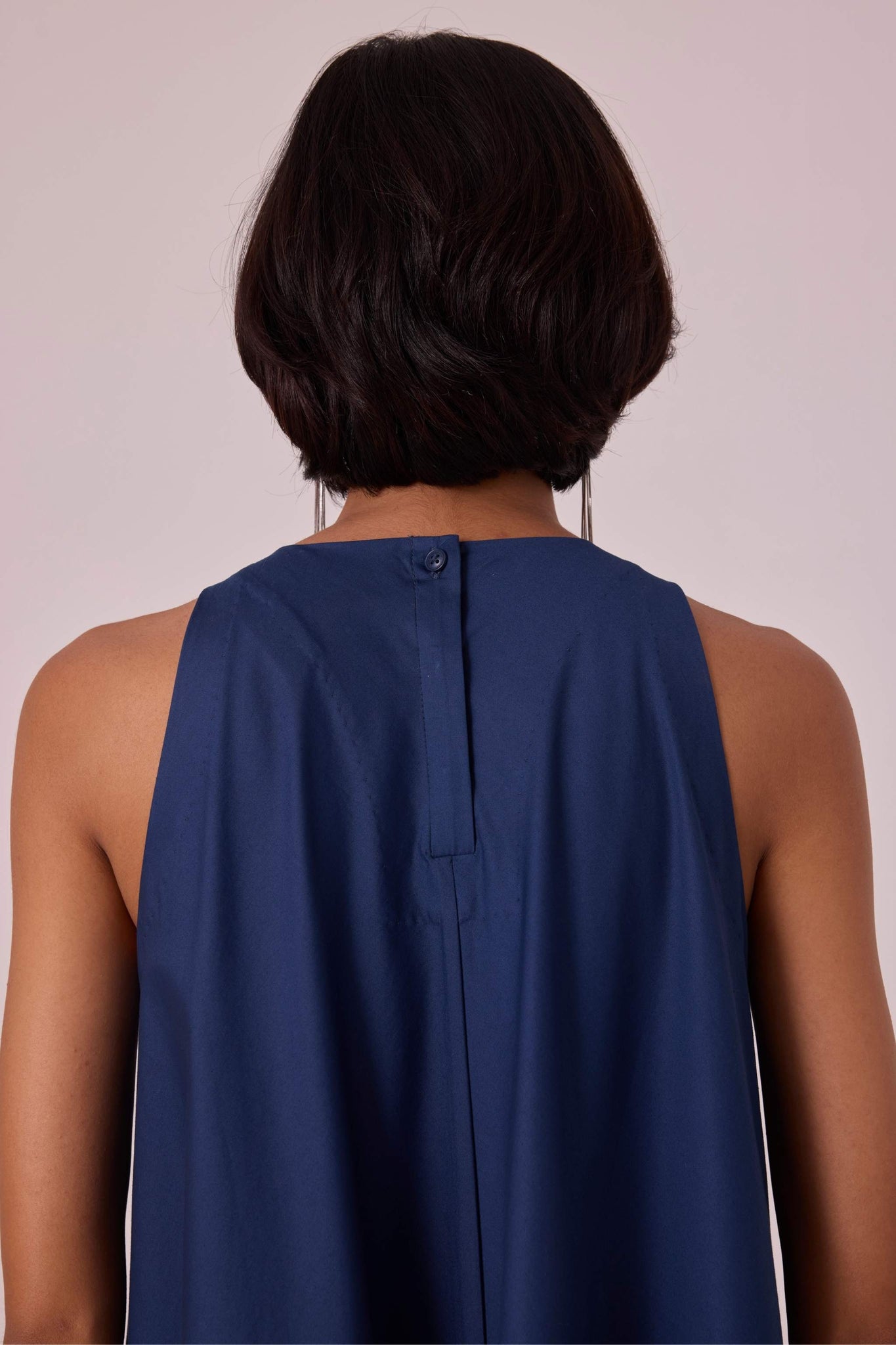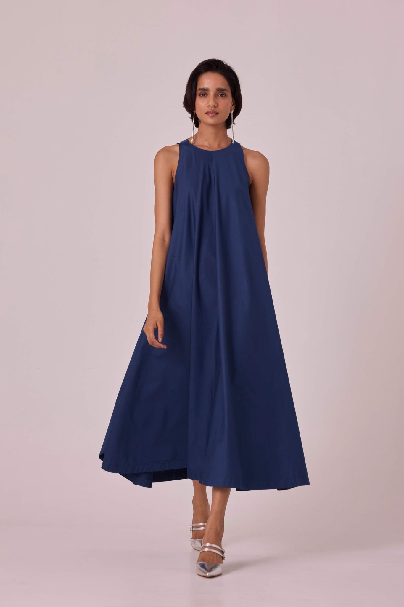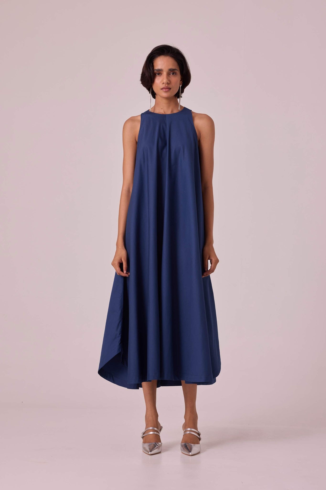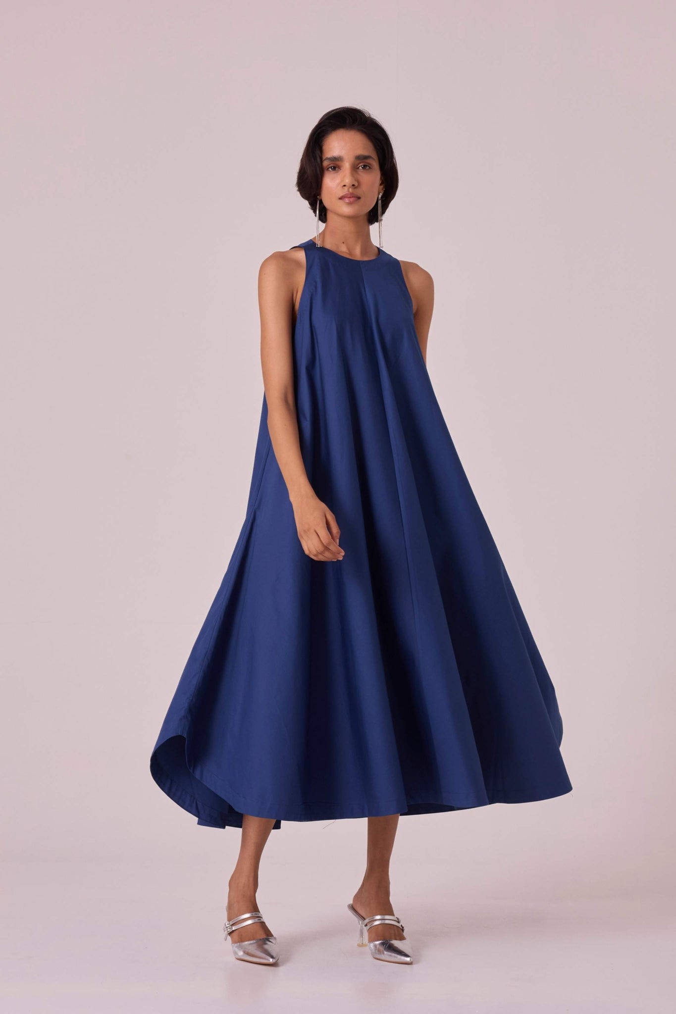 Midi dress with bounteous flare featuring a slight high low hem. Modern high neckline with cutaway shoulders. Pairs well with a belt too. Inseam pockets.