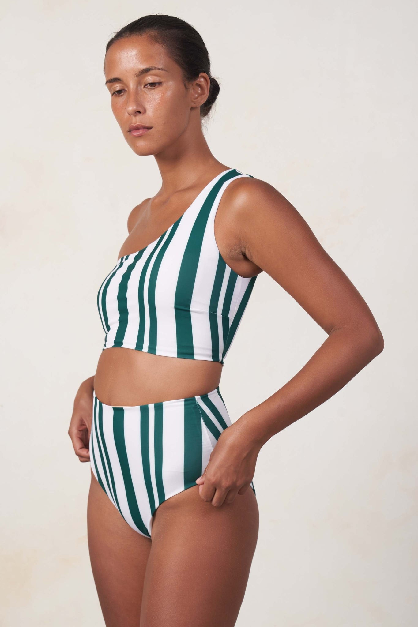One shoulder bikini top. An enduring style with removable padding. Perfect for days by the poolside.