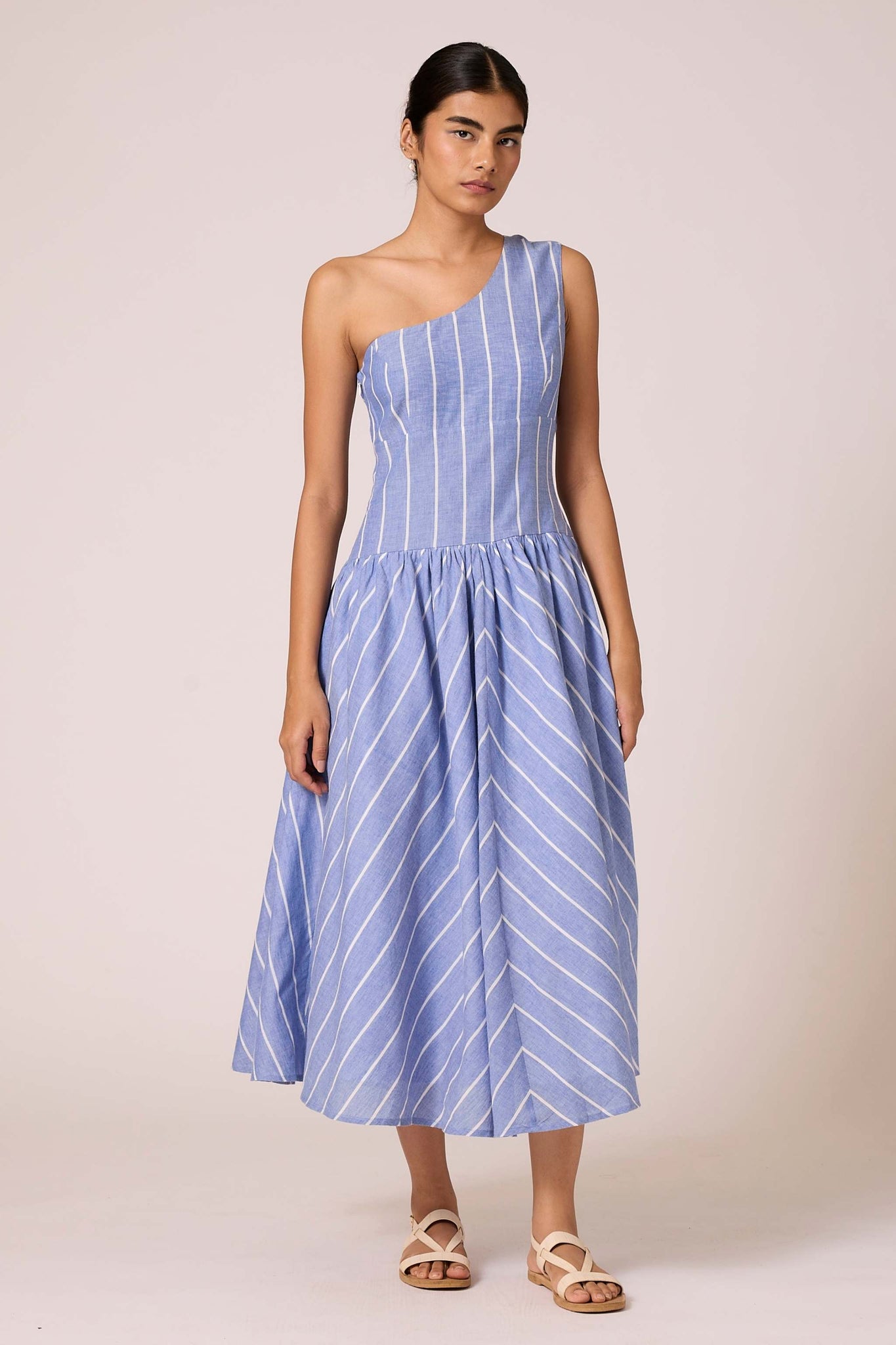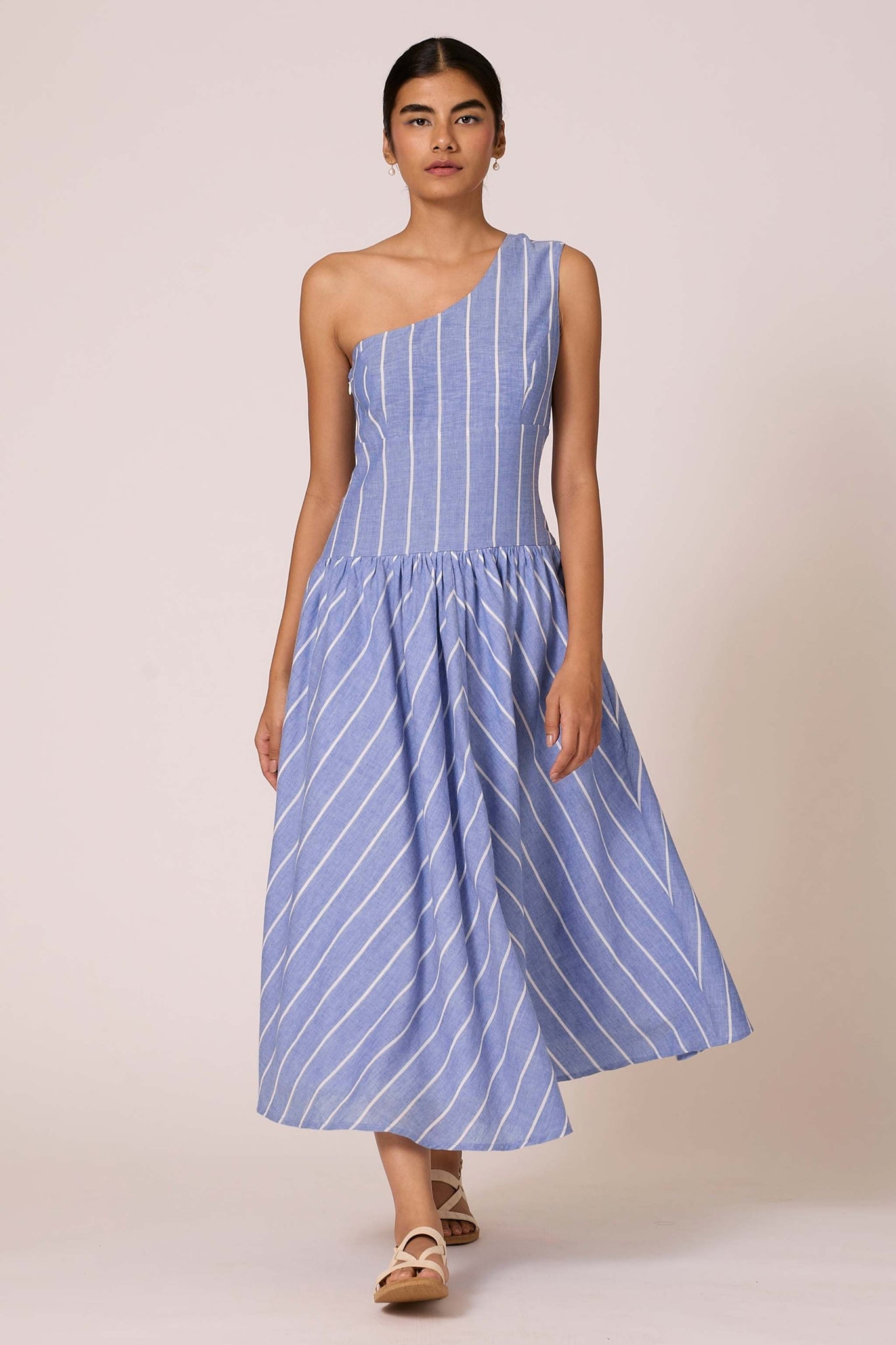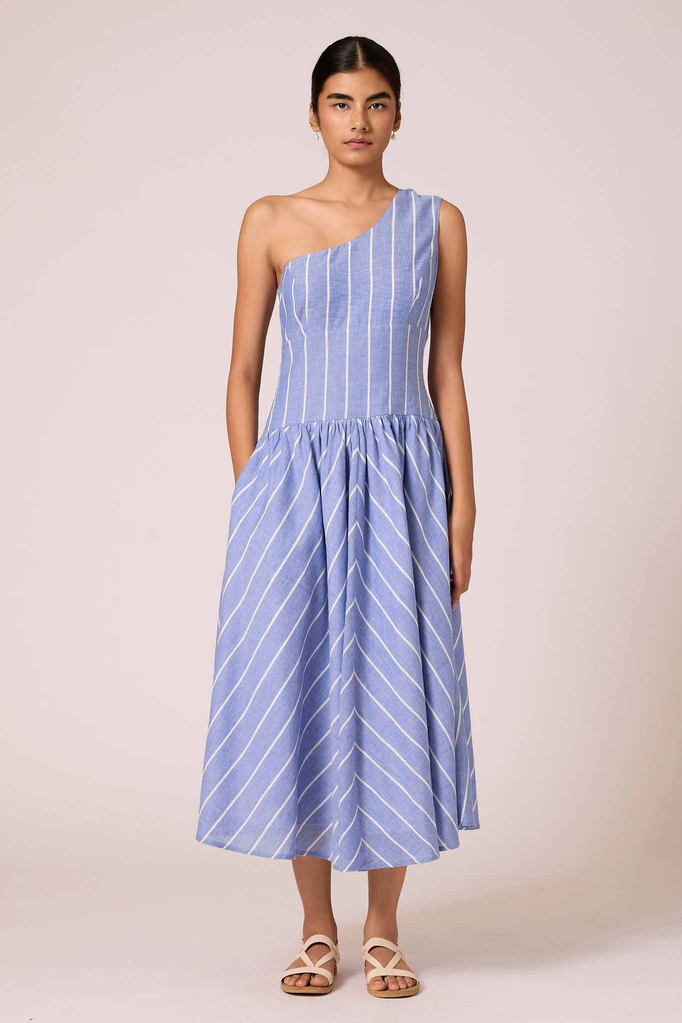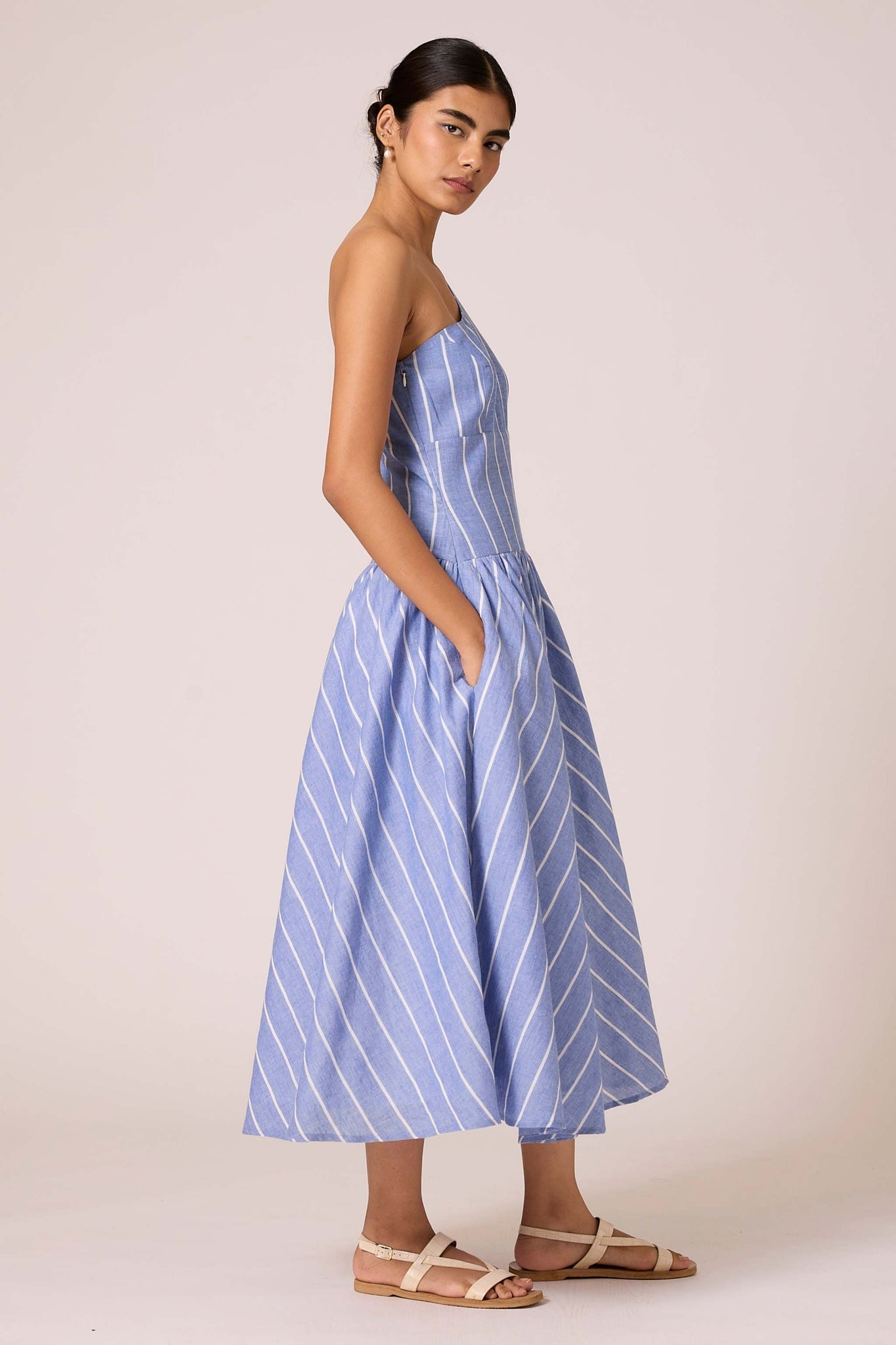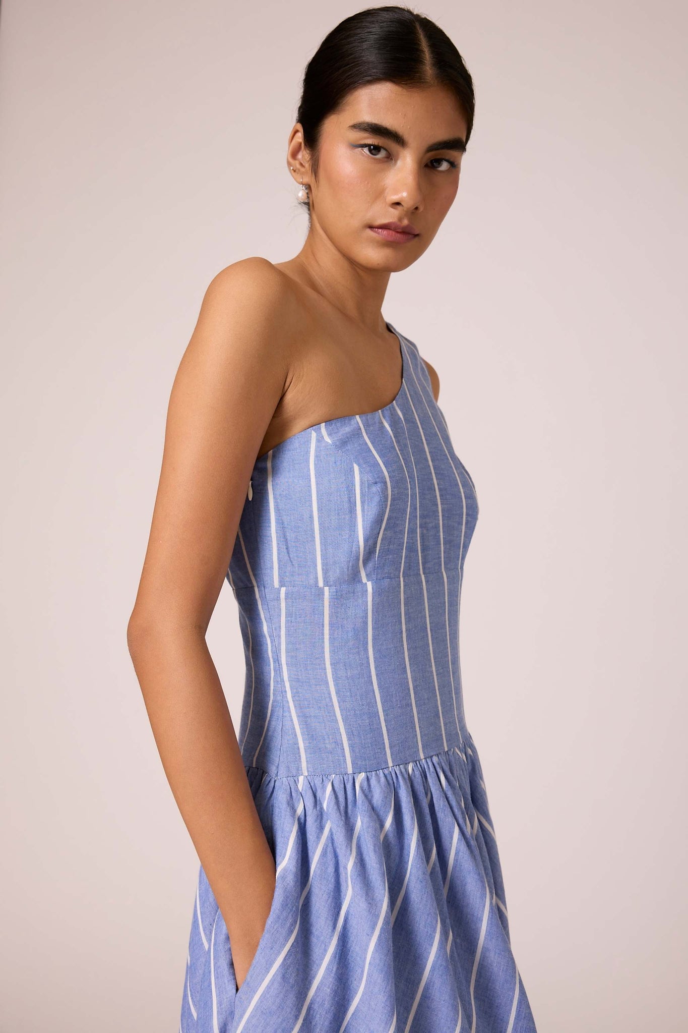 A timeless handwoven cotton midi dress. Featuring a one-shoulder design, tailored fit with darts, and a wide waistband. Side zipper and inseam pocket add practical flair. Lined bottom ensures comfort.
