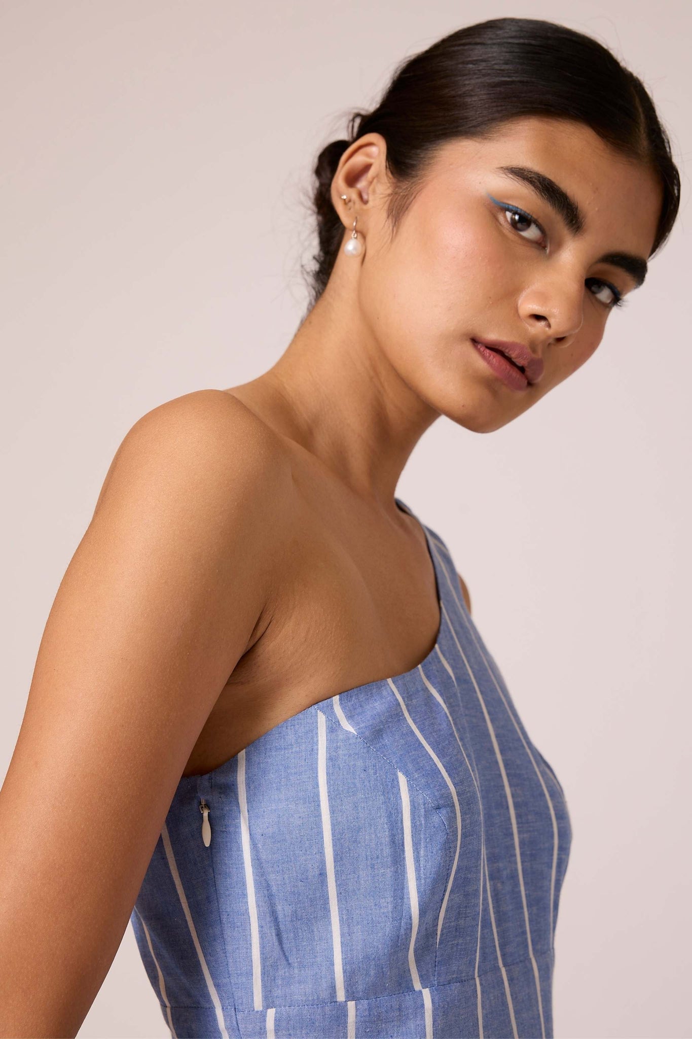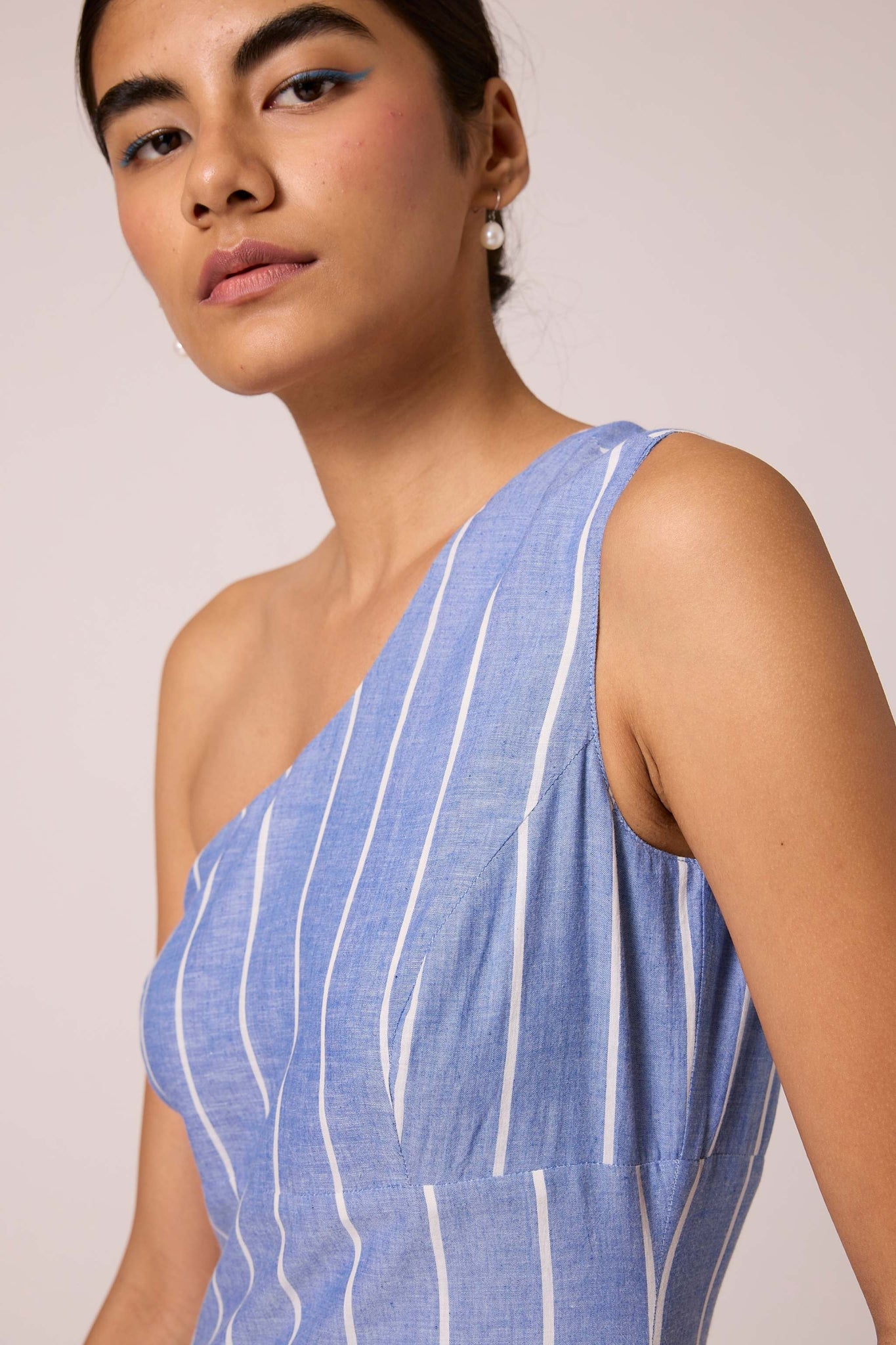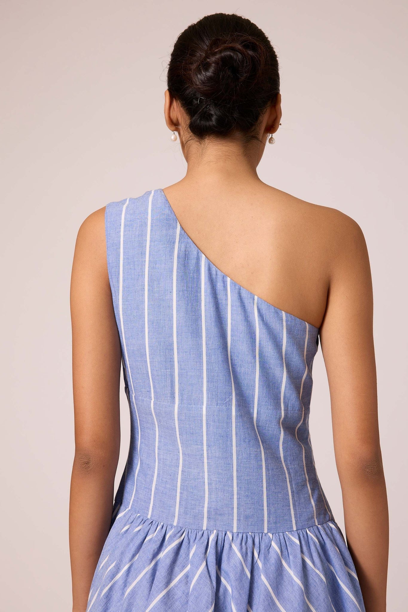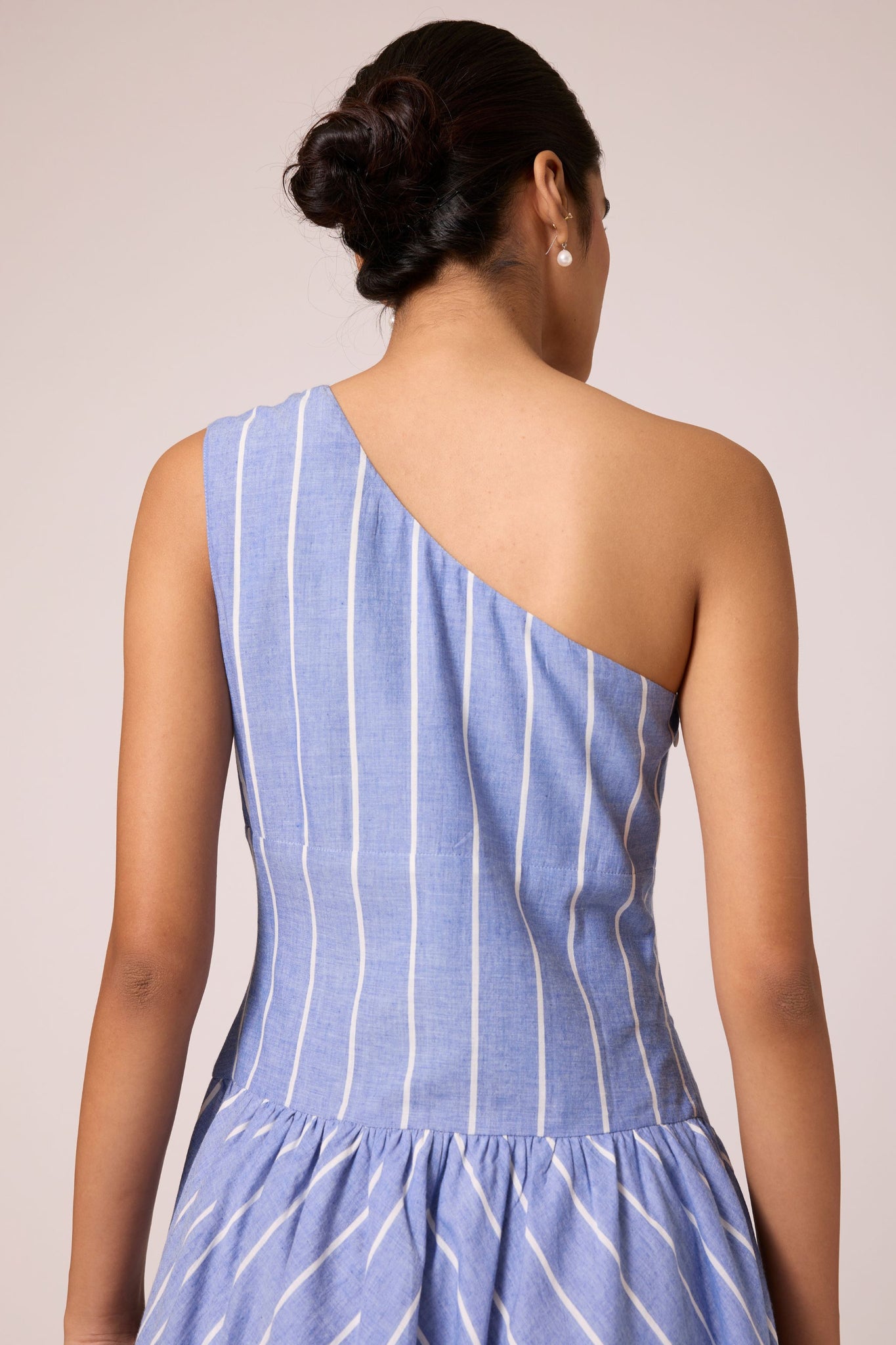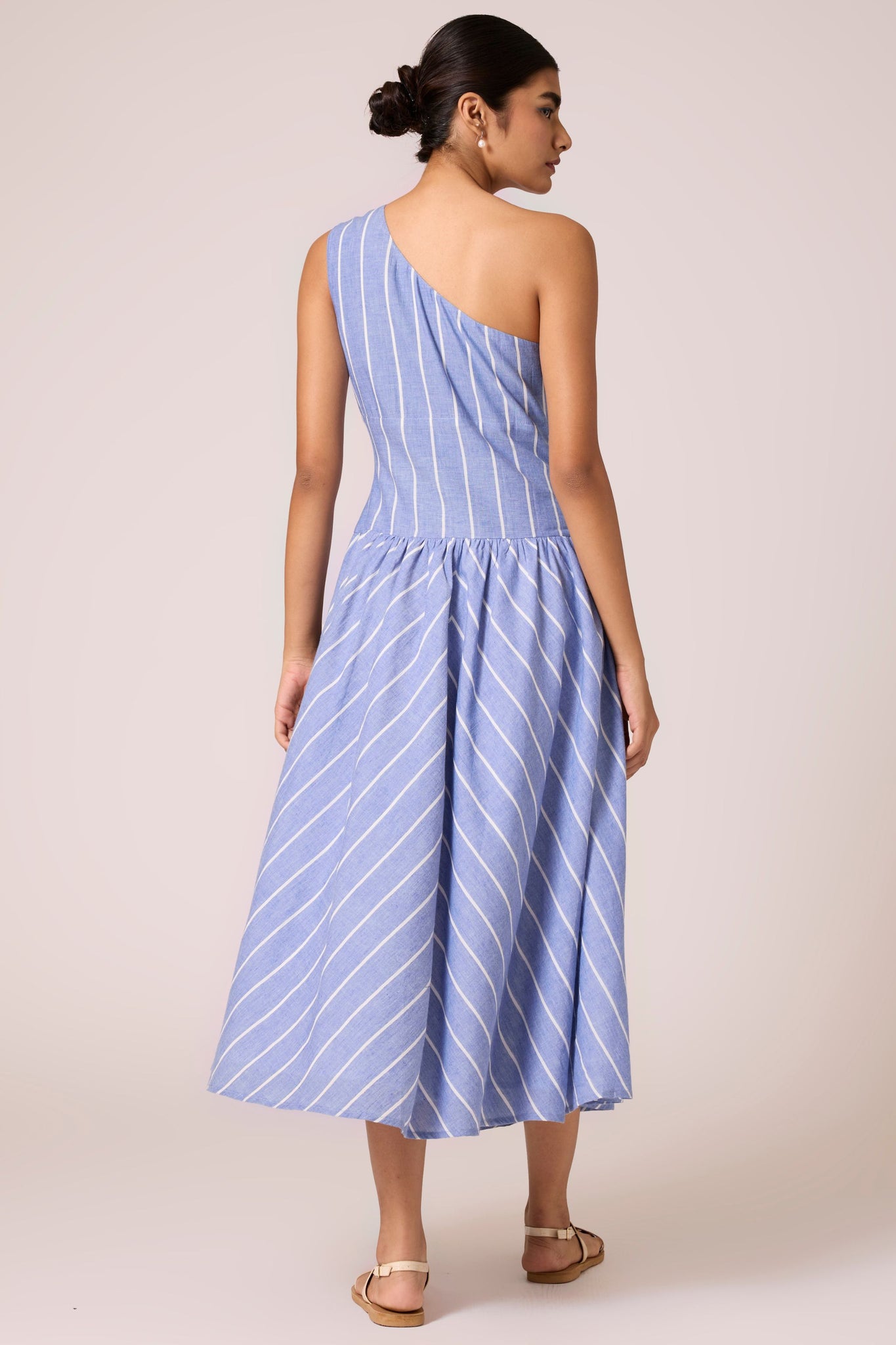 A timeless handwoven cotton midi dress. Featuring a one-shoulder design, tailored fit with darts, and a wide waistband. Side zipper and inseam pocket add practical flair. Lined bottom ensures comfort.