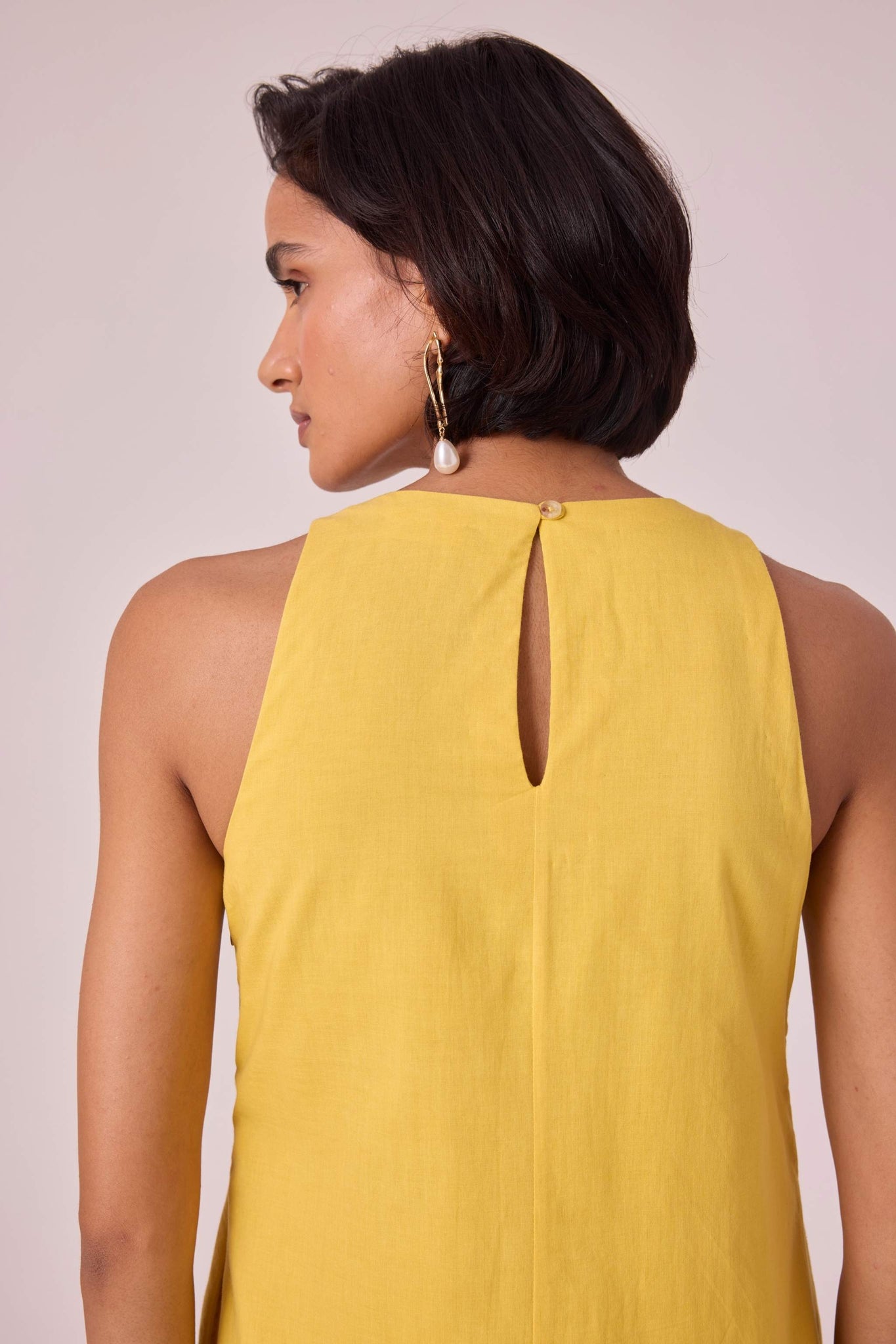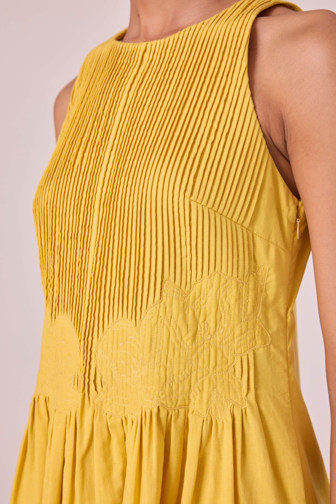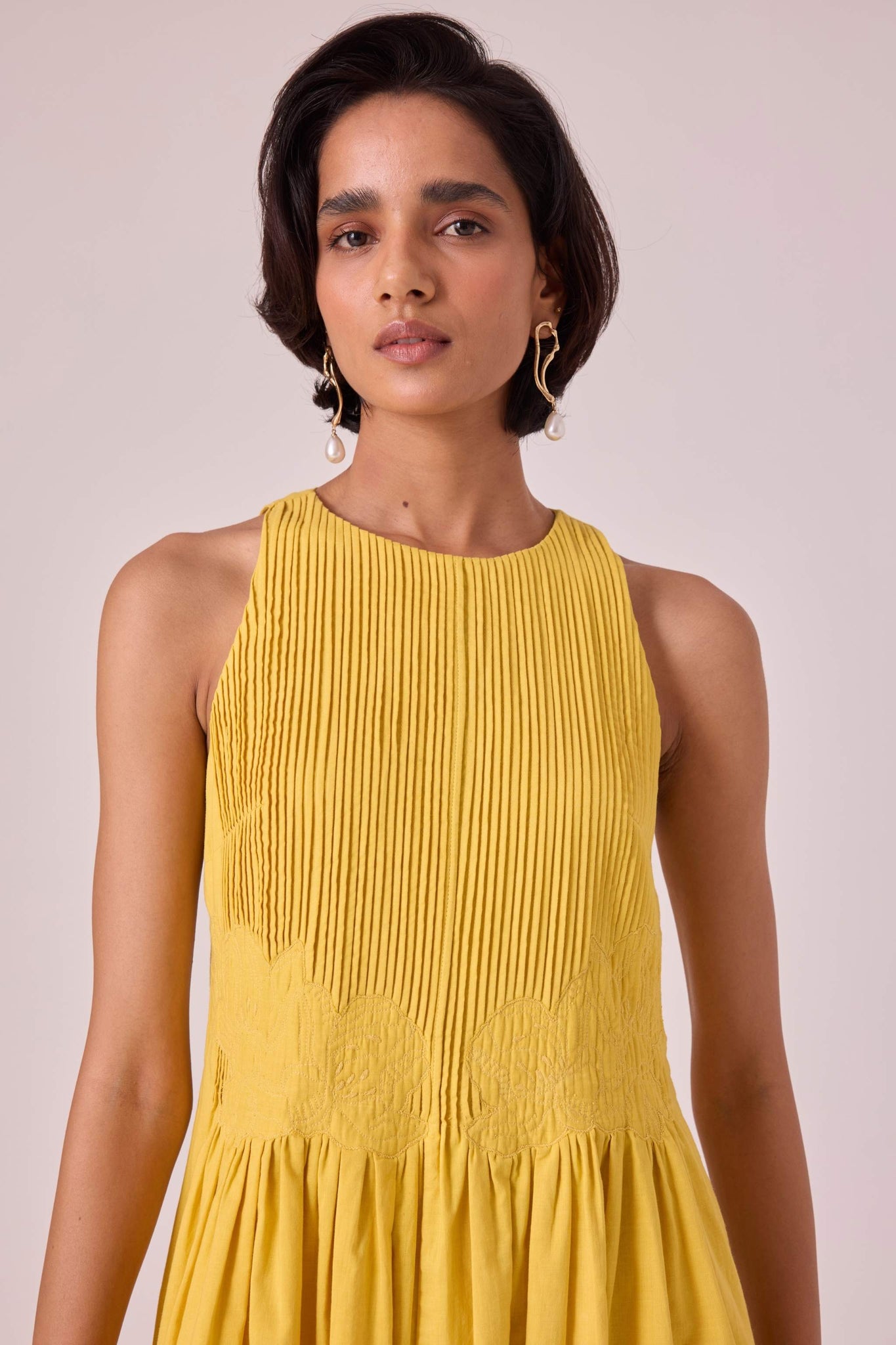 Gathered waist sleeveless dress with fine pintuck bodice. Waist gathers for gentle movement. Single rouleau button at the back.  Side zip for ease.