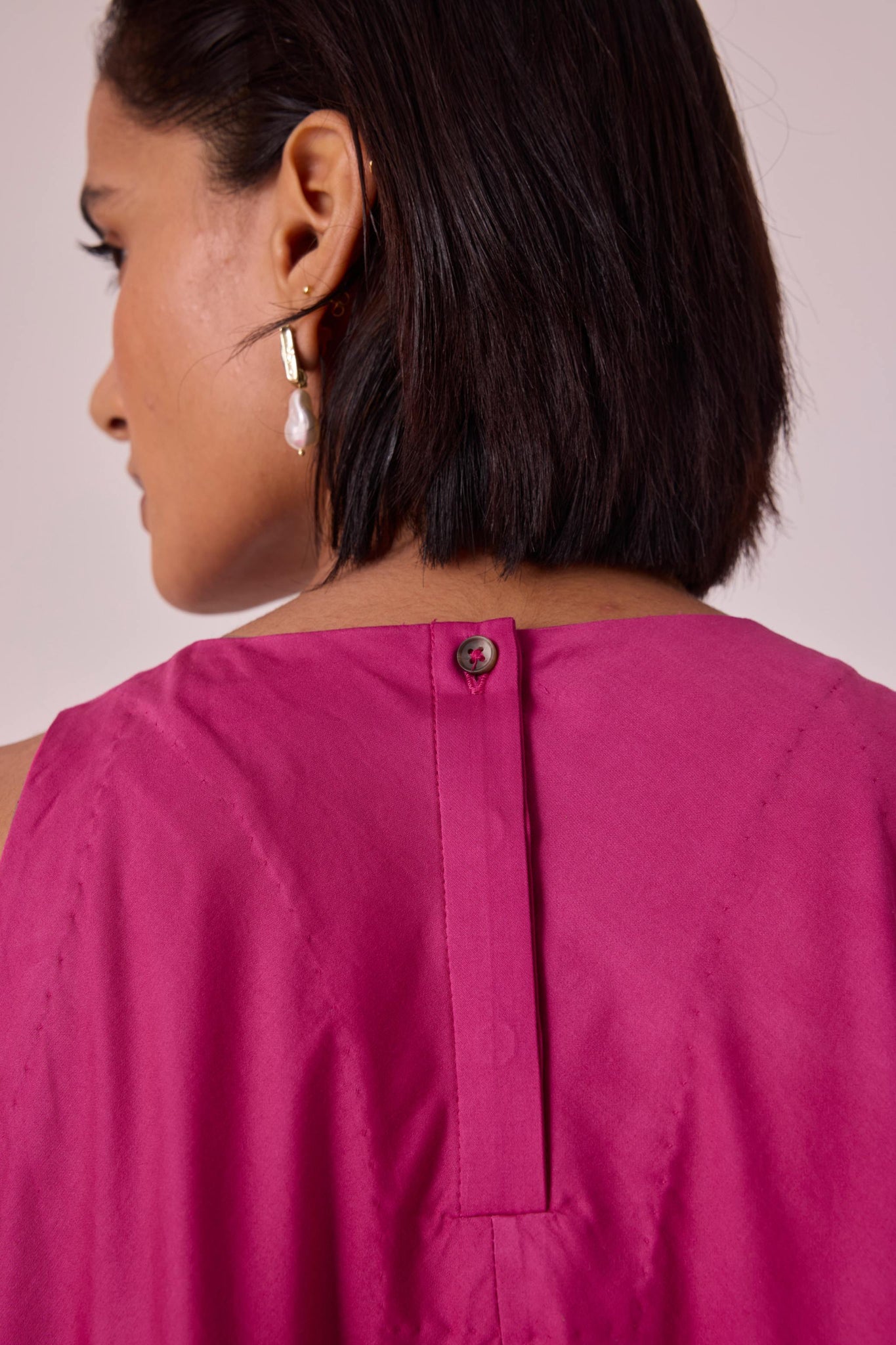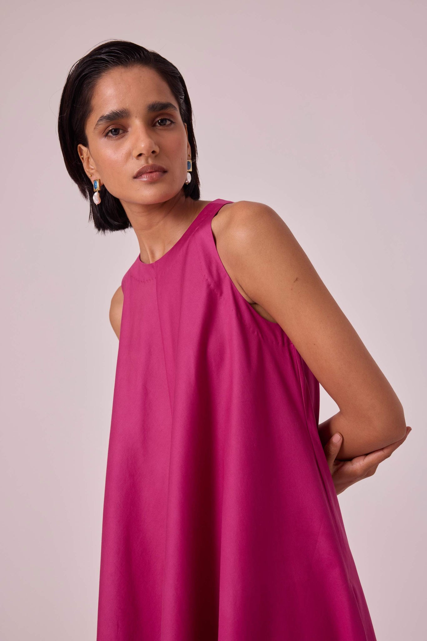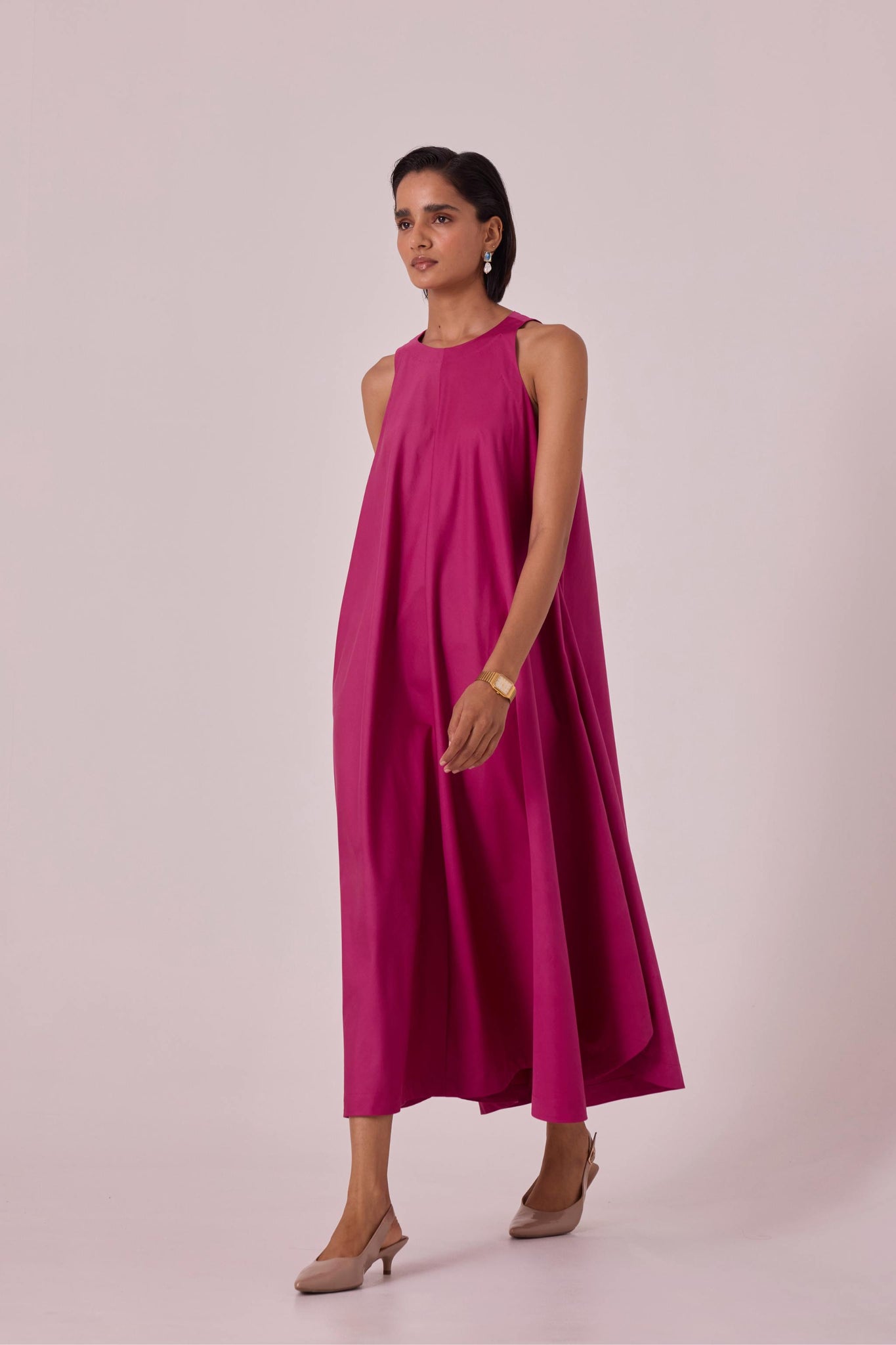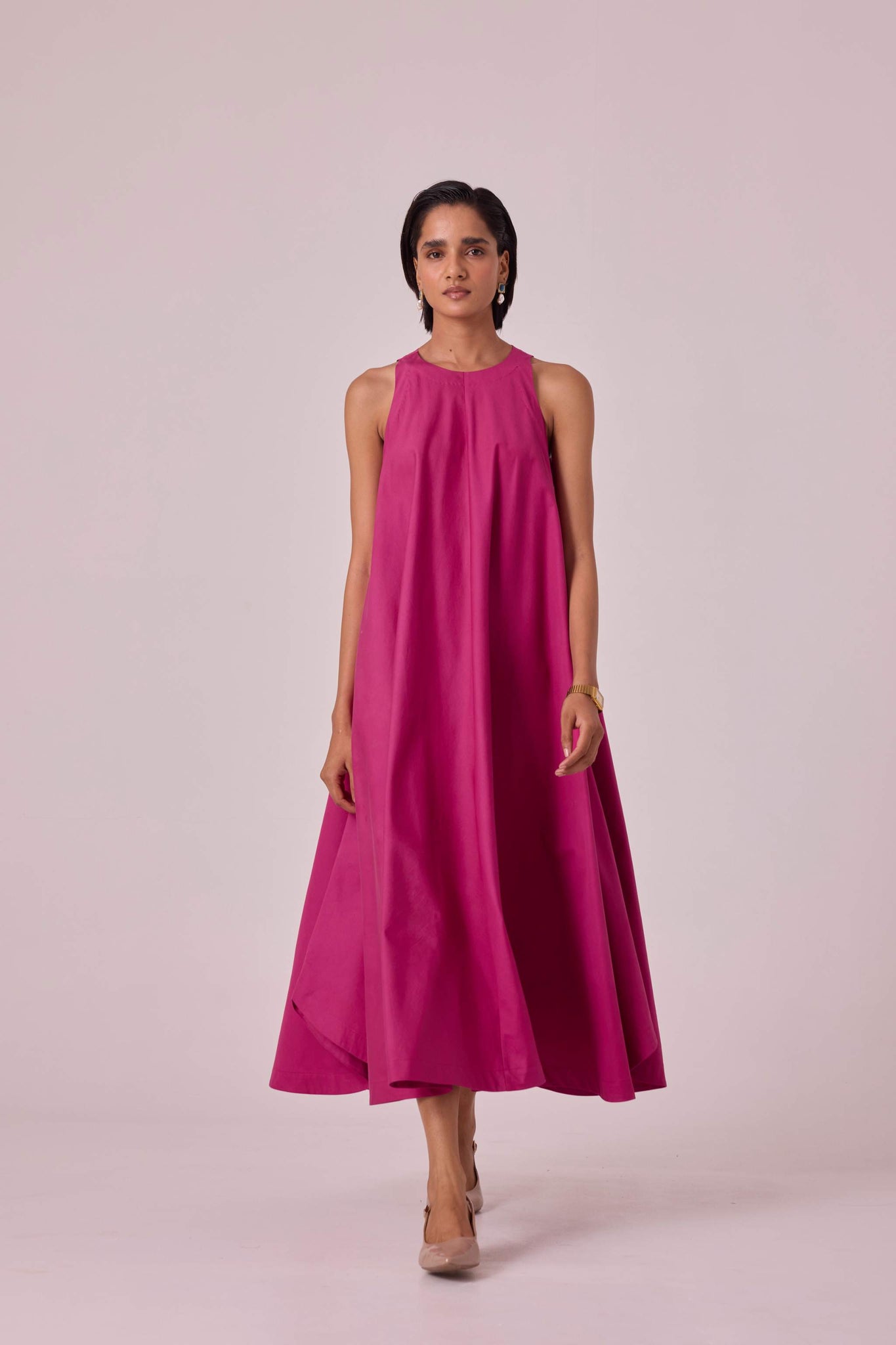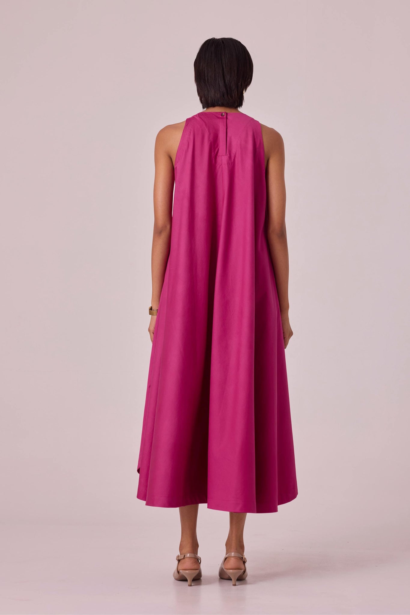 Midi dress with bounteous flare featuring a slight high low hem. Modern high neckline with cutaway shoulders. Pairs well with a belt too. Inseam pockets.