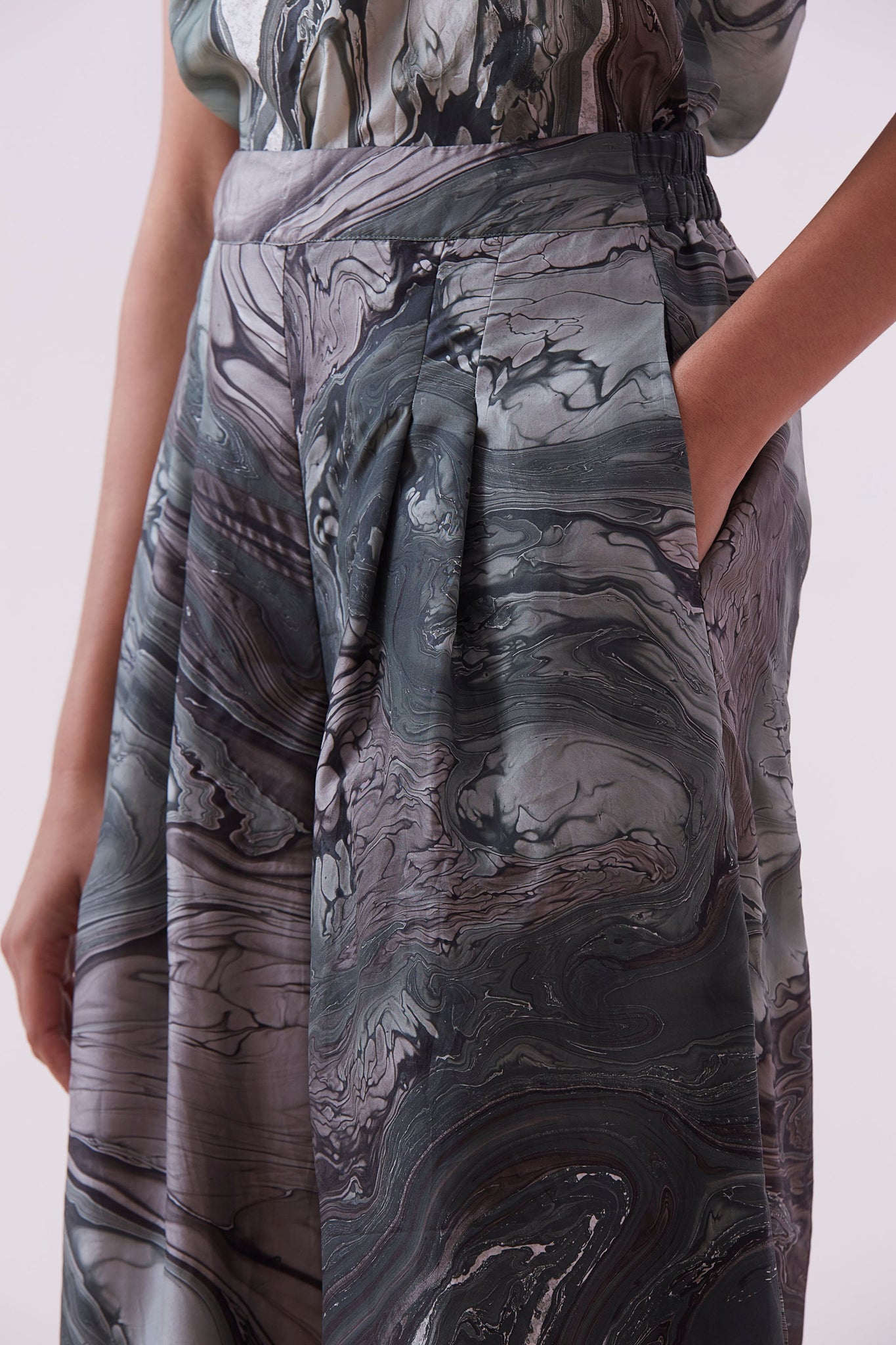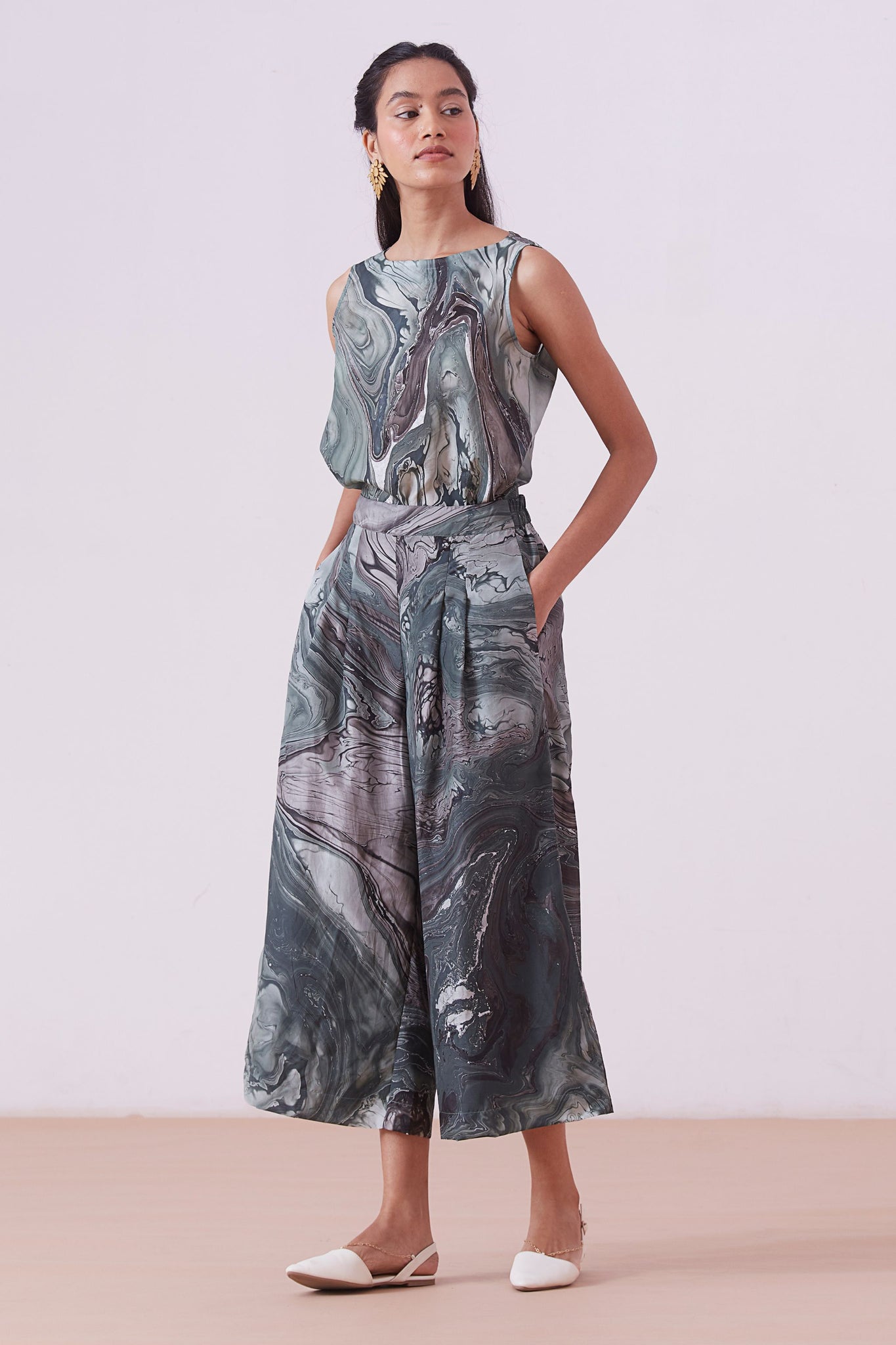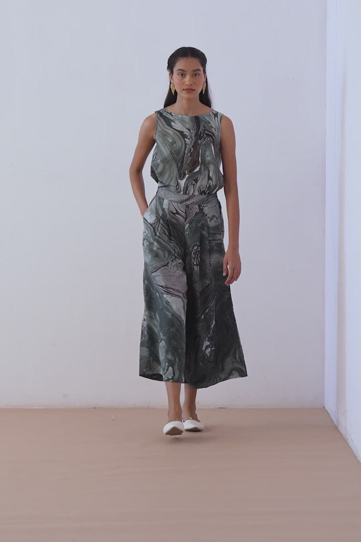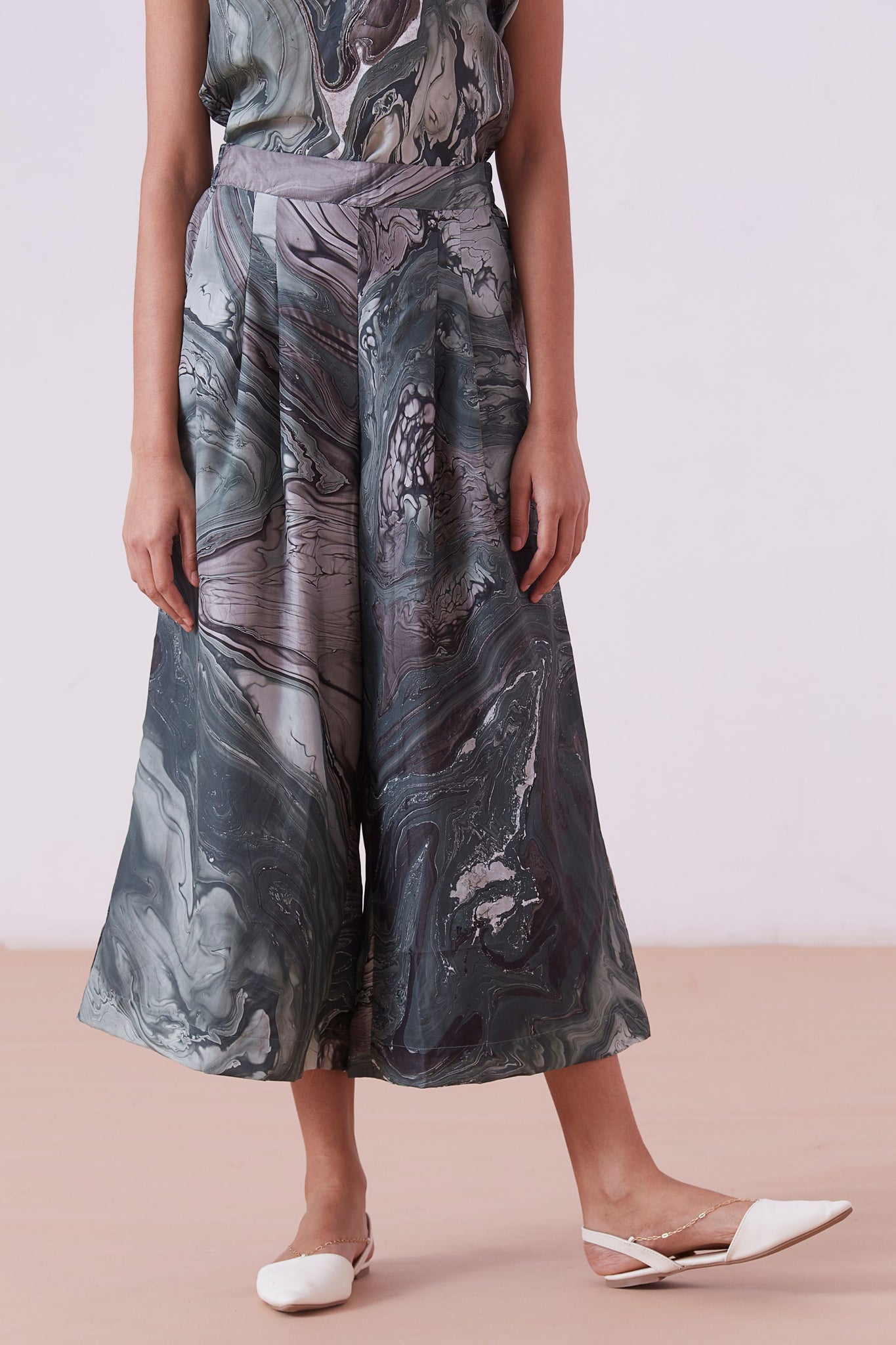 Mid waist wide leg pants. Twin pleats in the front. Fitted waistband with single button and zip on the side. In-seam pockets.