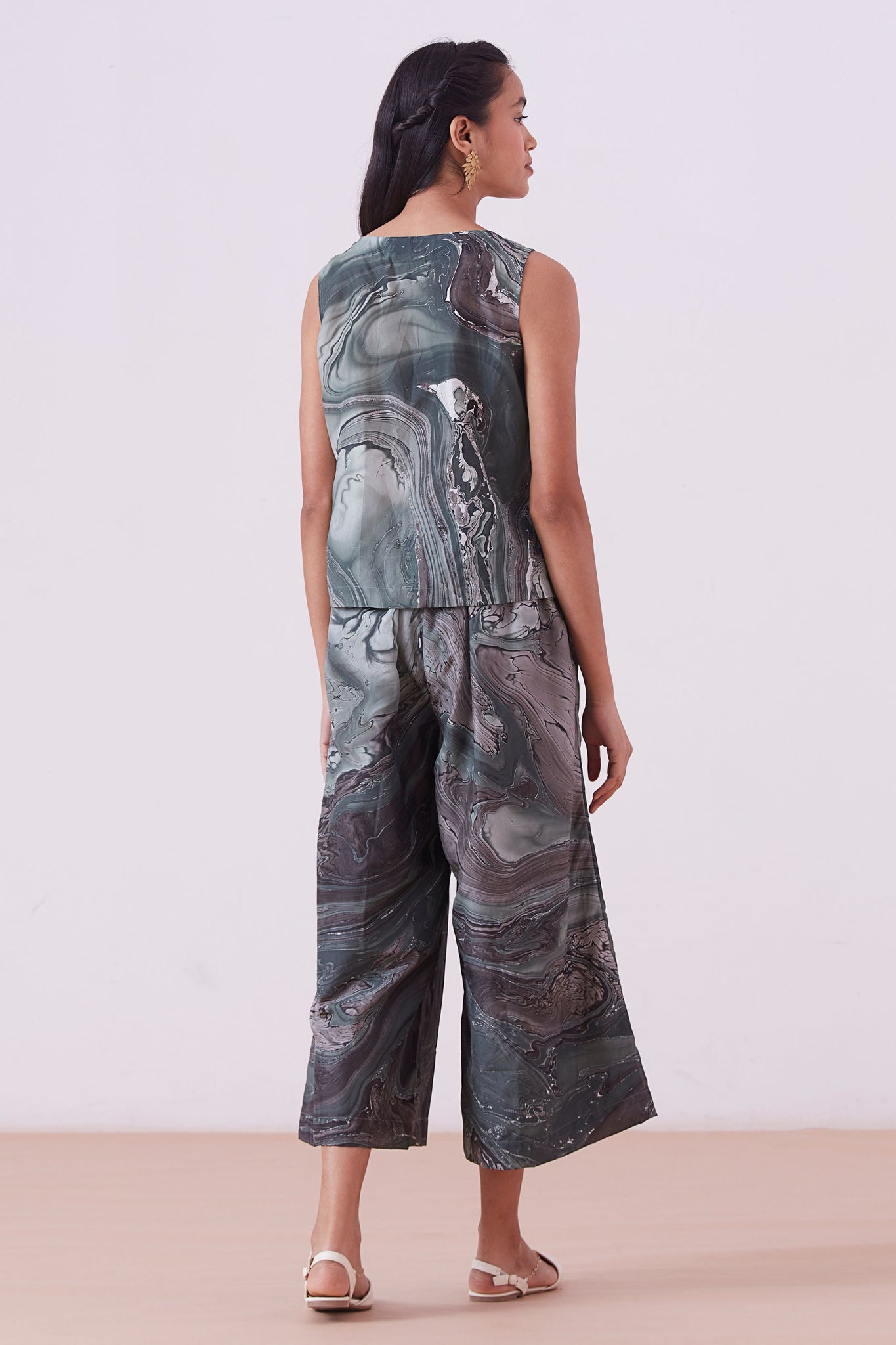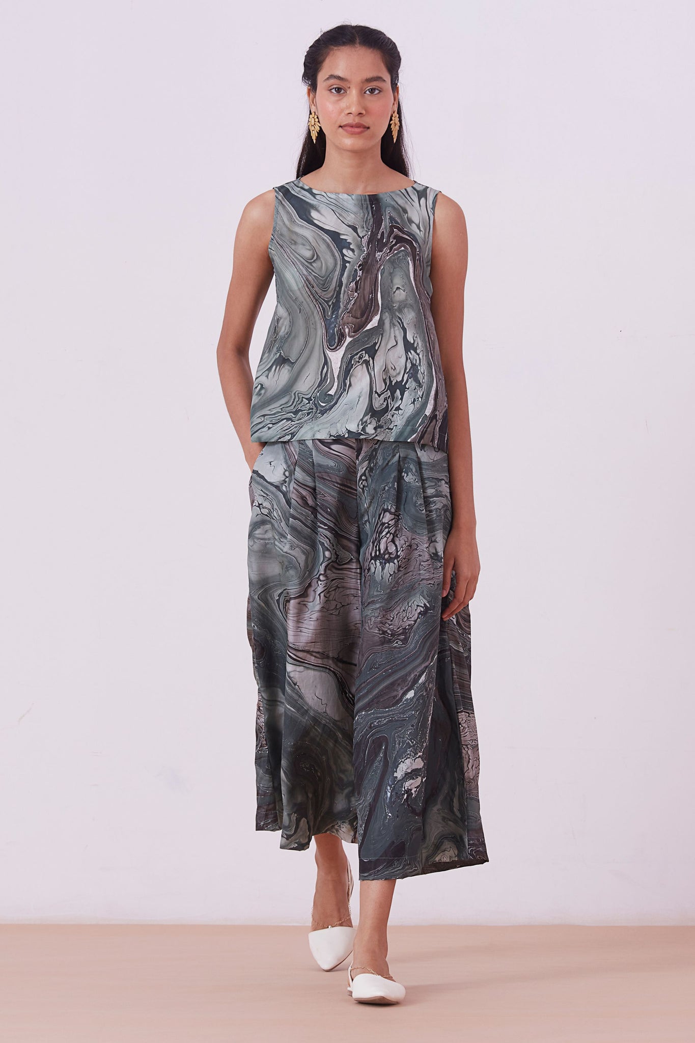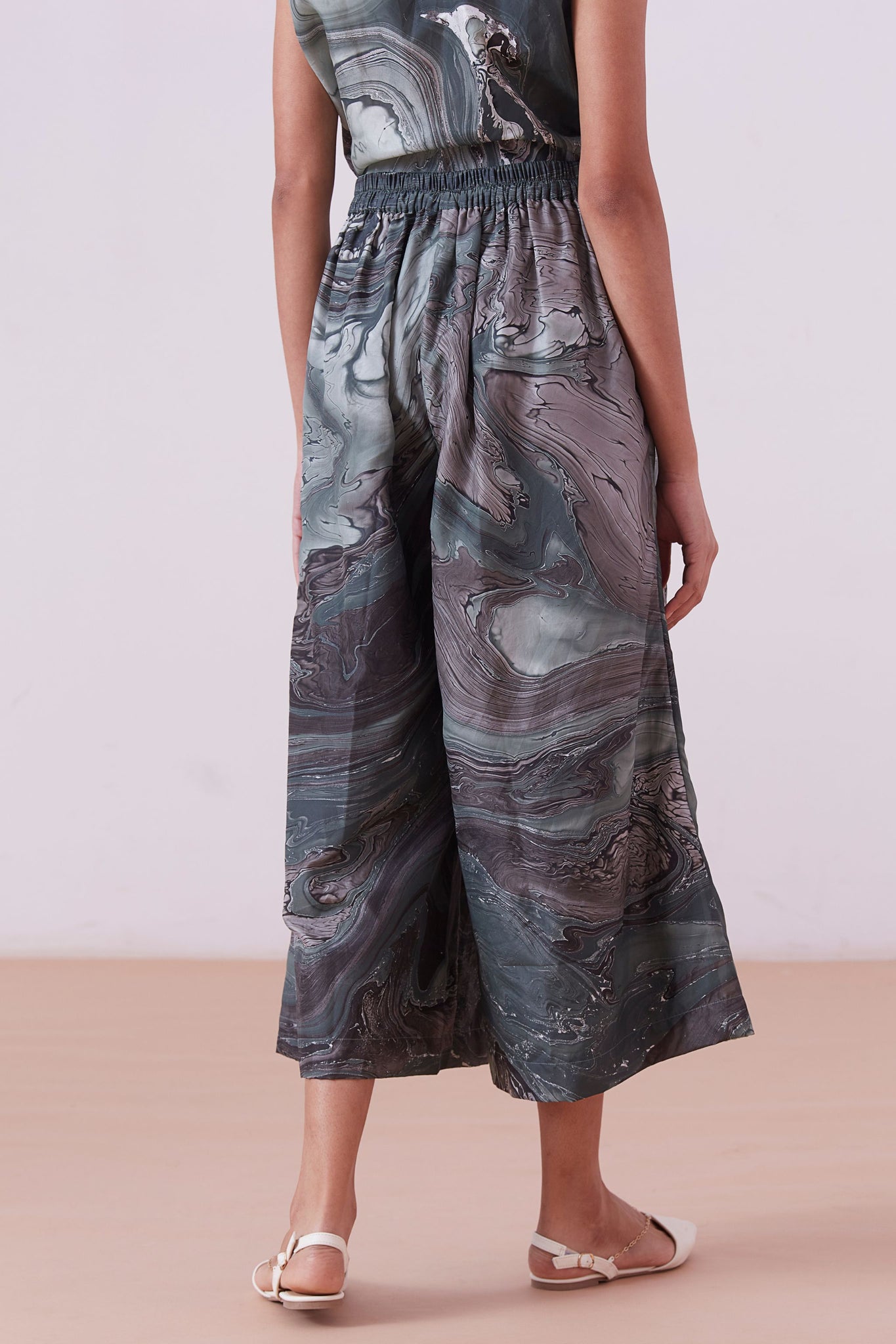 Mid waist wide leg pants. Twin pleats in the front. Fitted waistband with single button and zip on the side. In-seam pockets.