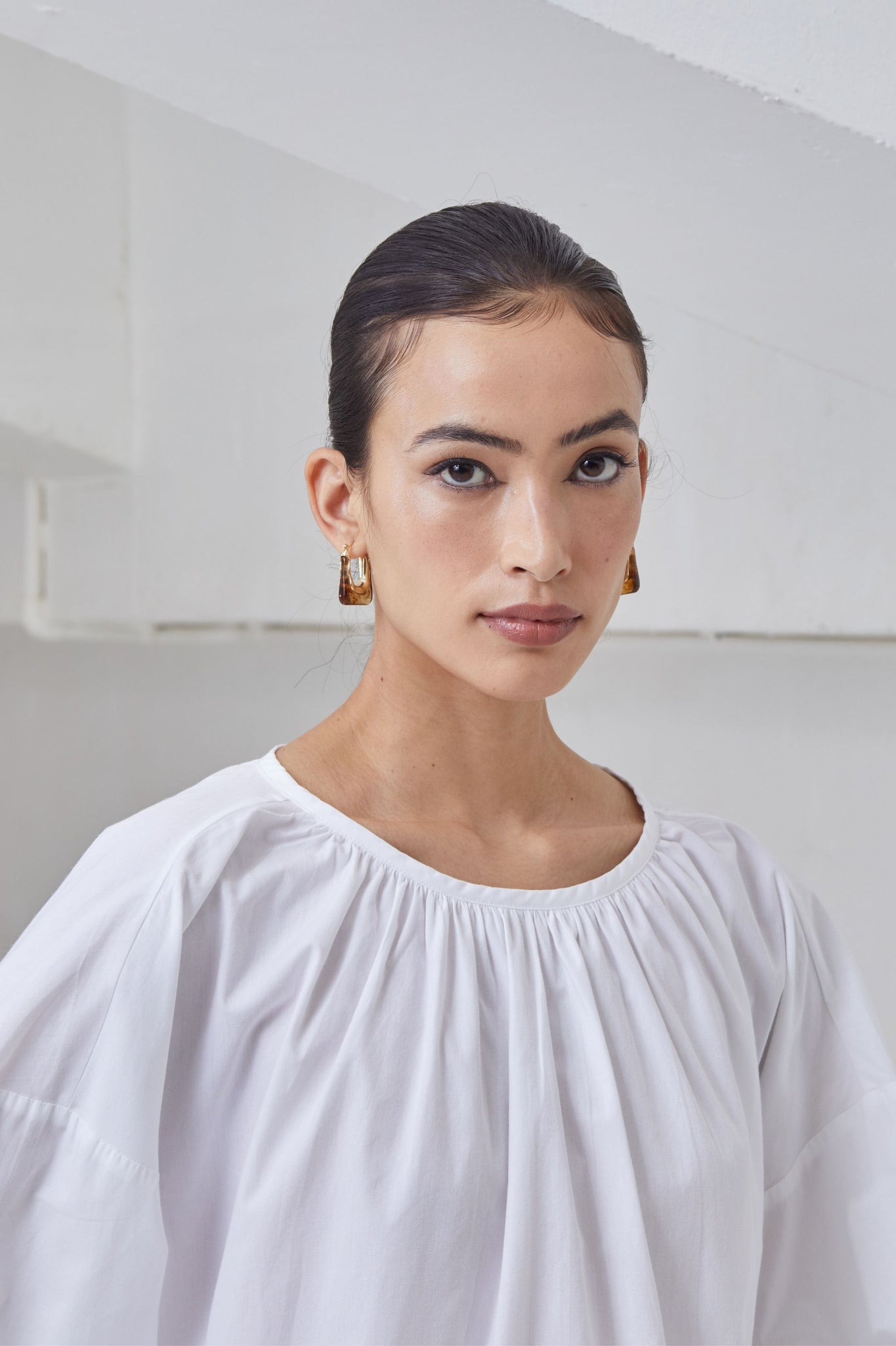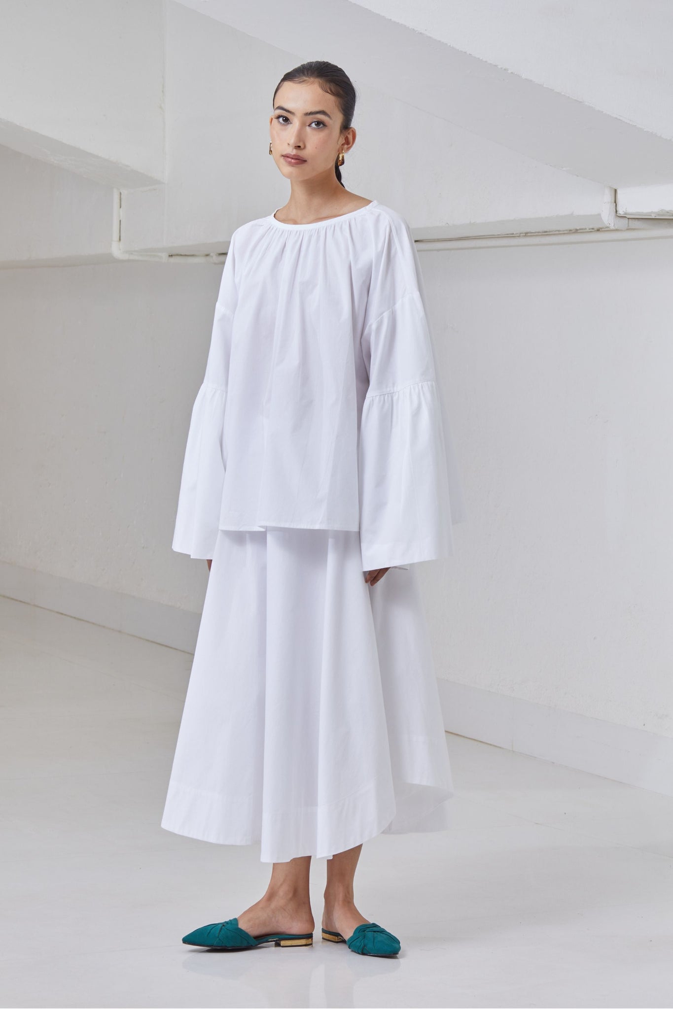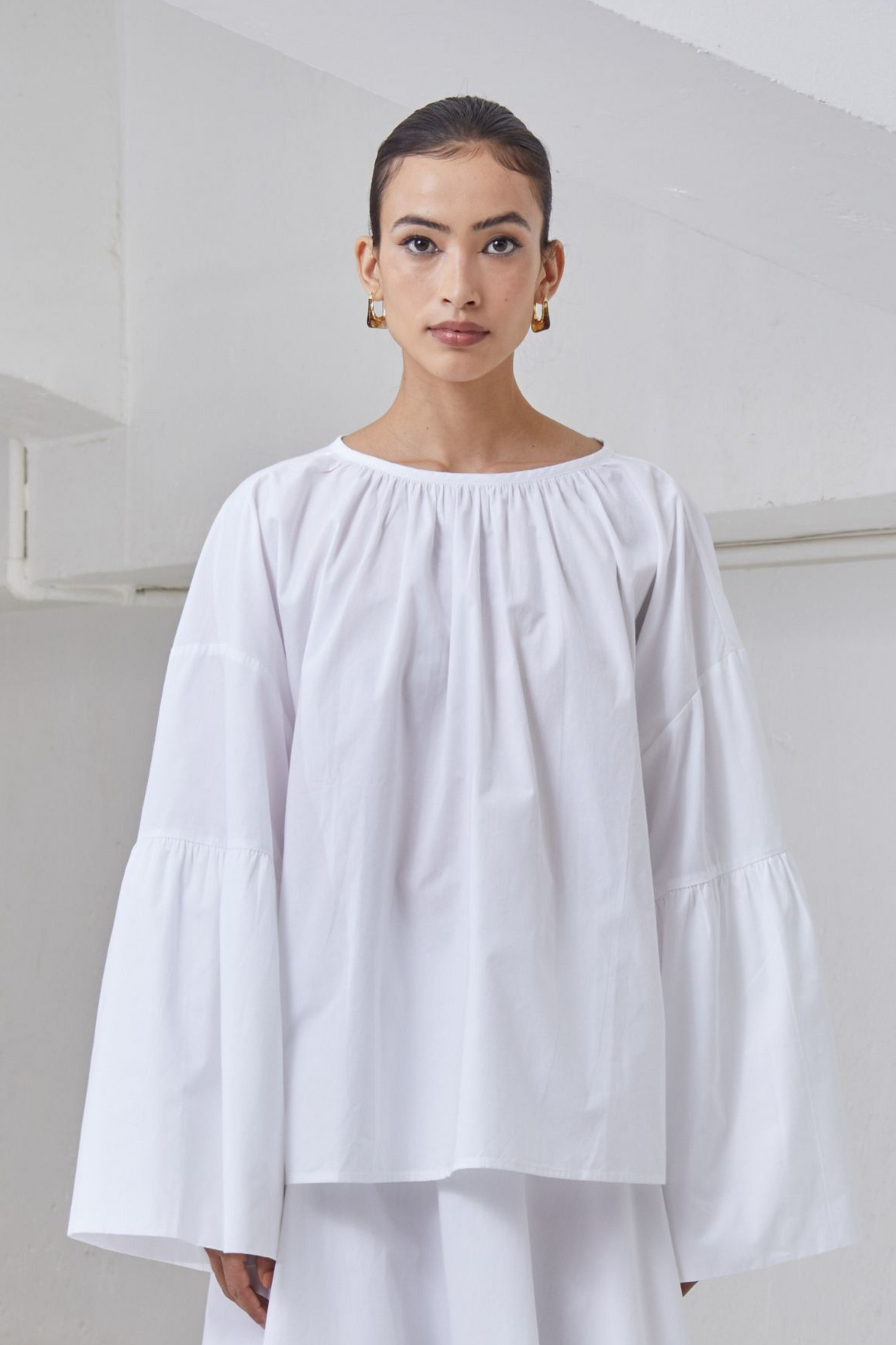 A-line top in crisp organic cotton. Gentle gathers at the neck. Drop shoulder with flare sleeve. Rouleau button fastening at the back.
