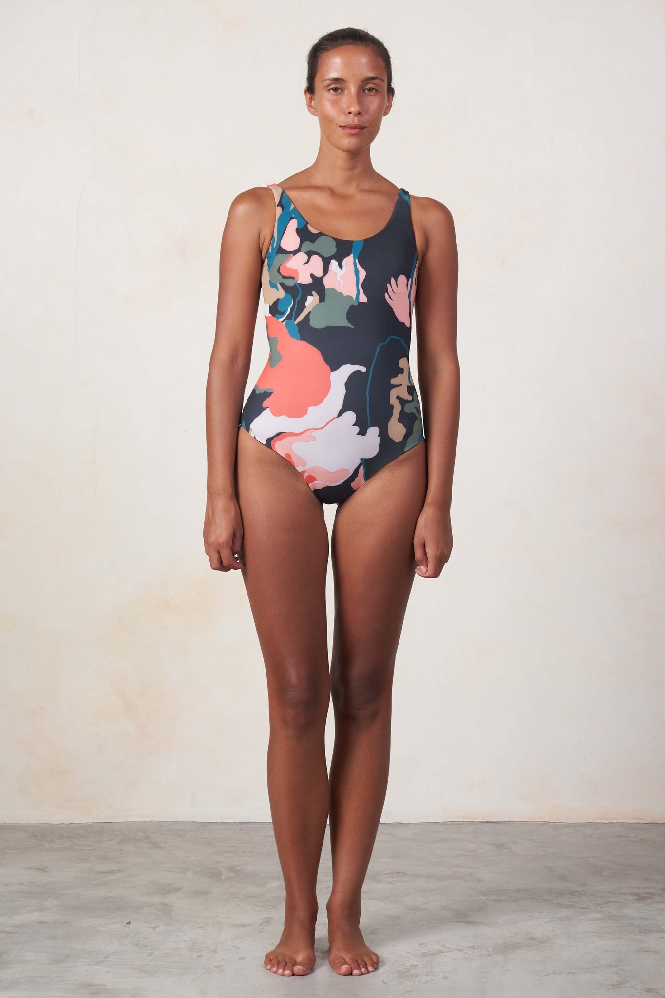 Scoop neck swimsuit with a twisted back detail. Removable padding.