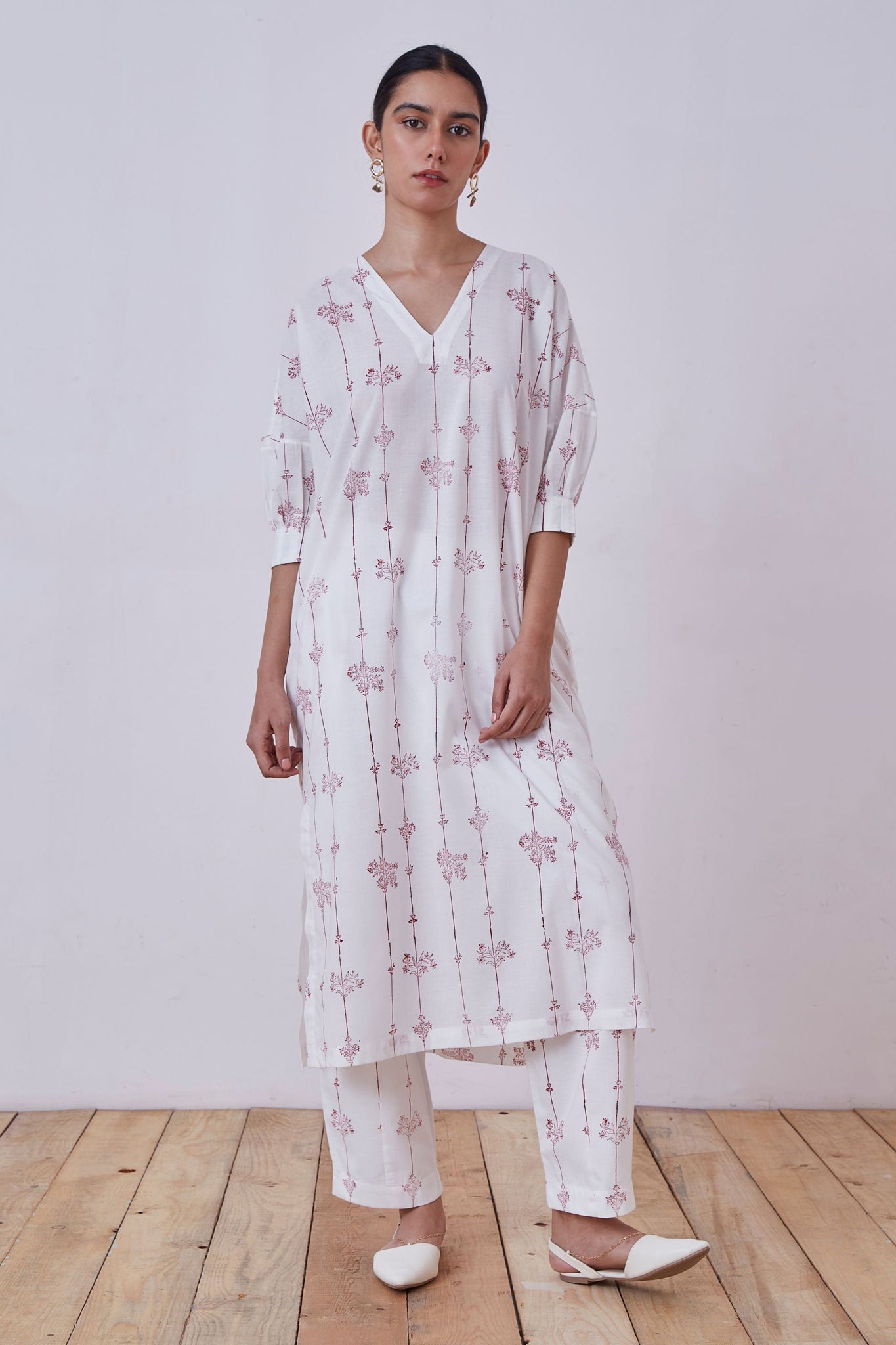 V-neck tunic with drop shoulder. Mid calf length. Side slits for ease of movement.