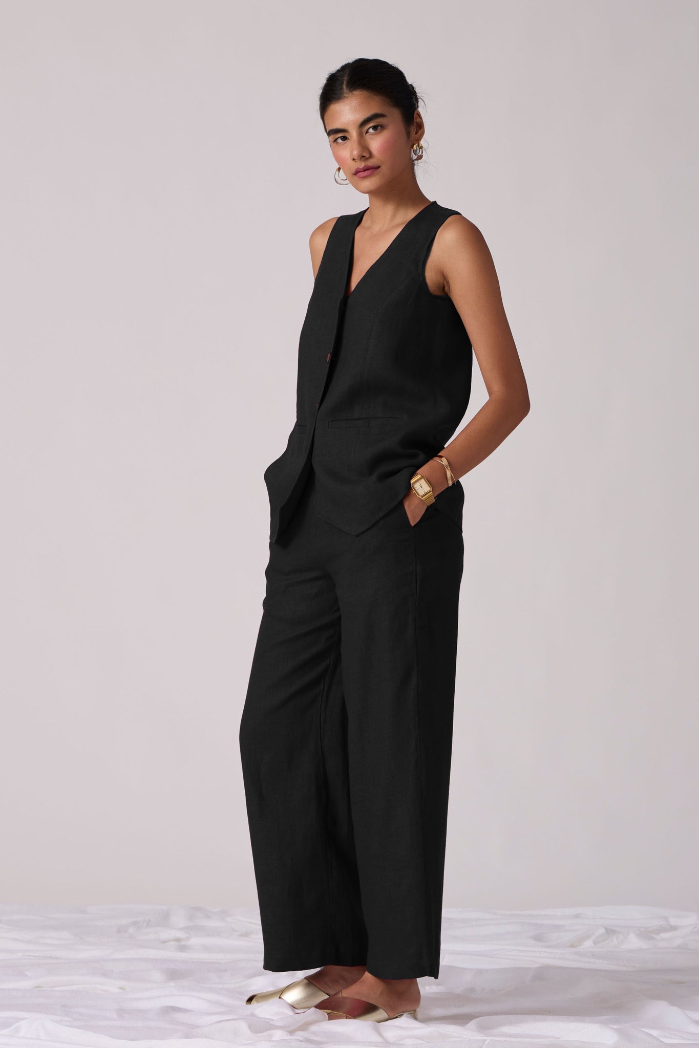 Sophisticated V-neck waistcoat crafted from linen cotton. Front button fastening. Welt pockets in the front. Back slit for easy fit on the hips. Recommended pairing with matching pants or your favourite denim.