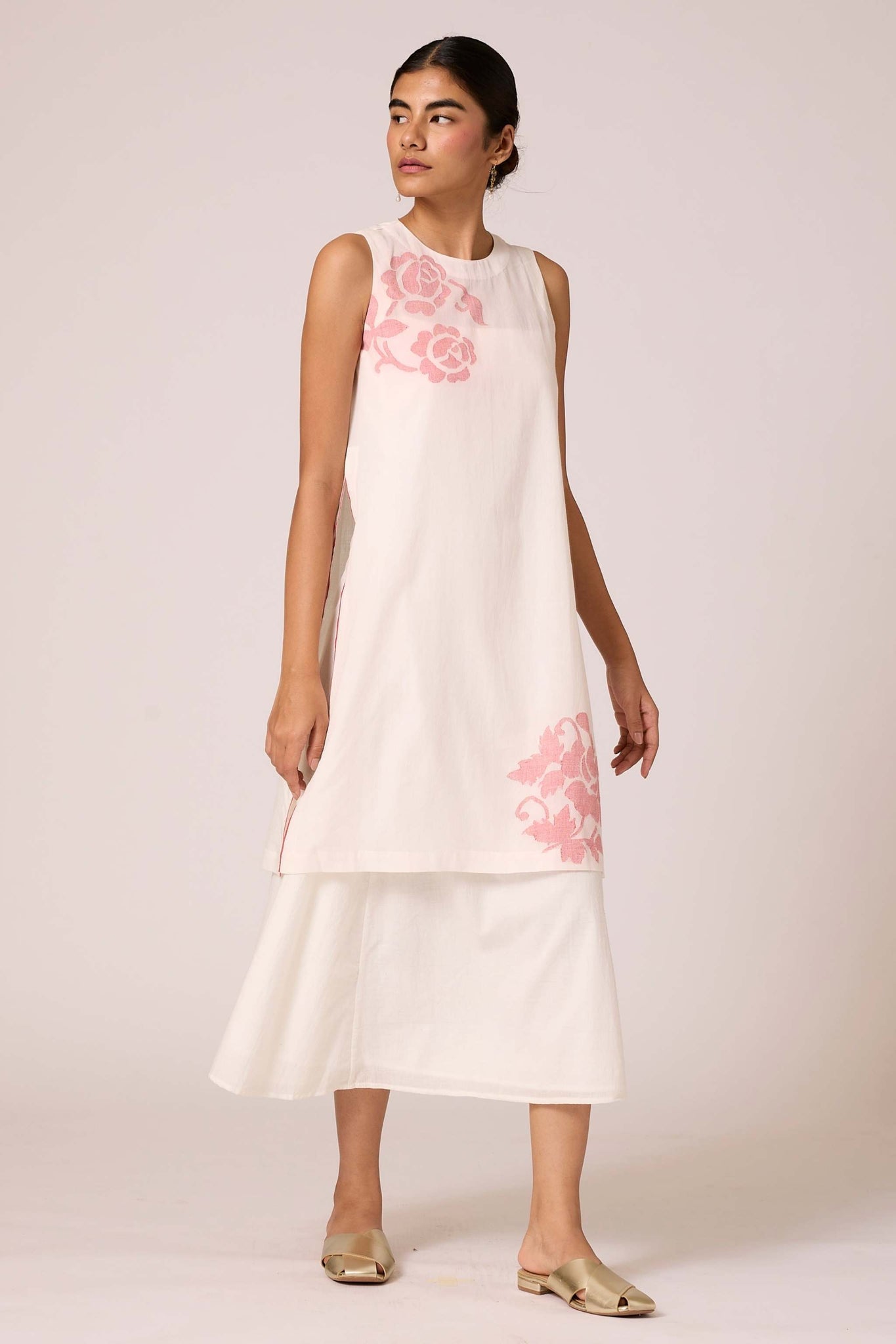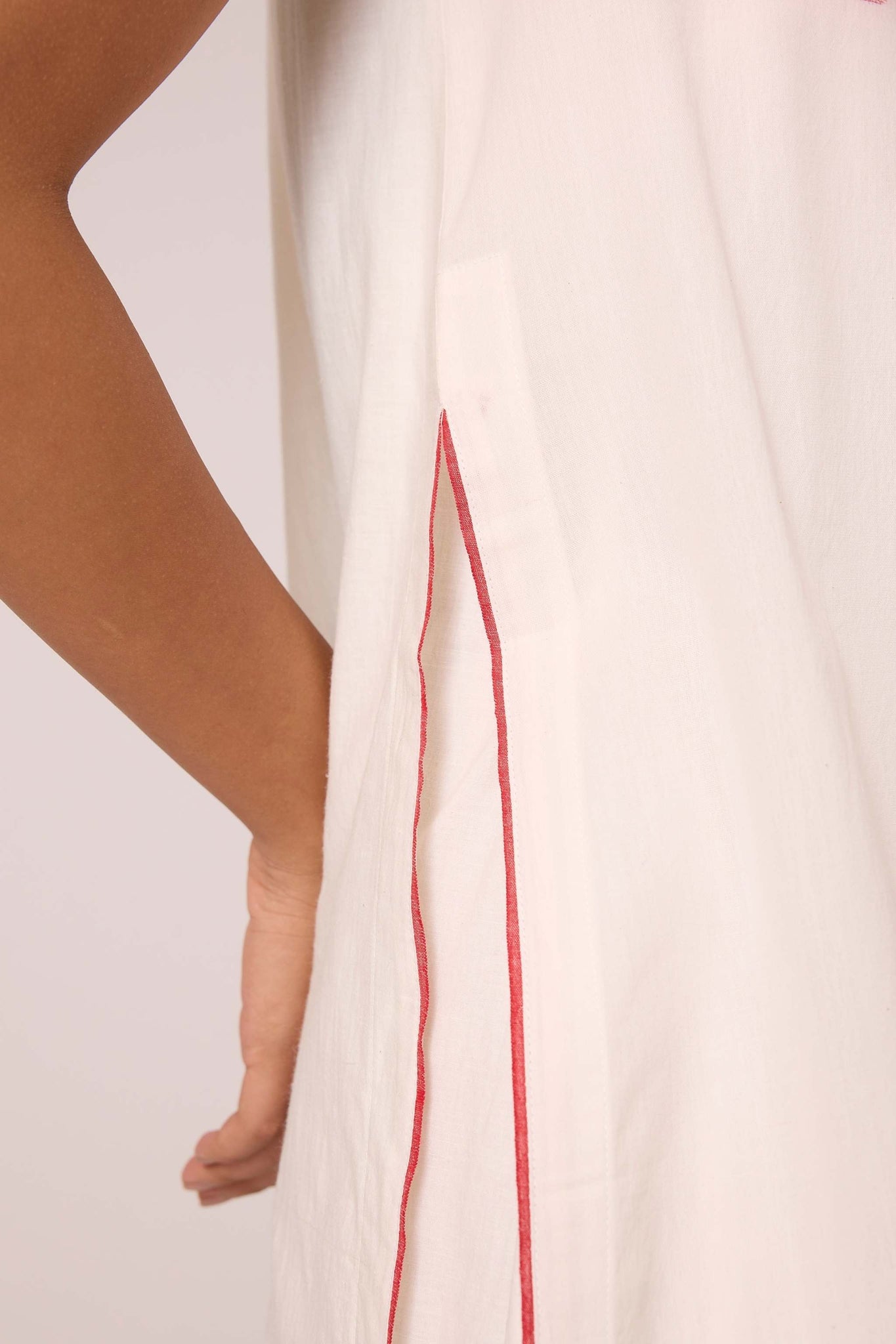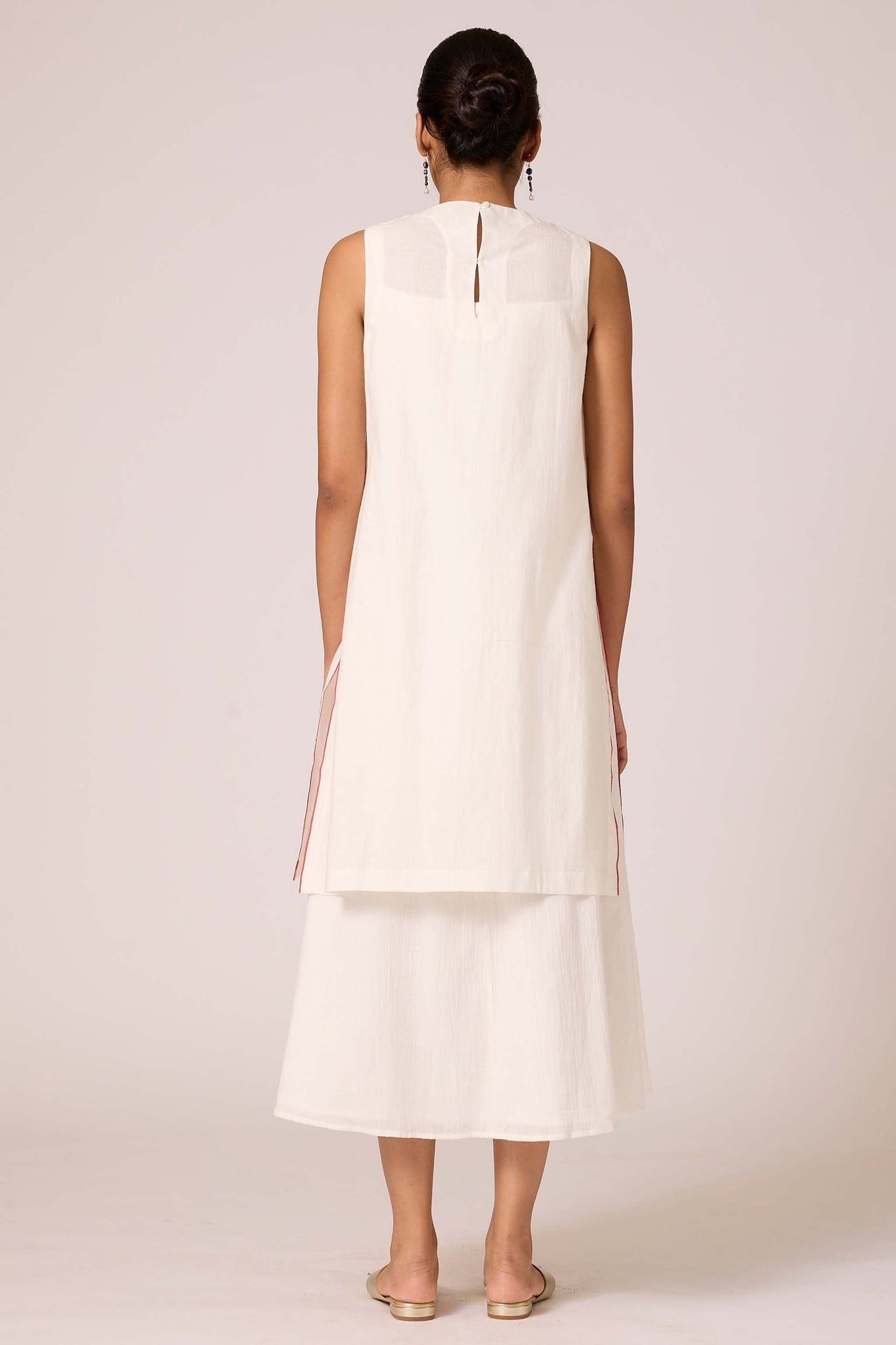 Sleeveless overlay in handwoven Jamdani fabric. Closed round neck. High side slits featuring selvage detail. Loop button fastening at the back. An effortless blend of style and elegance.