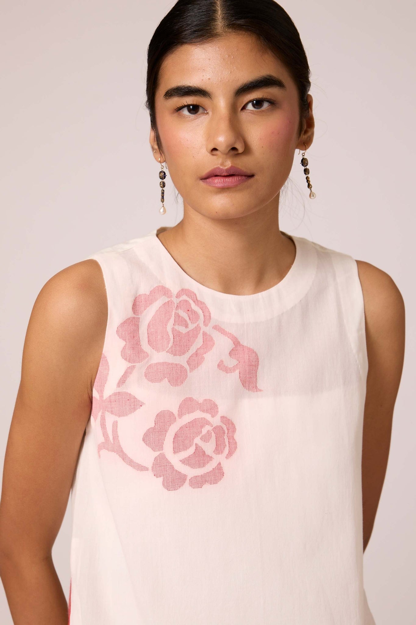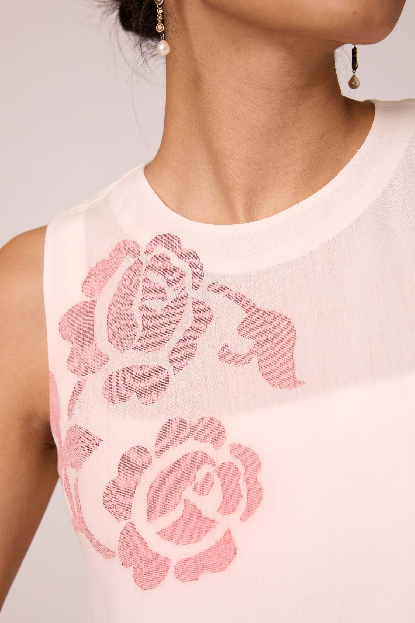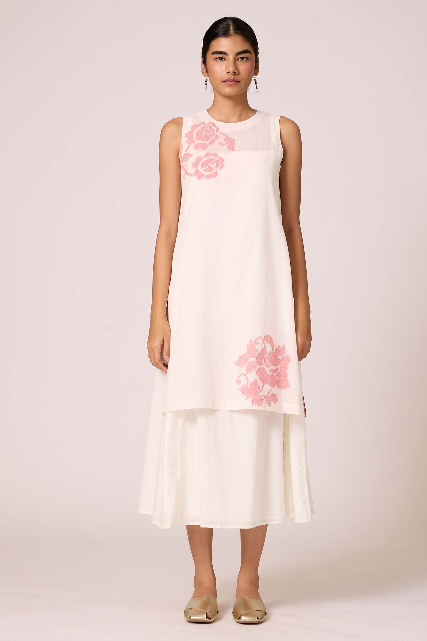 Sleeveless overlay in handwoven Jamdani fabric. Closed round neck. High side slits featuring selvage detail. Loop button fastening at the back. An effortless blend of style and elegance.